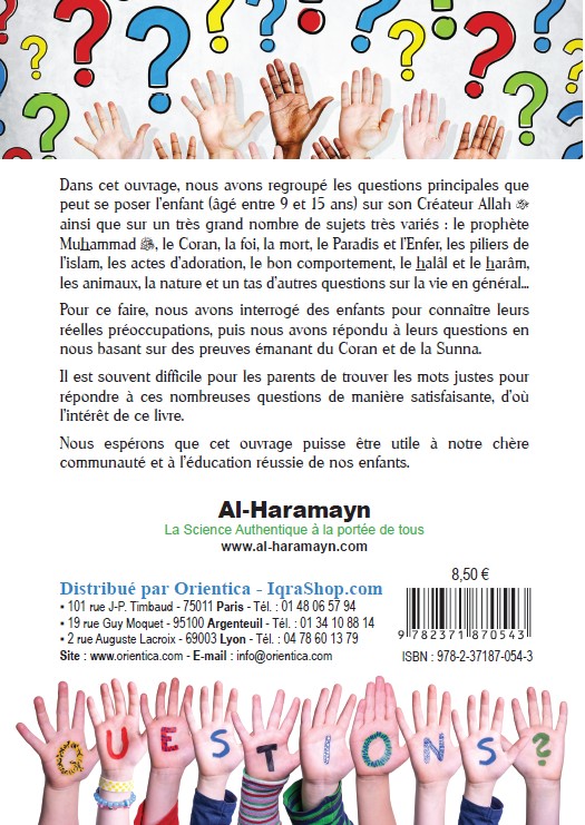Dans cet ouvrage, nous avons regroupé les questions principales que peut se poser l’enfant (âgé entre 5 et 8 ans) sur son Créateur Allah ainsi que sur un très grand nombre de sujets très variés : le prophète Muhammad (SAW), le Coran, la foi, la mort, le Paradis et l’Enfer, les piliers de l’islam, les actes d’adoration, le bon comportement, le halâl et le harâm, les animaux, la nature et un tas d’autres questions sur la vie en général...