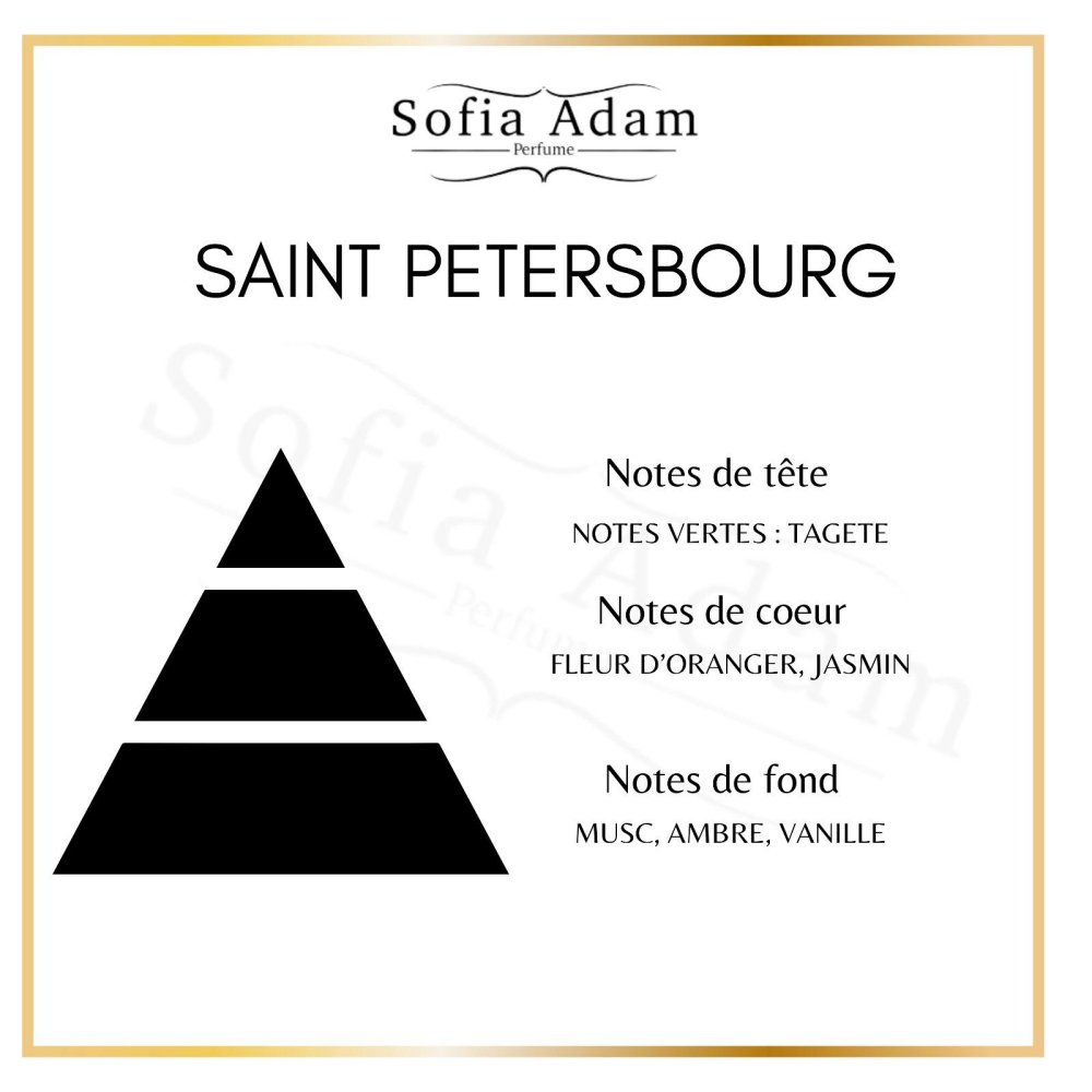 En note de tête, le jasmin d’Egypte vient appuyer délicatement les facettes poudrées et gourmandes de l’amande amère du Maroc. L’eau de parfum SAINT PETERSBOURG est construit autour de l’ambre gris qui s’adoucit au contact d’un accord boisé et musqué.