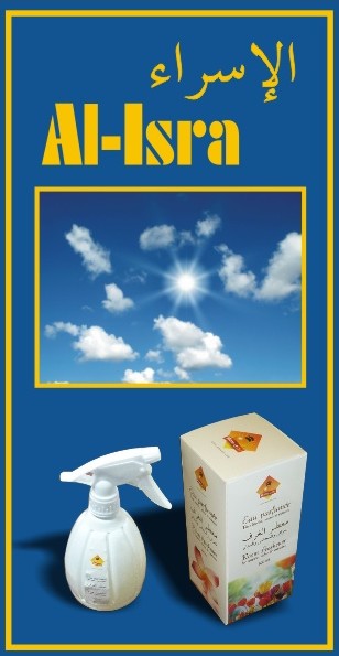 Eau parfumée désodorisante Musc d'Or "Al-Isra" - Pour literies, salons, rideaux, vêtements, voitures, etc. Fini les mauvaises odeurs. Bien agiter avant utilisation.