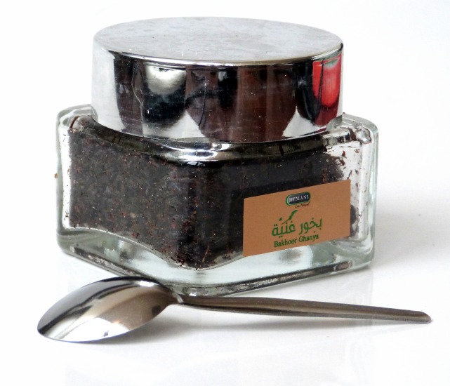 Bakhour (encens) "Ghanya" pour parfumer son intérieur aux senteurs orientales, présenté dans un emballage joliment décoré et fourni avec une cuillère de dosage.