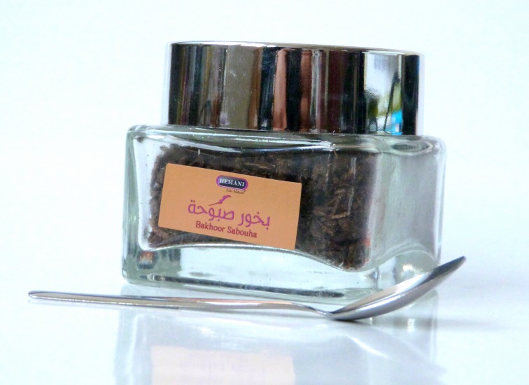Bakhour (encens) "Sabouha" pour parfumer son intérieur aux senteurs orientales, présenté dans un emballage joliment décoré et fourni avec une cuillère de dosage.