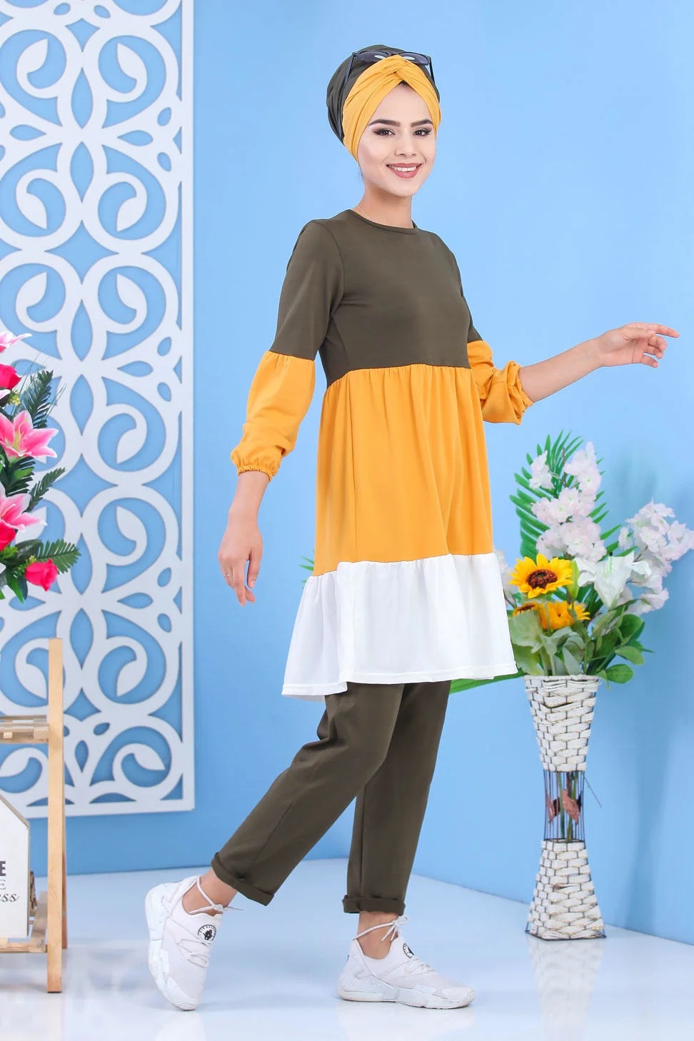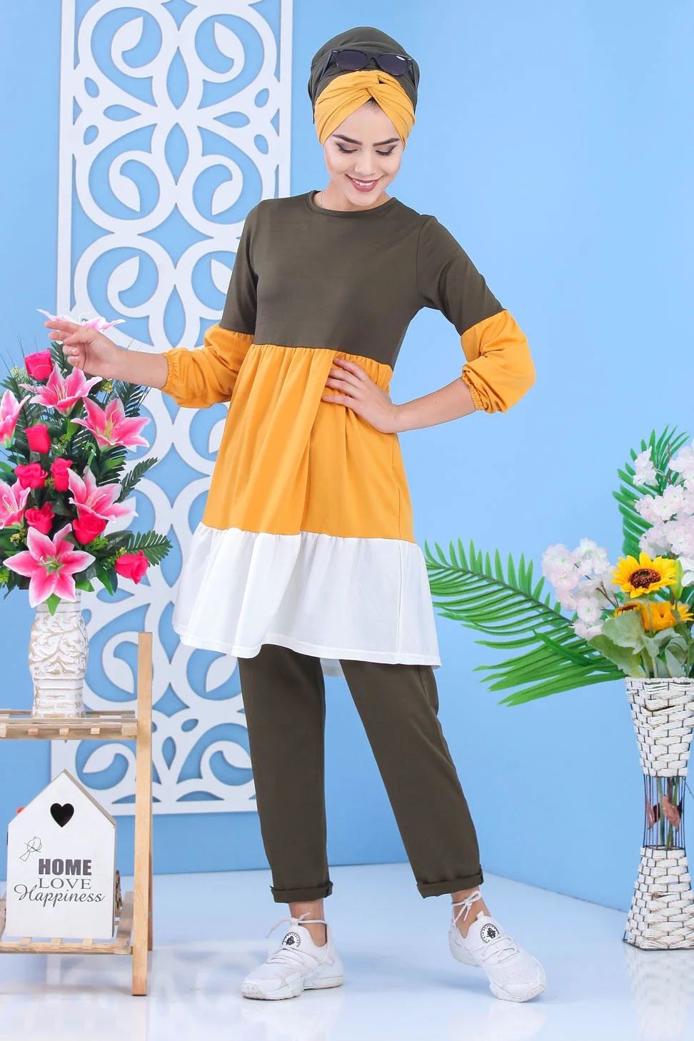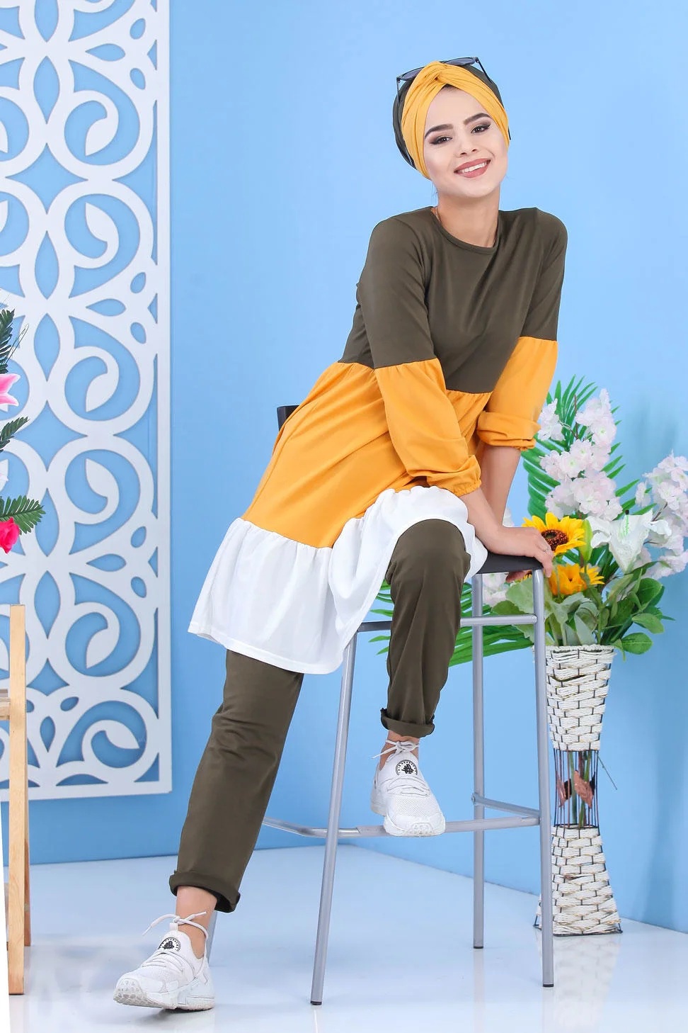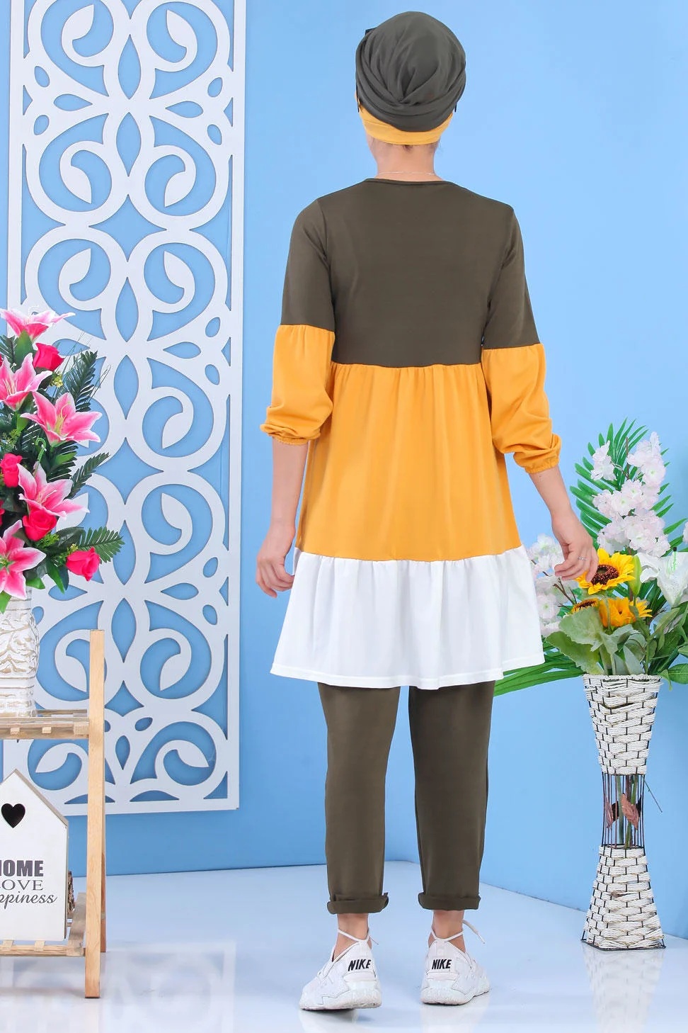 Ensemble 2 pieces Tunique + Pantalon de couleur kaki/jaune moutarde/blanc - Tenue decontractee ample pour femme