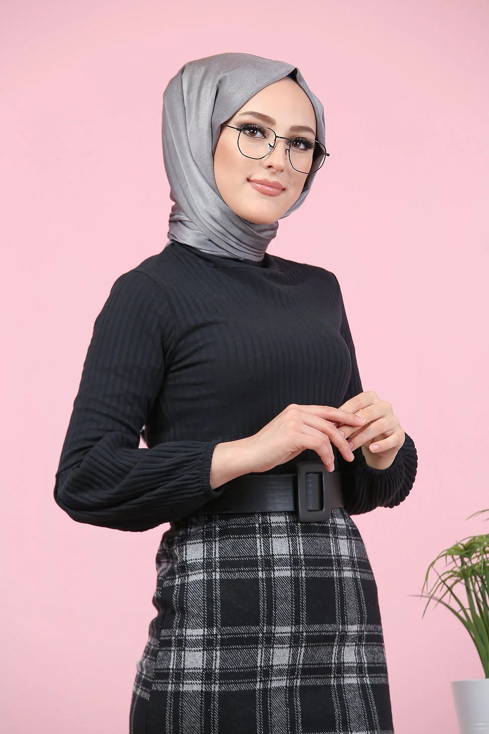 Ensemble deux pièces composé d'un haut côtelé légèrement cintré avec manches bouffantes et d'une jupe droite taille élastique(fourni sans ceinture).