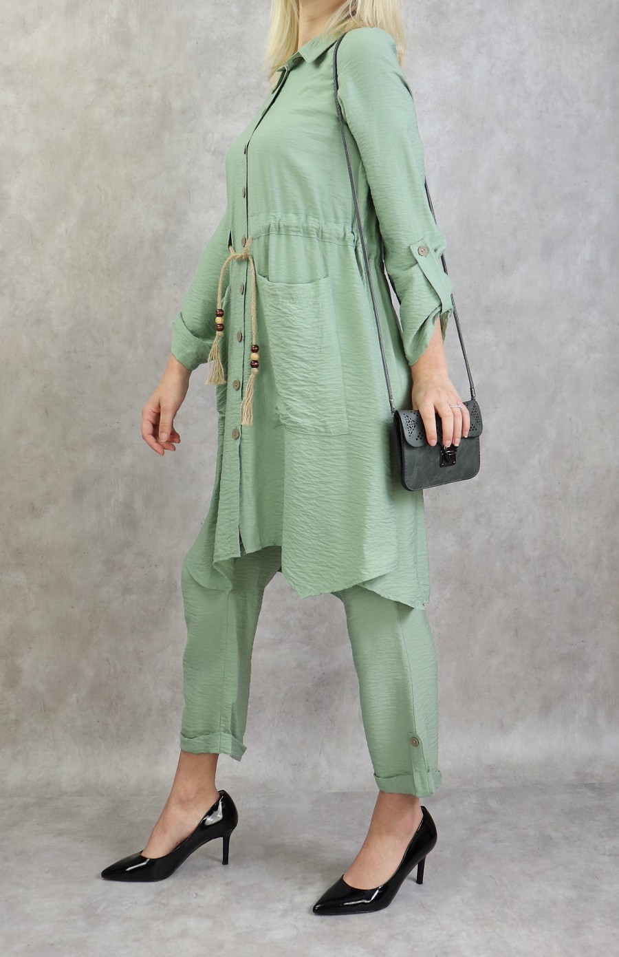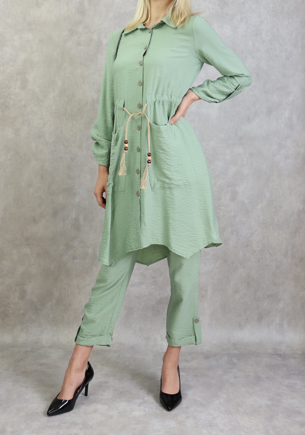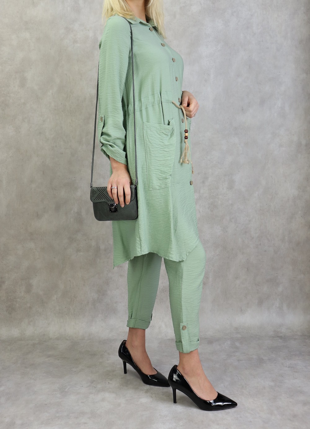 Ensemble femme 2 pièces (tunique et pantalon) avec nœuds sur les côtes - Couleur Vert kaki - REF. 31749 (38.00 €)