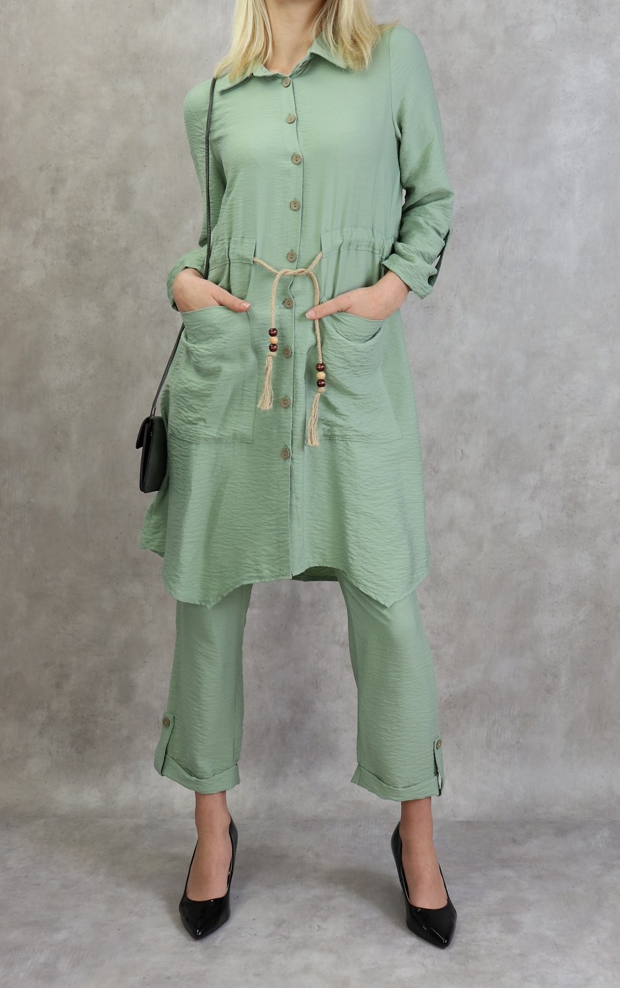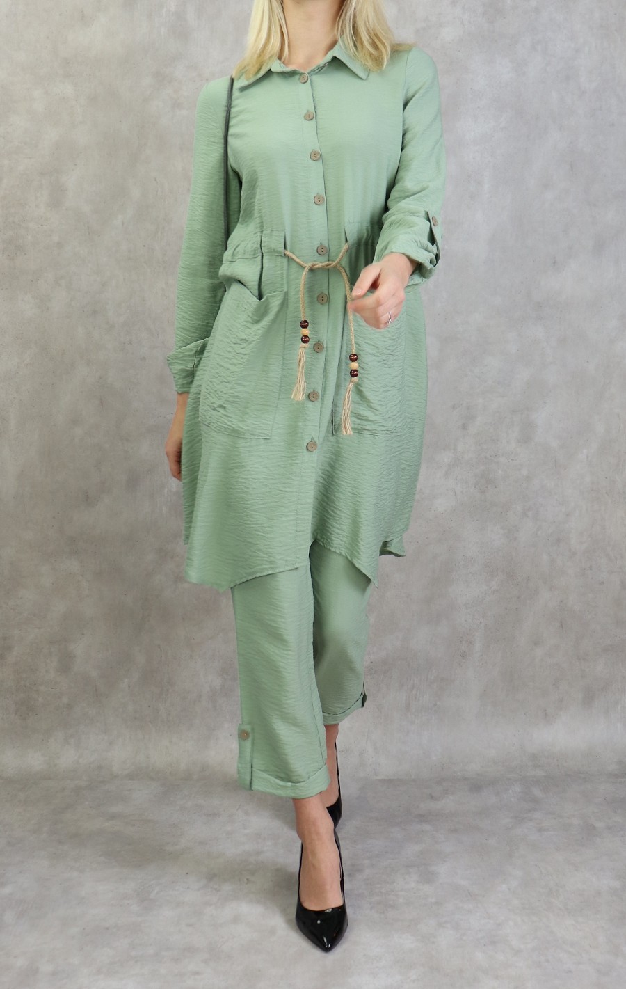Tunique : mi longue, col chemise, manches ajustables, lien de serrage à la taille, grandes poches.