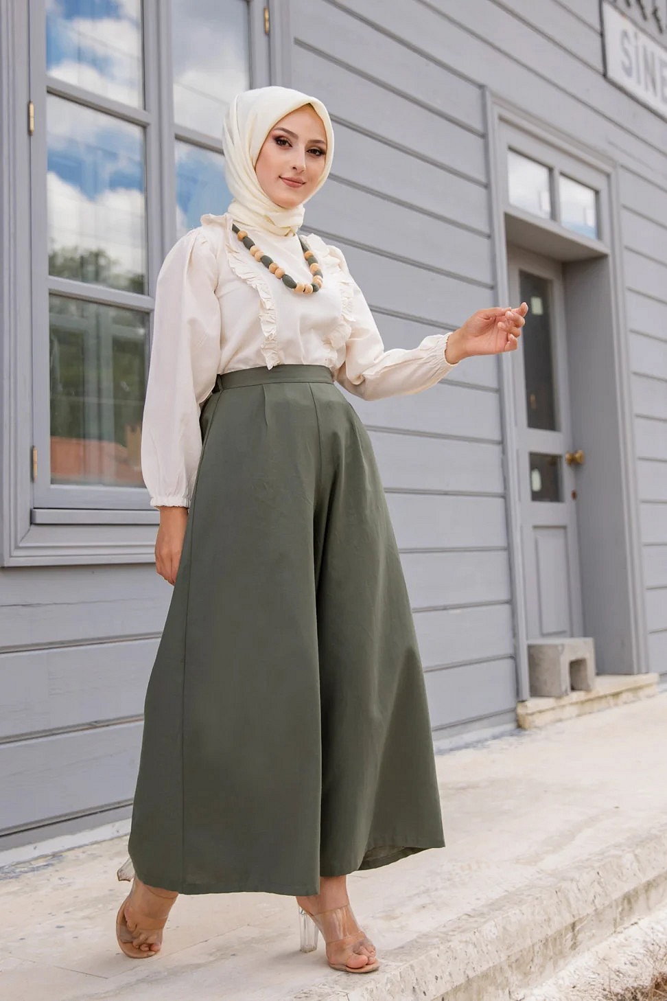 Ce pantalon large avec un style entre palazzo et jupe-culottes convient à toutes les morphologies et se décline sous différentes couleurs.