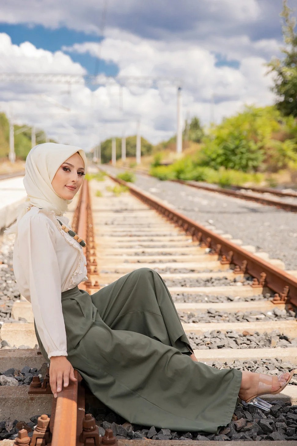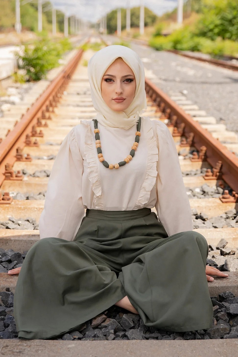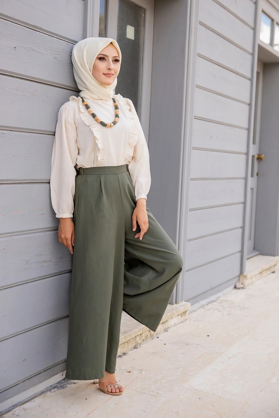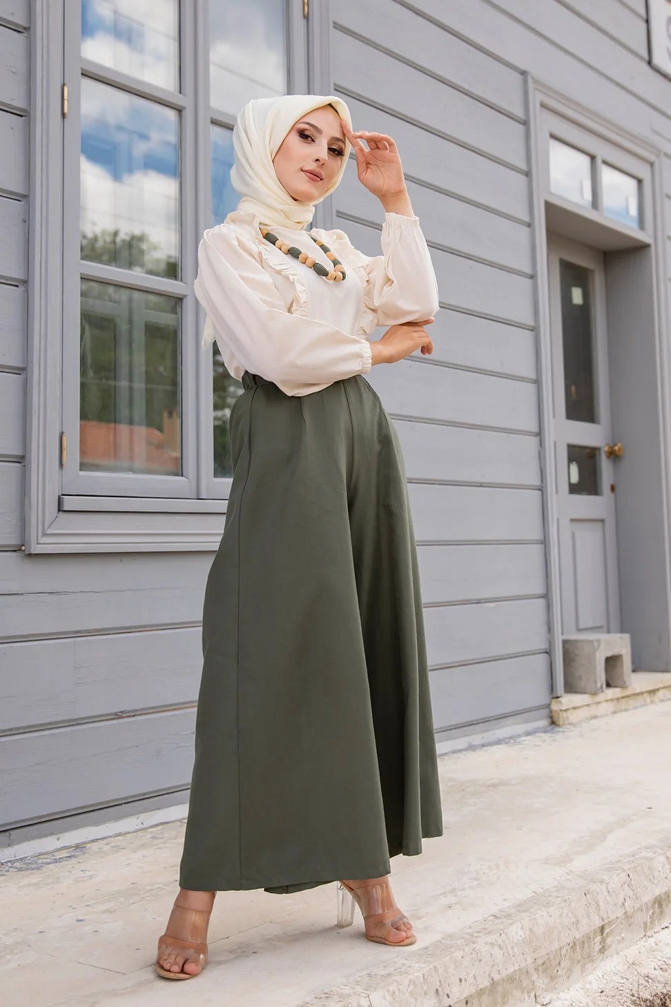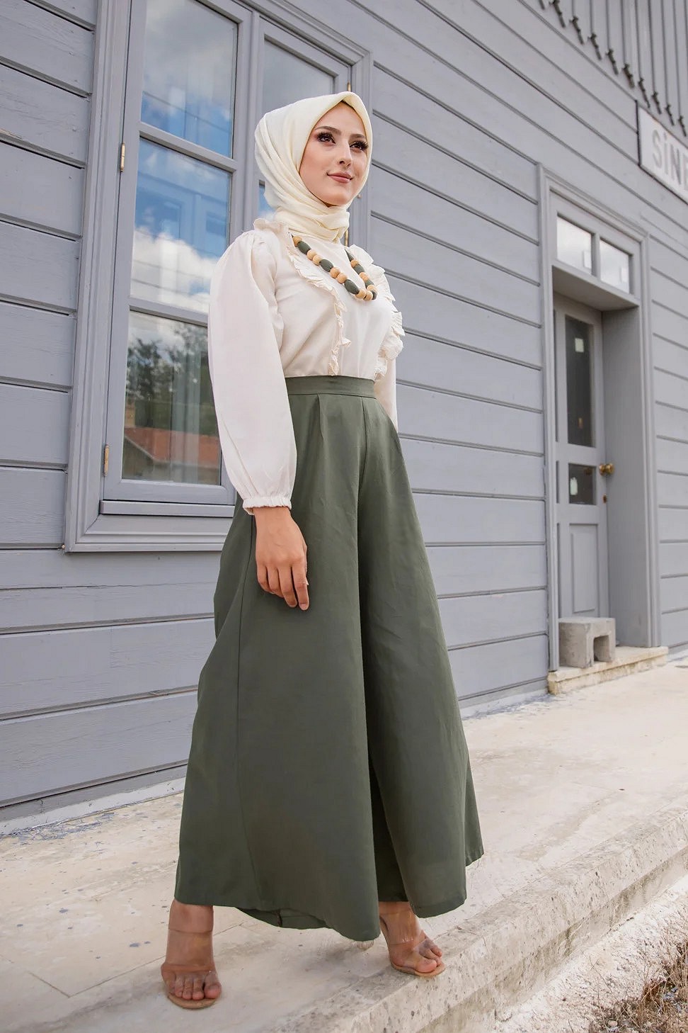 Ce magnifique ensemble casual composé d'un beau pantalon évasé très large. Et parfait pour allonger votre taille. Élégant, taille élastique. Blouse à froufrou, col rond avec un joli collier offert, manches longues légèrement bouffantes.