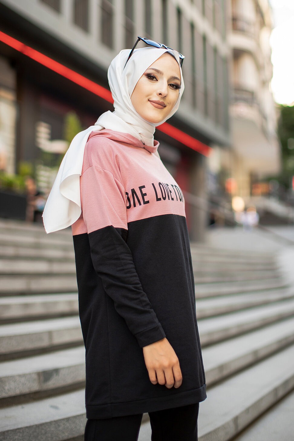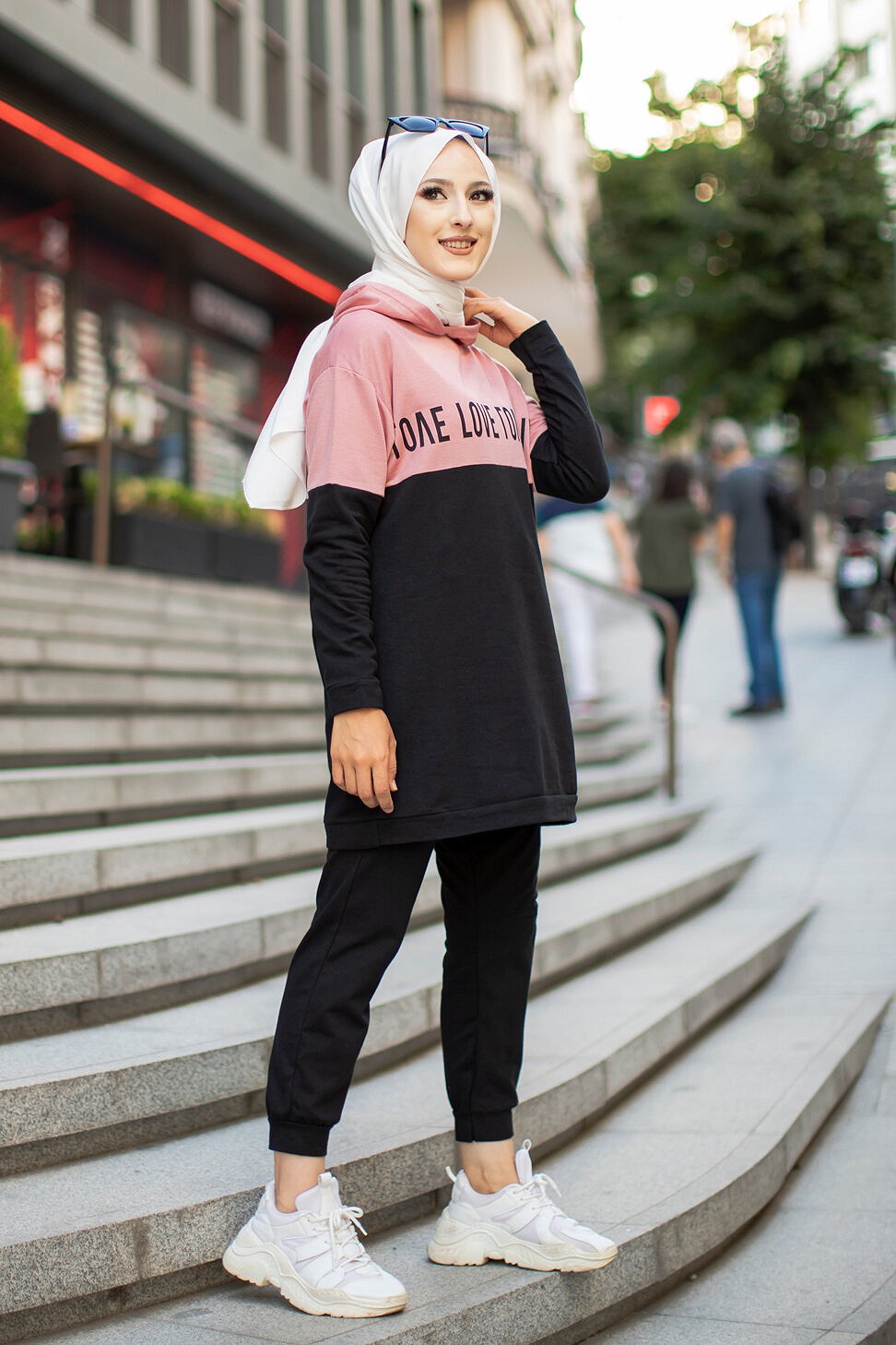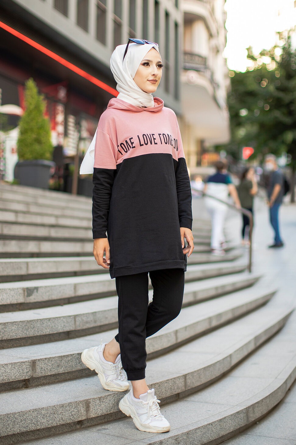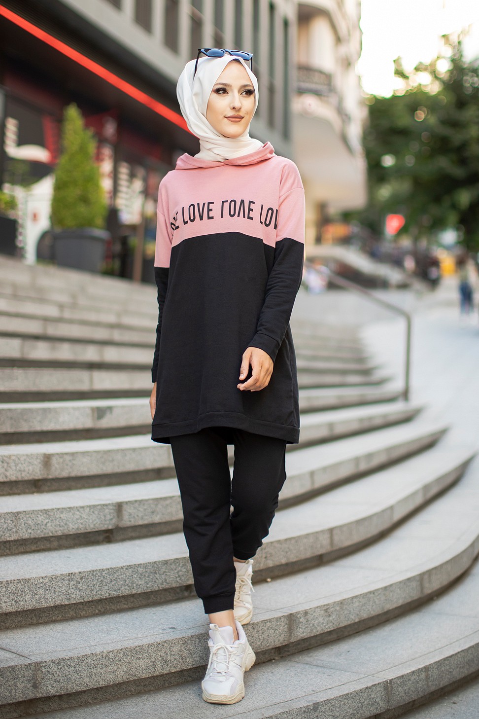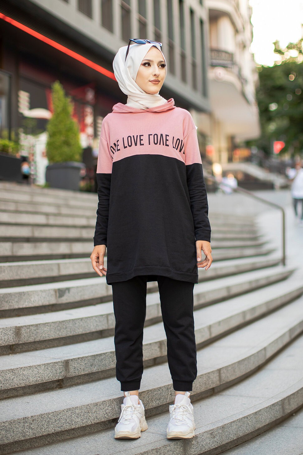 Ensemble Survêtement bi-couleur à capuche pour femme musulmane inscription "Love" - Couleur noir et rose poudré Vetement & Accessoire