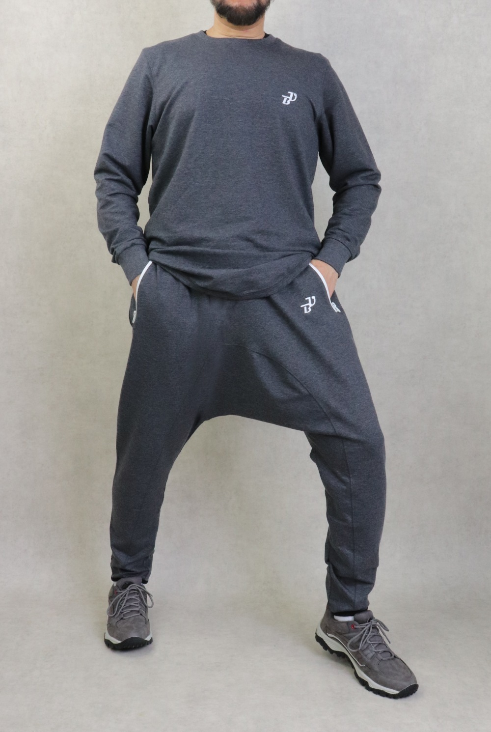 Esemble deux pièces constiuté d'un sweat longline et d'un sarouel large et long couleur gris foncé chiné. Deux poches zippées latérales et une poche arrière zippée de couleur blanche. Tissu jogging léger type coton stretch. Bande noire au niveau des chevilles. Braguette zippée. Brodé logo BU (Best Ummah).