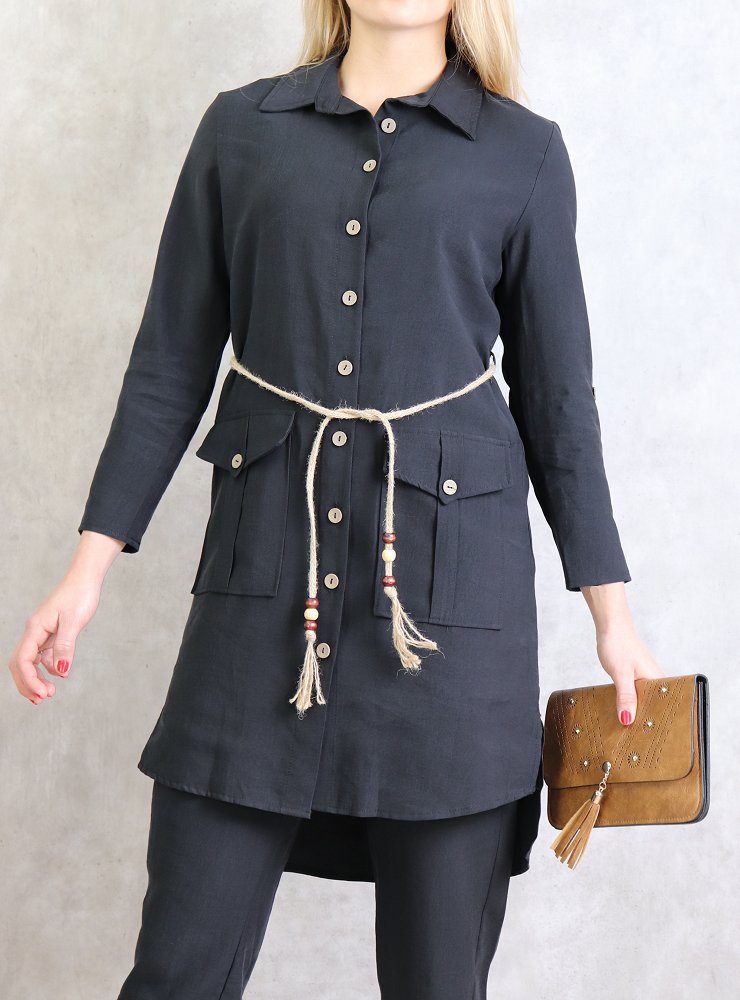 Ensemble 2 pièces. Veste : mi longue, col chemise, fermeture boutons, manches ajustables, ceinture tressée ornée de perles en bois, 2 poches plaquées à rabats. Pantalon : coupe droite, fermeture à glissière, boutons sur le bas. Tissu léger et opaque, effet tissé.