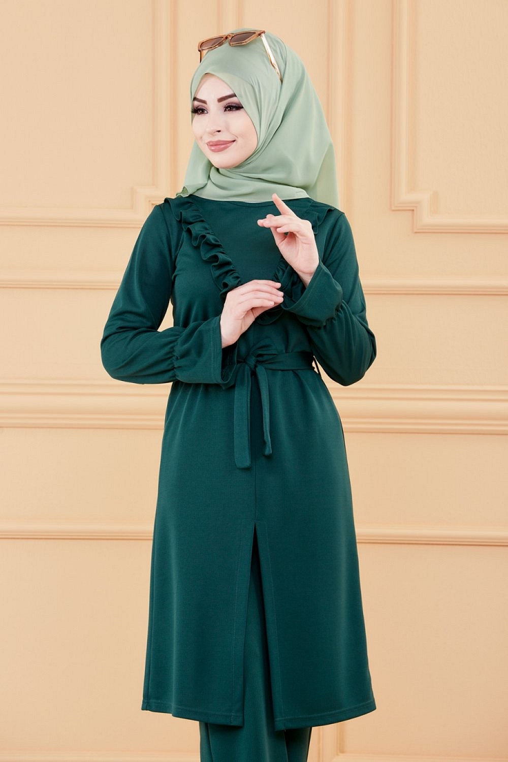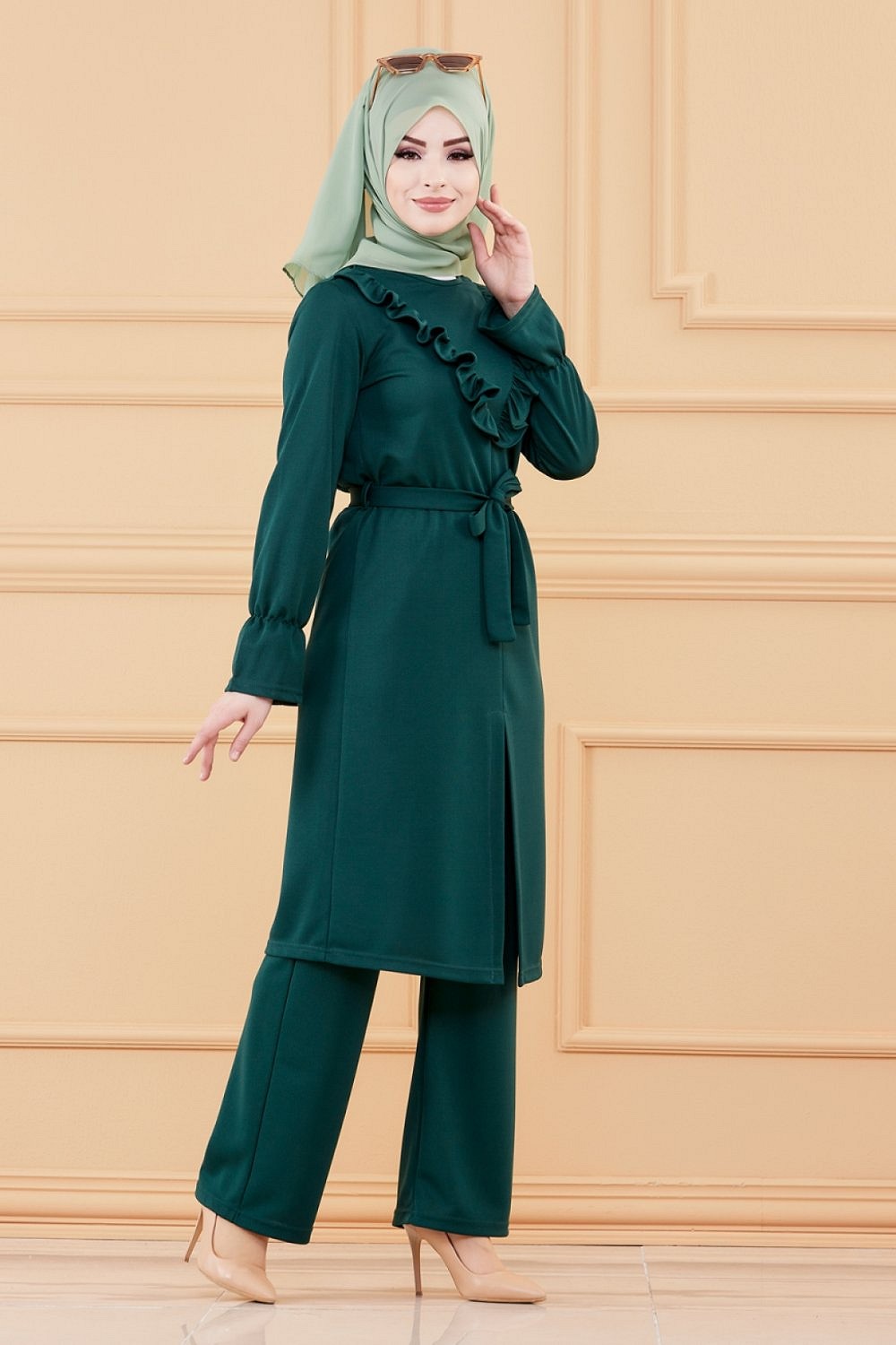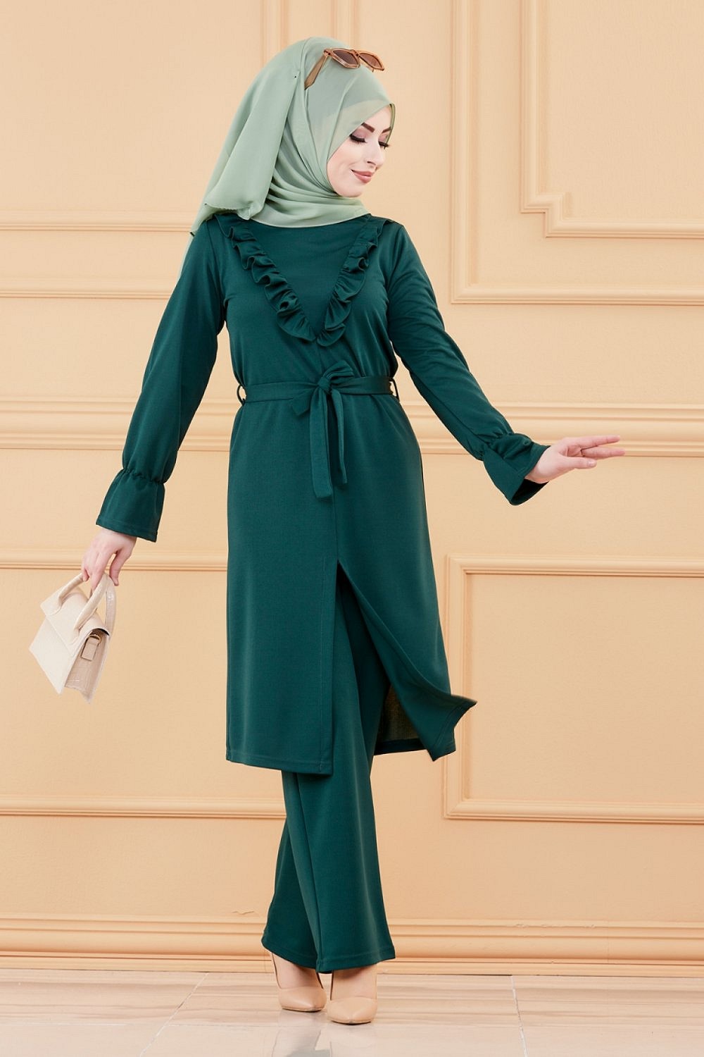 Ensemble classique deux pièces tunique et pantalon (Tenue hidjab pour femme musulmane) - Couleur vert émeraude Vetement & Accessoire