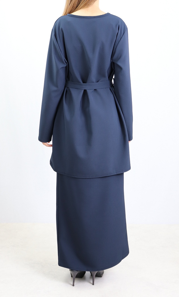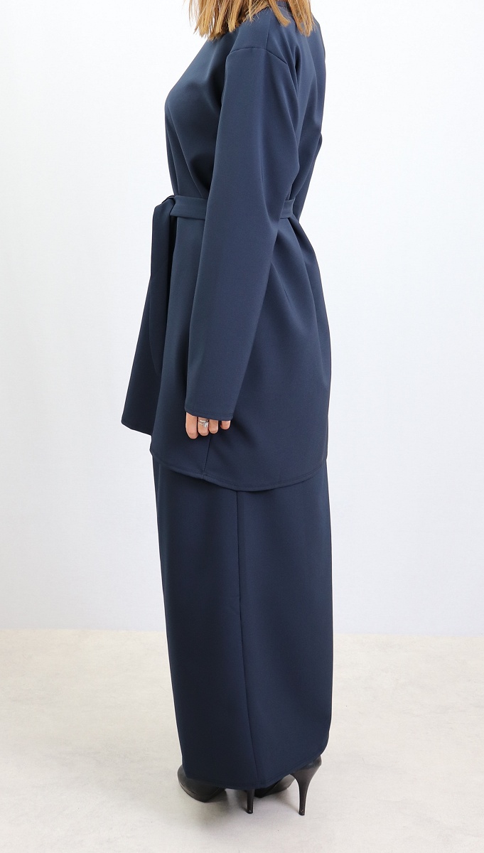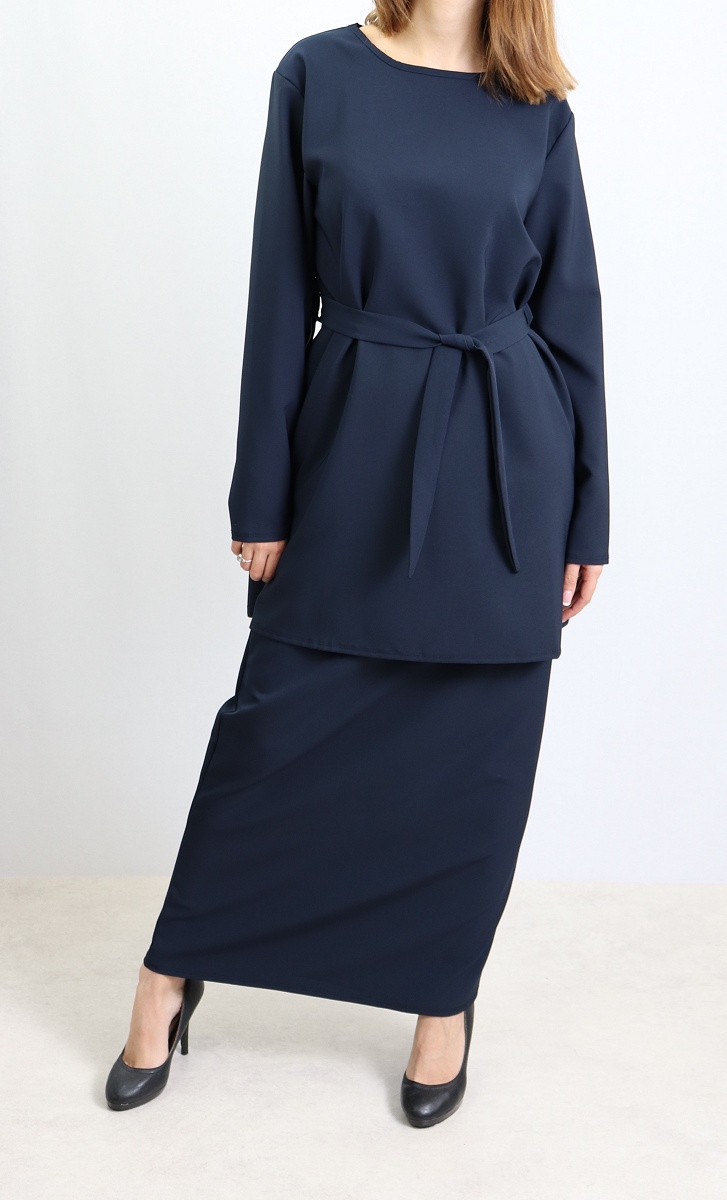La tunique symétrique de l'ensemble ainsi que sa longue jupe opaque toutes deux de couleur bleue nuit produisent un effet stylé et discret à la fois.