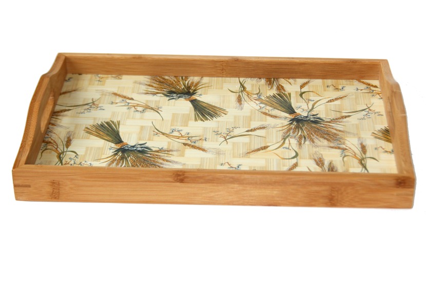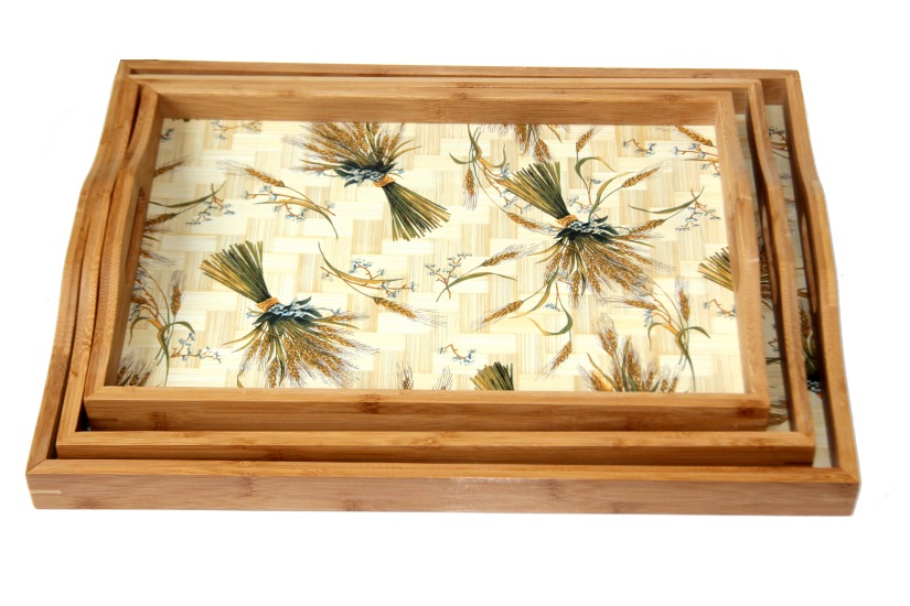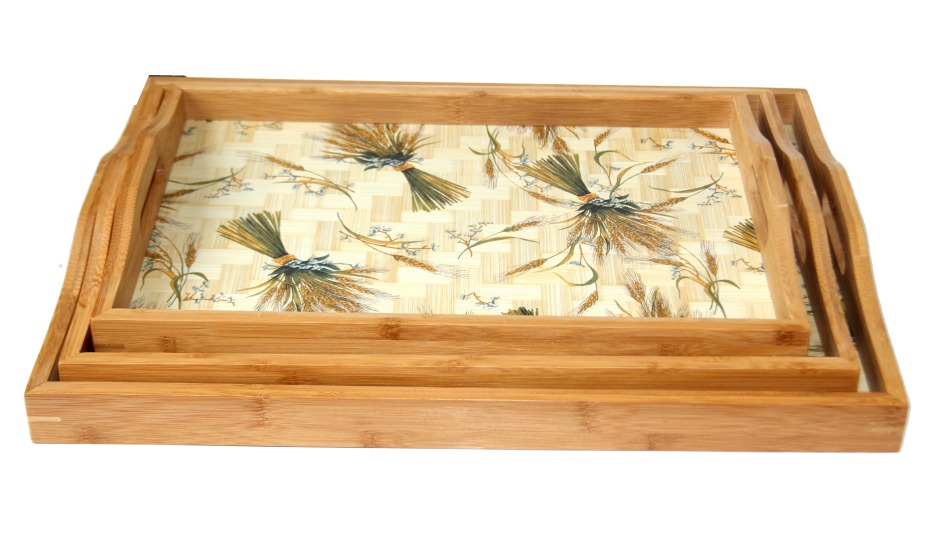Ensemble de trois plateaux en bois décorés avec poignées. Les plateaux ont une taille différente et s’emboîtent les uns dans les autres pour un rangement optimal.