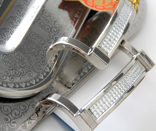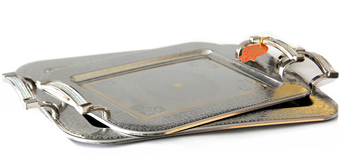 Deux plateaux en inox argentés magnifiquement décorés avec parties dorées. Les poignets sont décorés de strass.