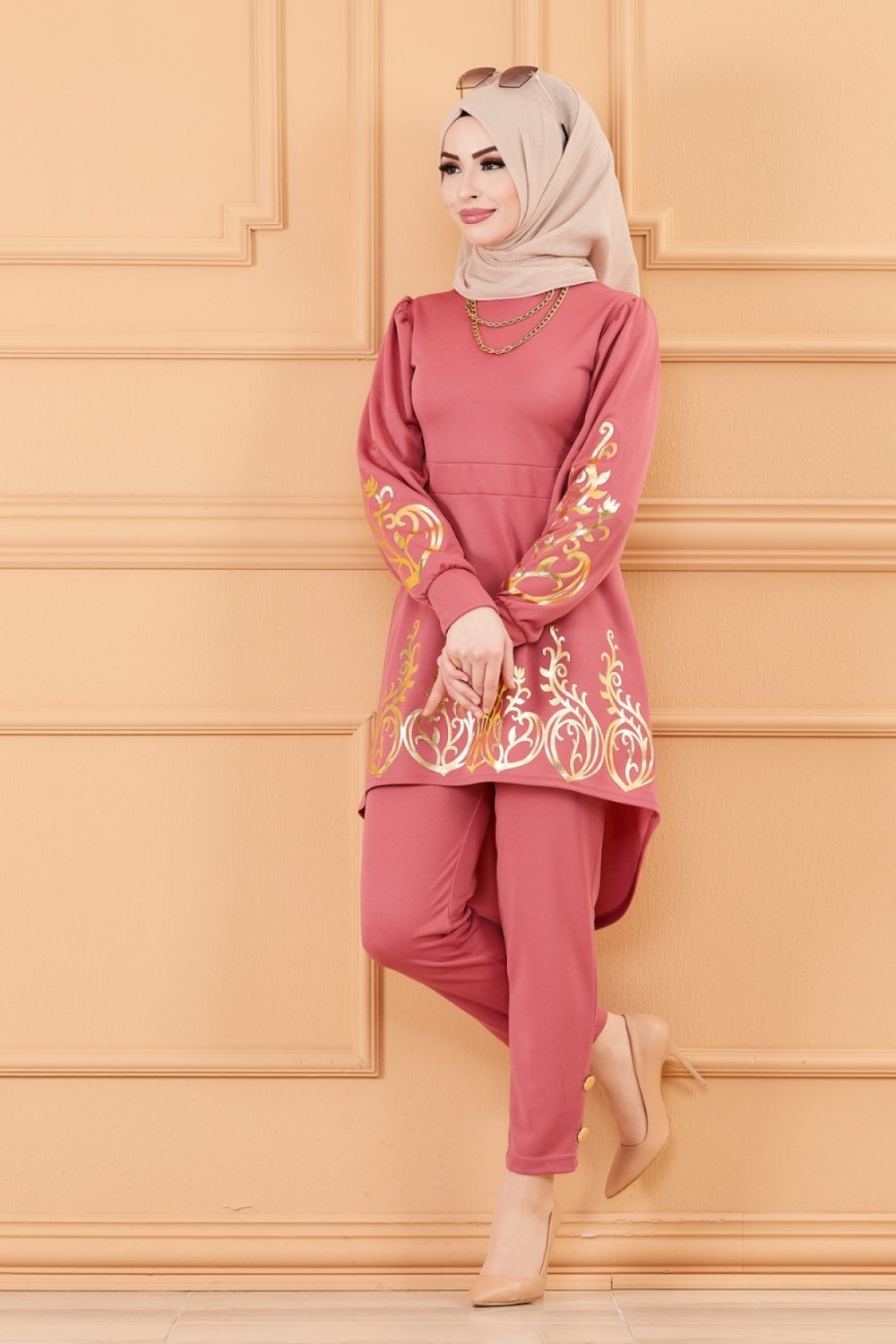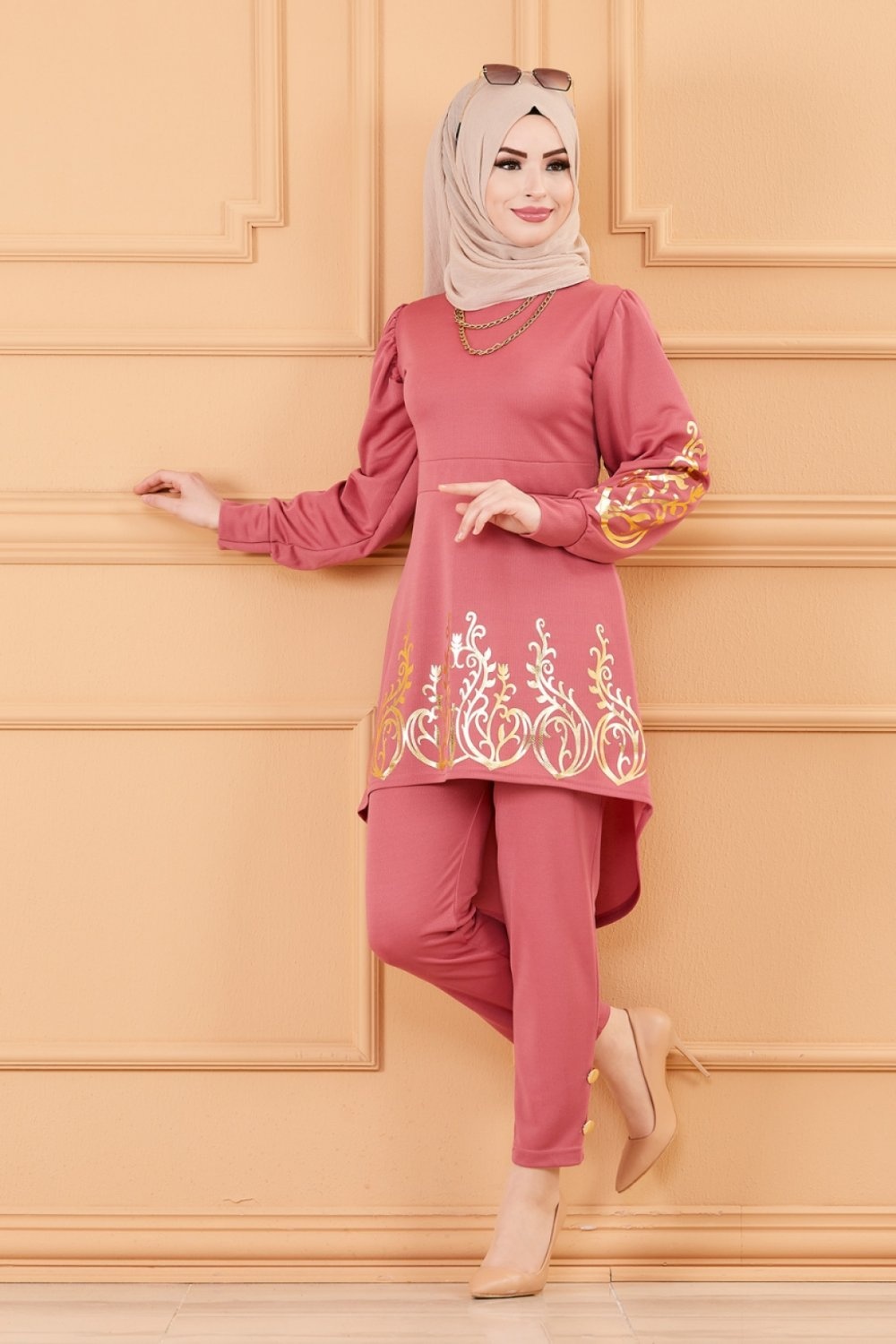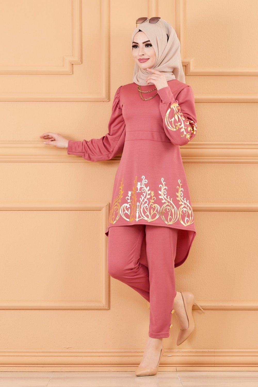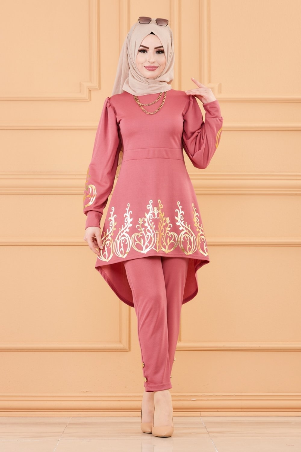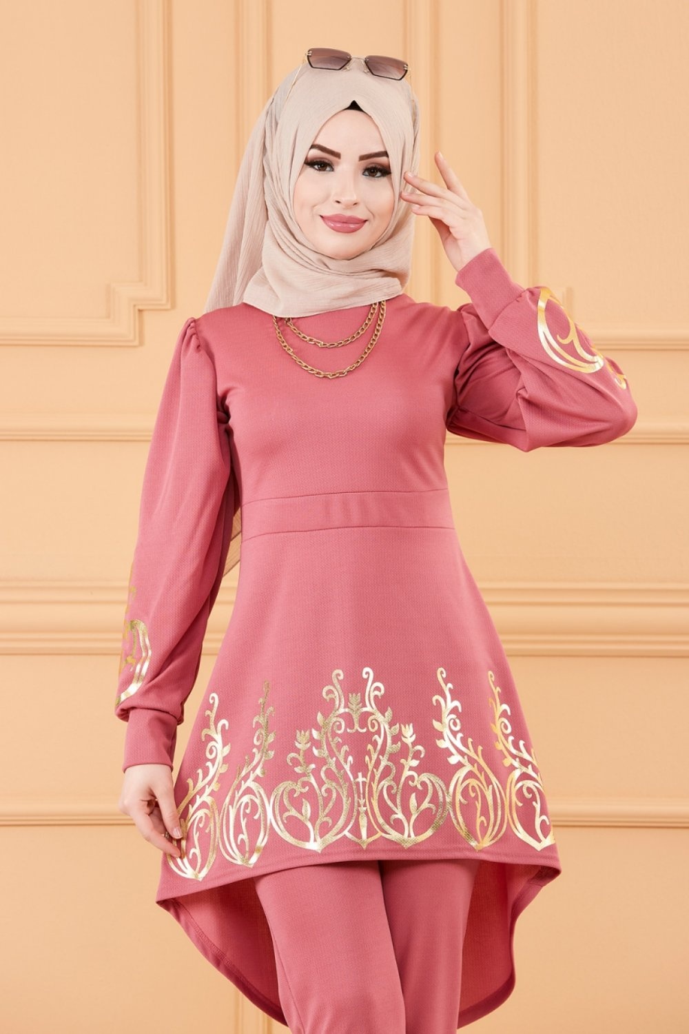 Ensemble de soirée avec arabesques dorées pour femme (Tenue hijab chic - Tunique et pantalon) - Couleur rose Vetement & Accessoire