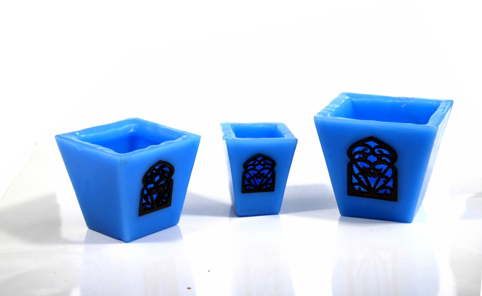 Ensemble de 3 photophores décoratif, provenant de Marrakech (Maroc), peint en bleu clair, émaillé, jolies ciselures en forme de porte,...