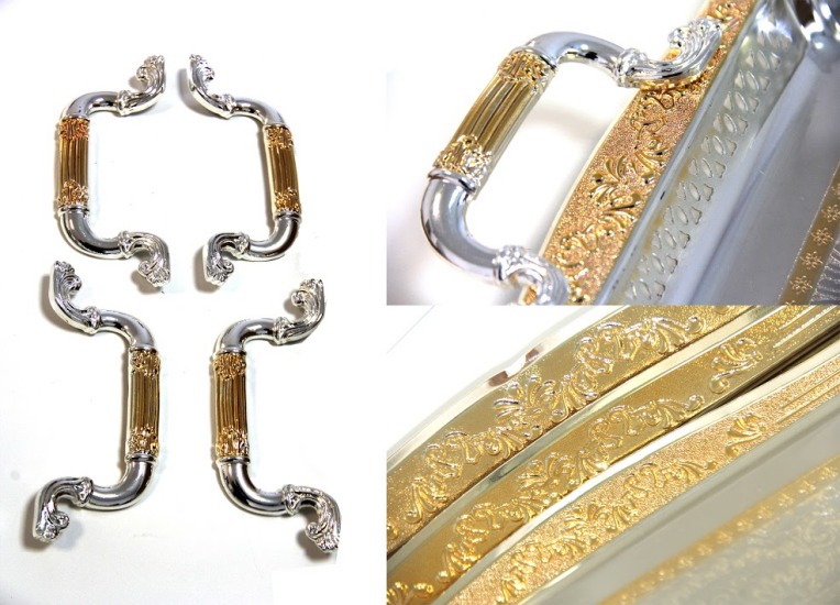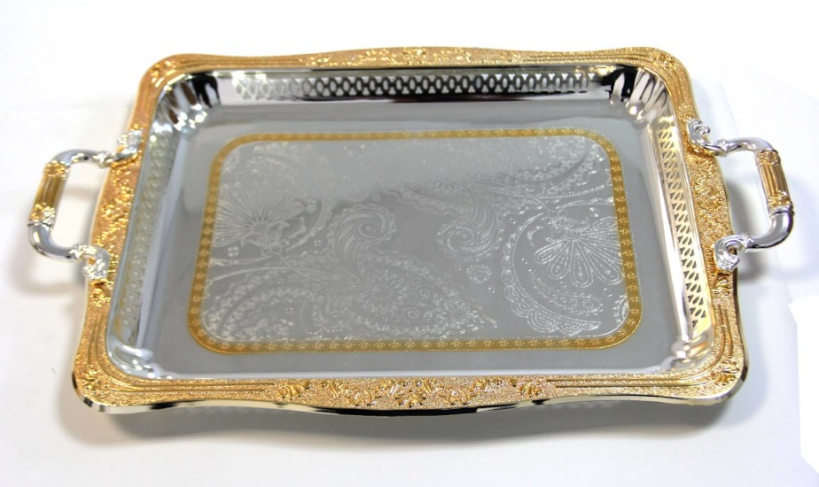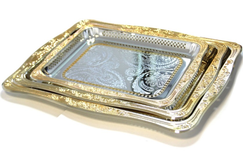 Cet ensemble de plateaux dorés-argentés au fond décoré est bon pour toutes les occasions comme les mariages, les réceptions, les visites...