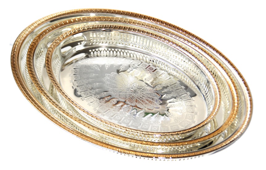 Ensemble de trois plateaux métalliques en inox de forme ovale. Les plataeux sont argentés avec motifs dorés assortis... Le plus grand plateau fait 58 x 43 x 5 cm.