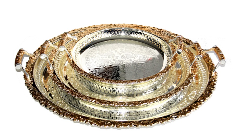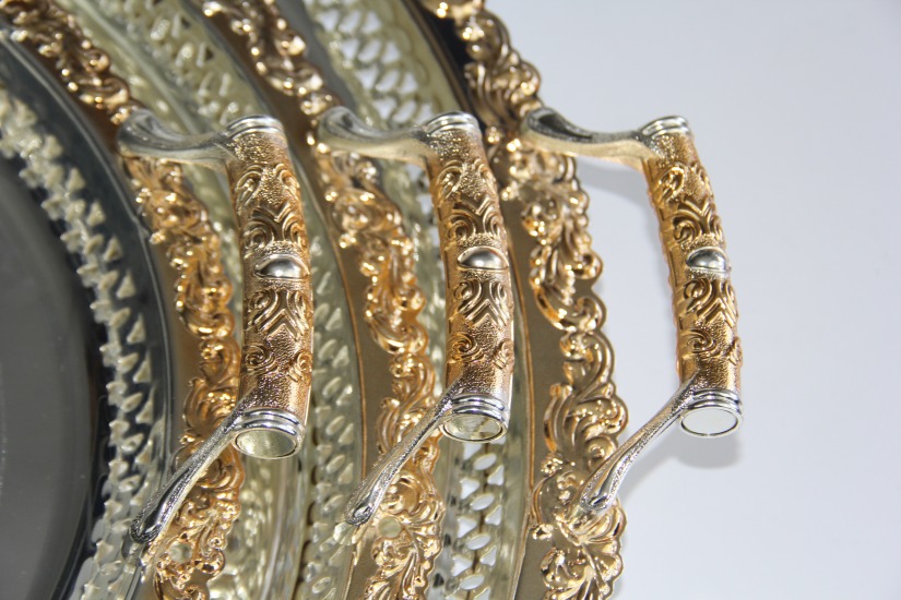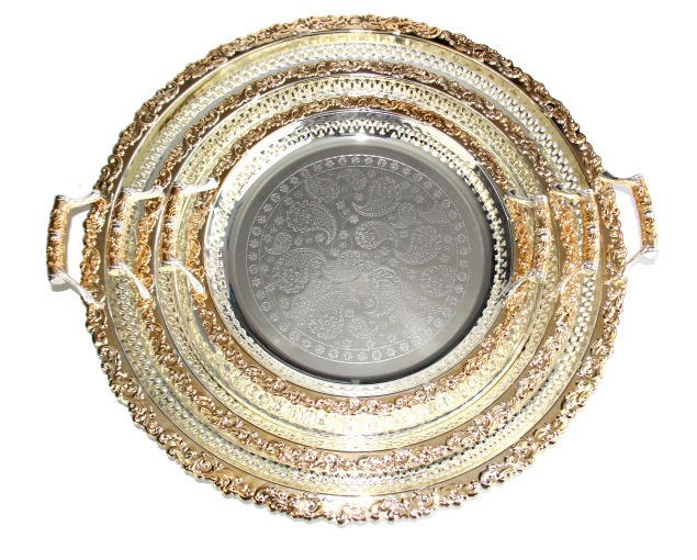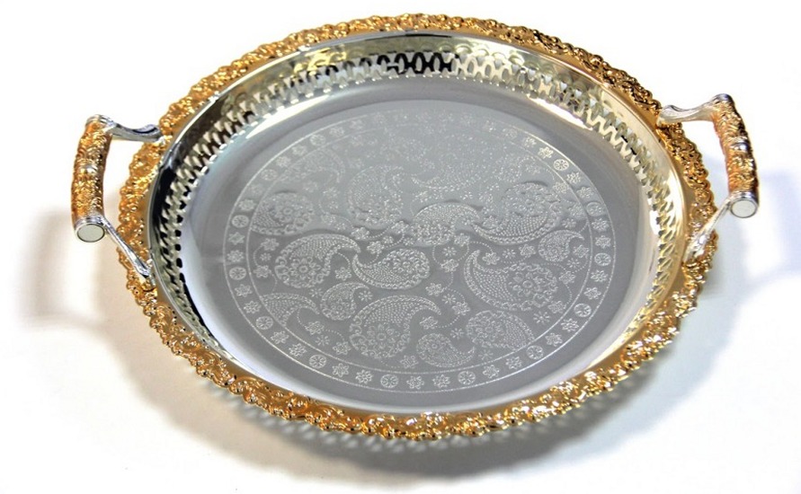Grand plateau rond inox avec décorations dorées - REF. 24783 (52.00 €)