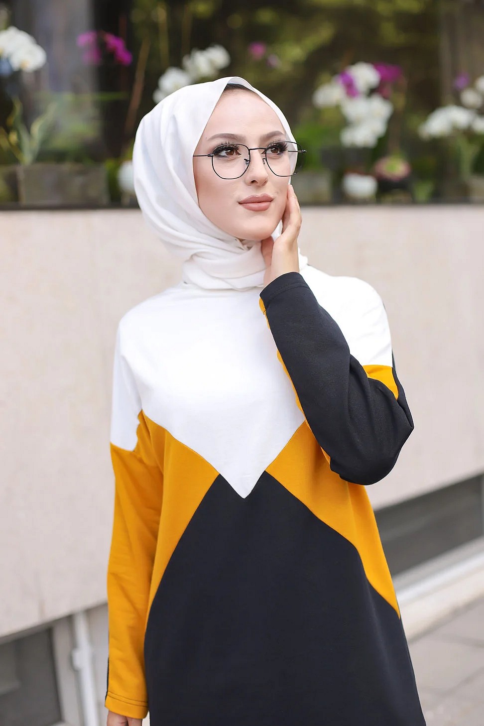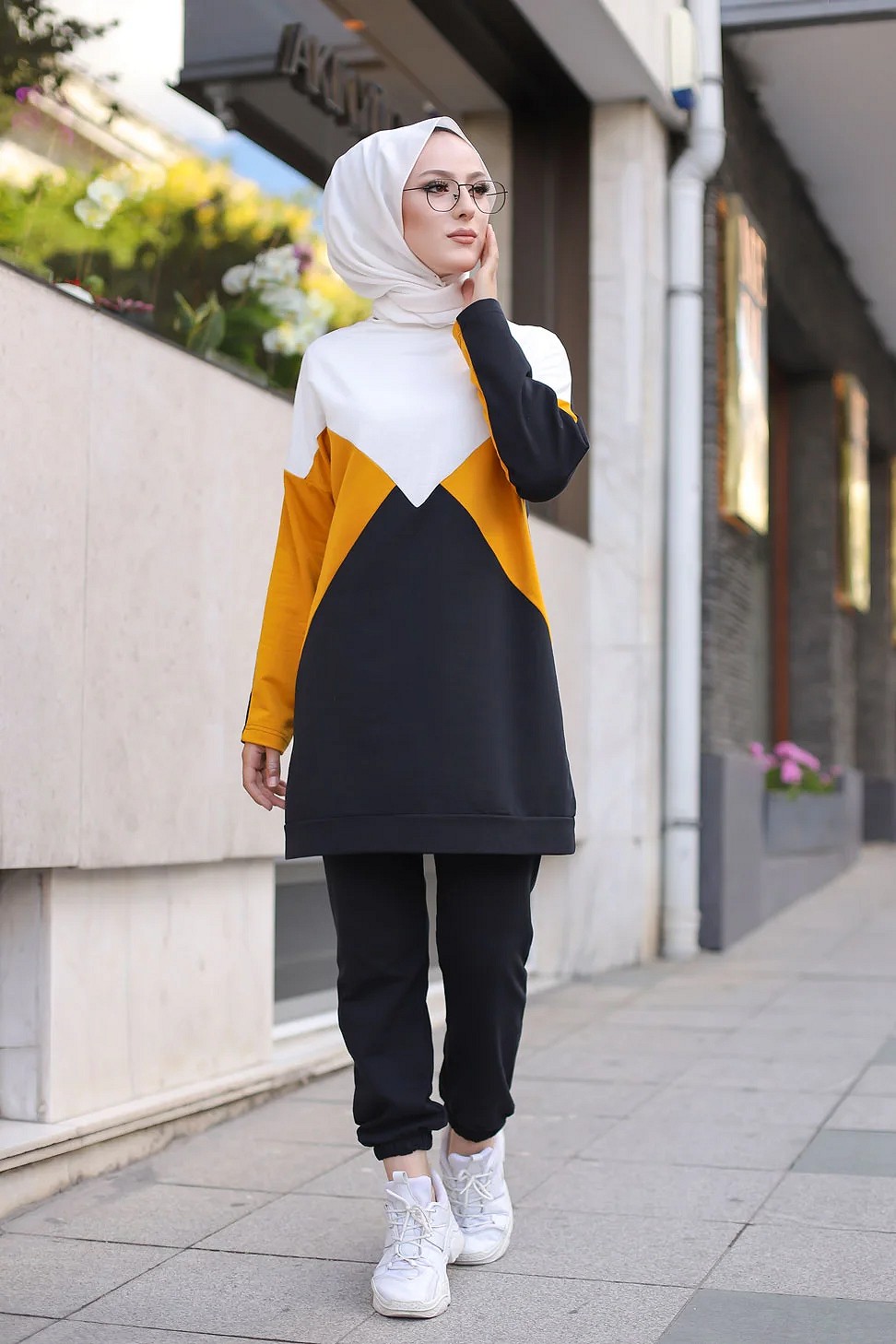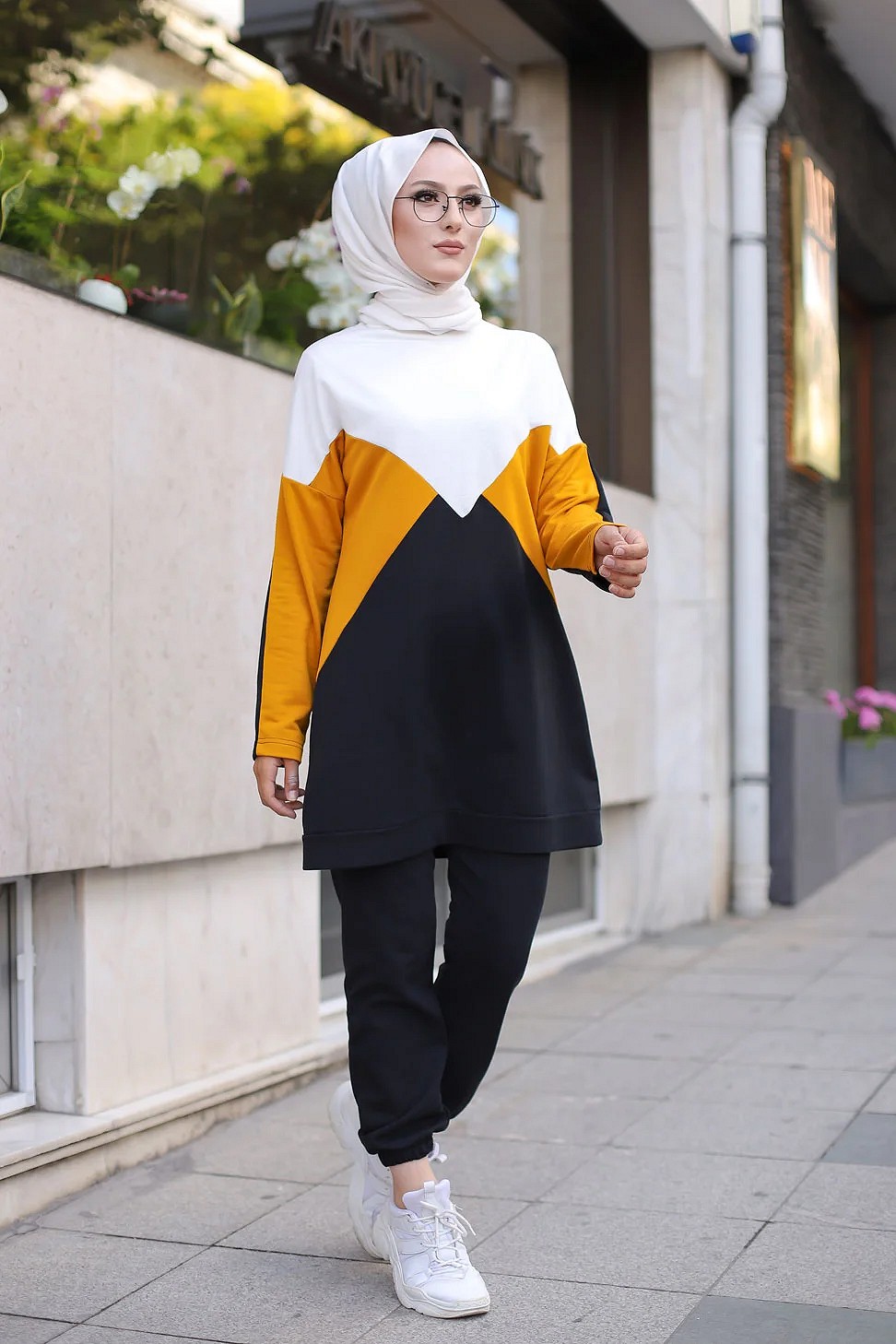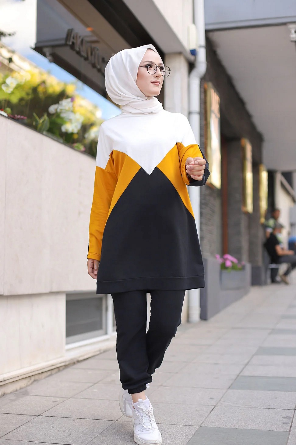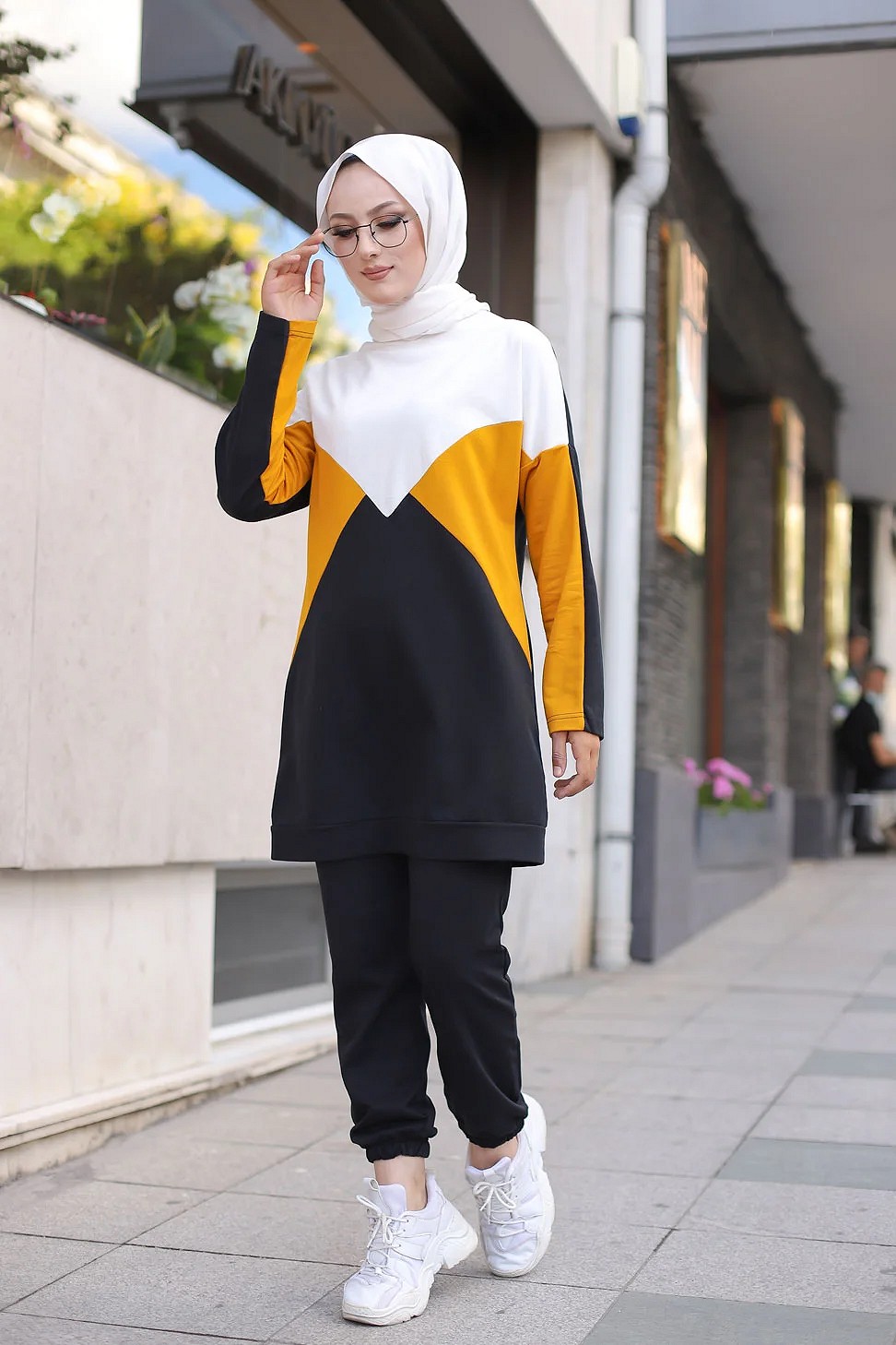 Ensemble decontracte hijab moderne deux pieces pour femme musulmane - Survetement a 3 couleurs : moutarde, noir et blanc