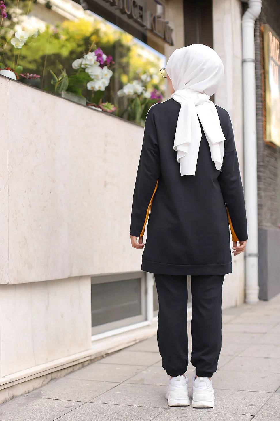 Survêtement hijab sport chic à capuche pour femme musulmane (deux pièces haut et bas) - Couleur noir et moutarde - REF. 33888 (25.00 €)