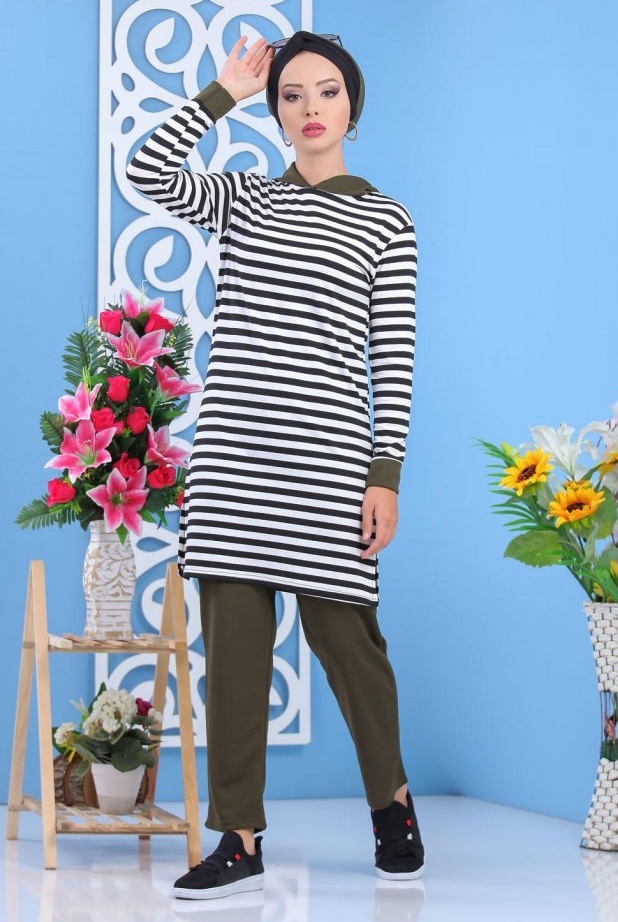 Ensemble de sport deux pièces (Pantalon jogger et Tunique) pour femme voilée - Survêtement à 3 couleurs : kaki, noir et blanc - REF. 32920 (24.90 €)