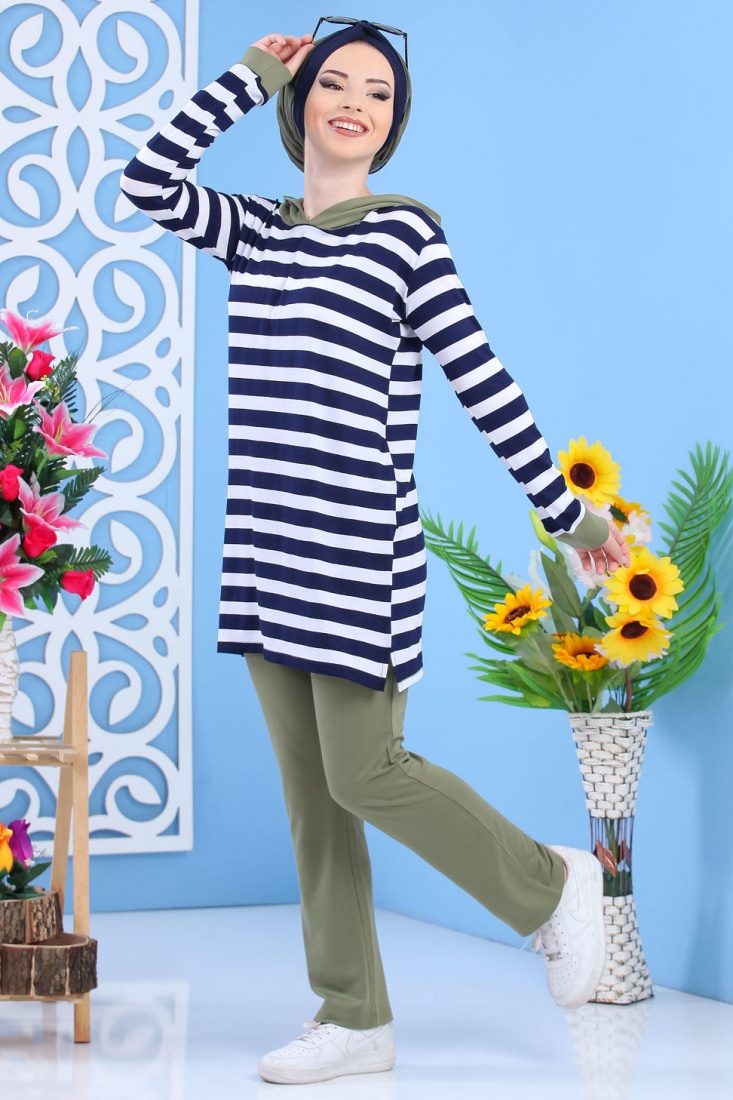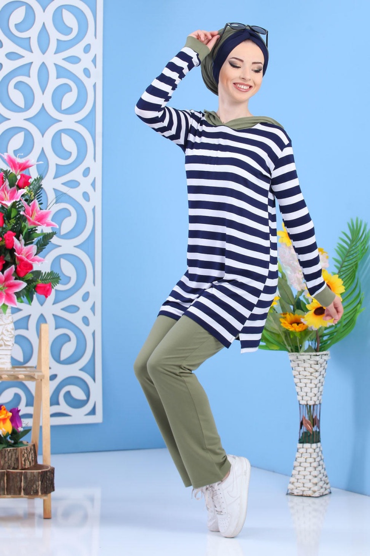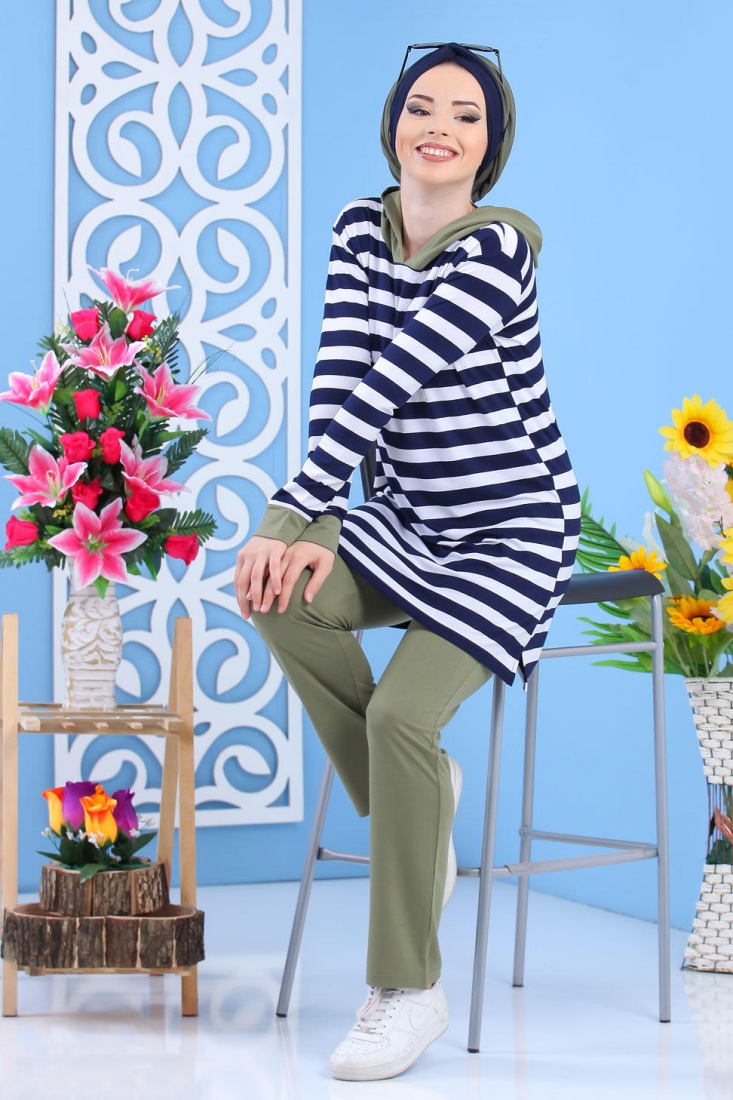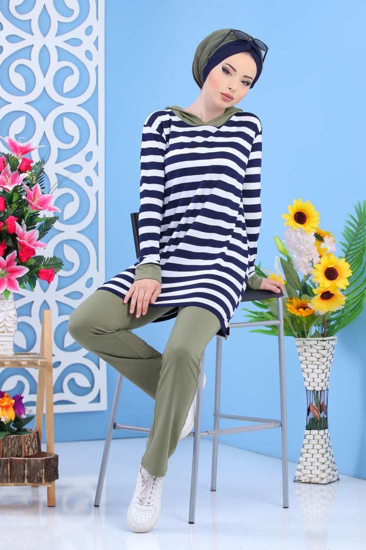 Ensemble décontracté avec tunique à capuche ample et pantalon assorti (Vetement hijab de sport mastour pour femme voilée) - Couleur kaki - REF. 36268 (35.00 €)