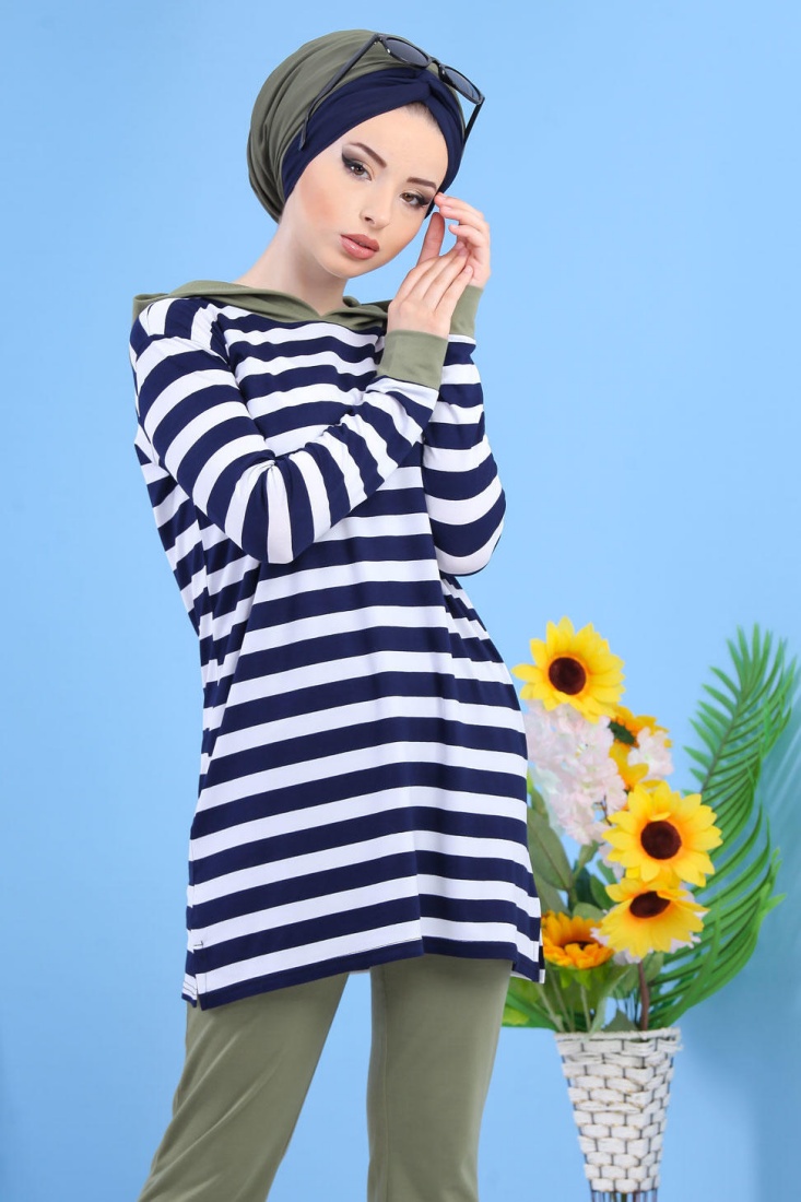 Ensemble décontracté pour femme : Pantalon Kaki + Tunique de couleur blanche à rayures bleues marines (2 pièces) Vetement & Accessoire