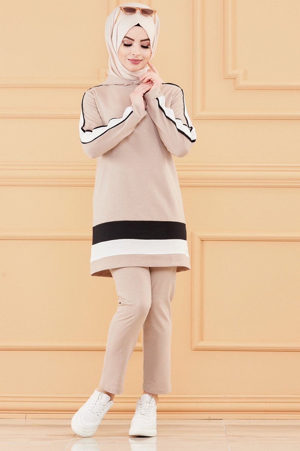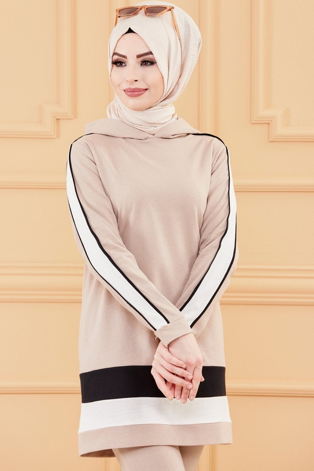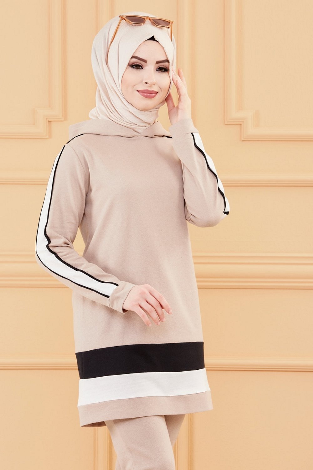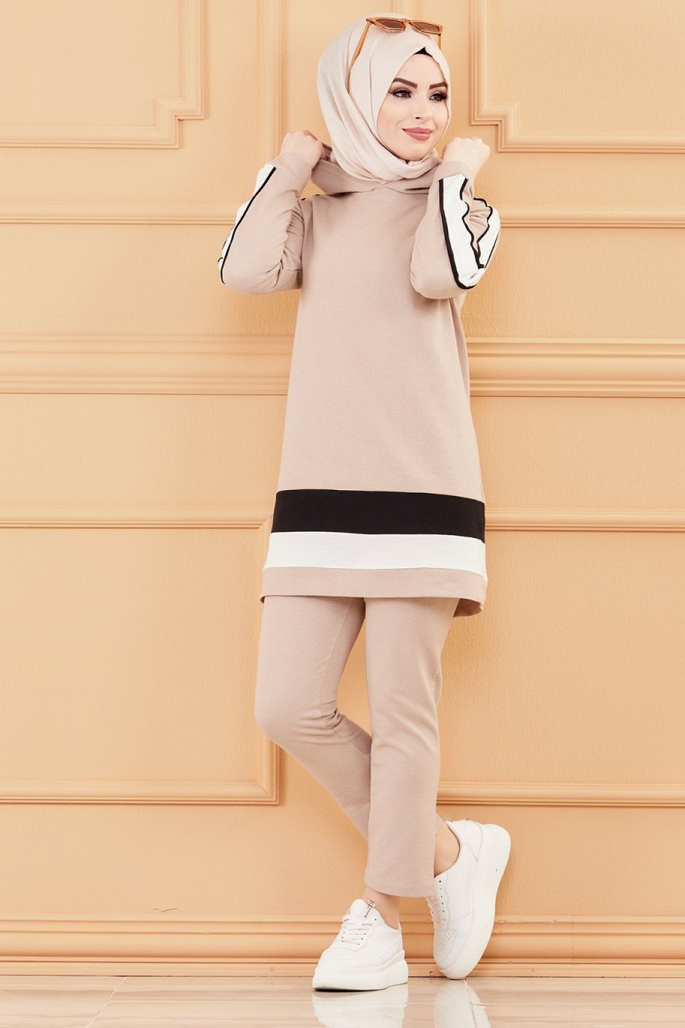 Ensemble décontracté pour femme : Tunique à capuche et Pantalon (Vêtement de sport pour musulmane) - Couleur beige Vetement & Accessoire