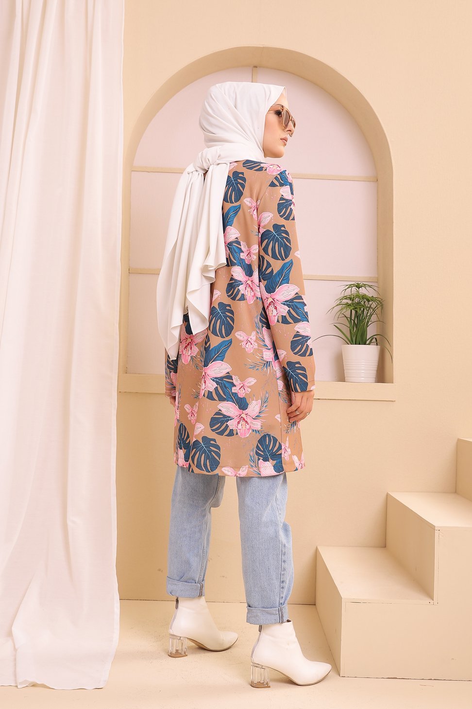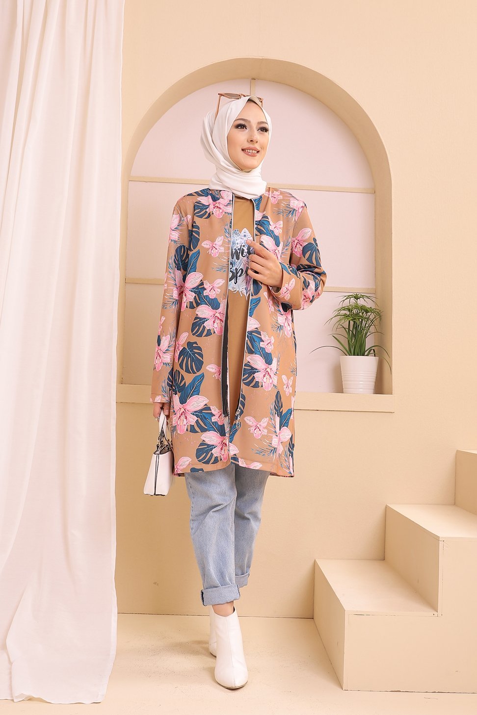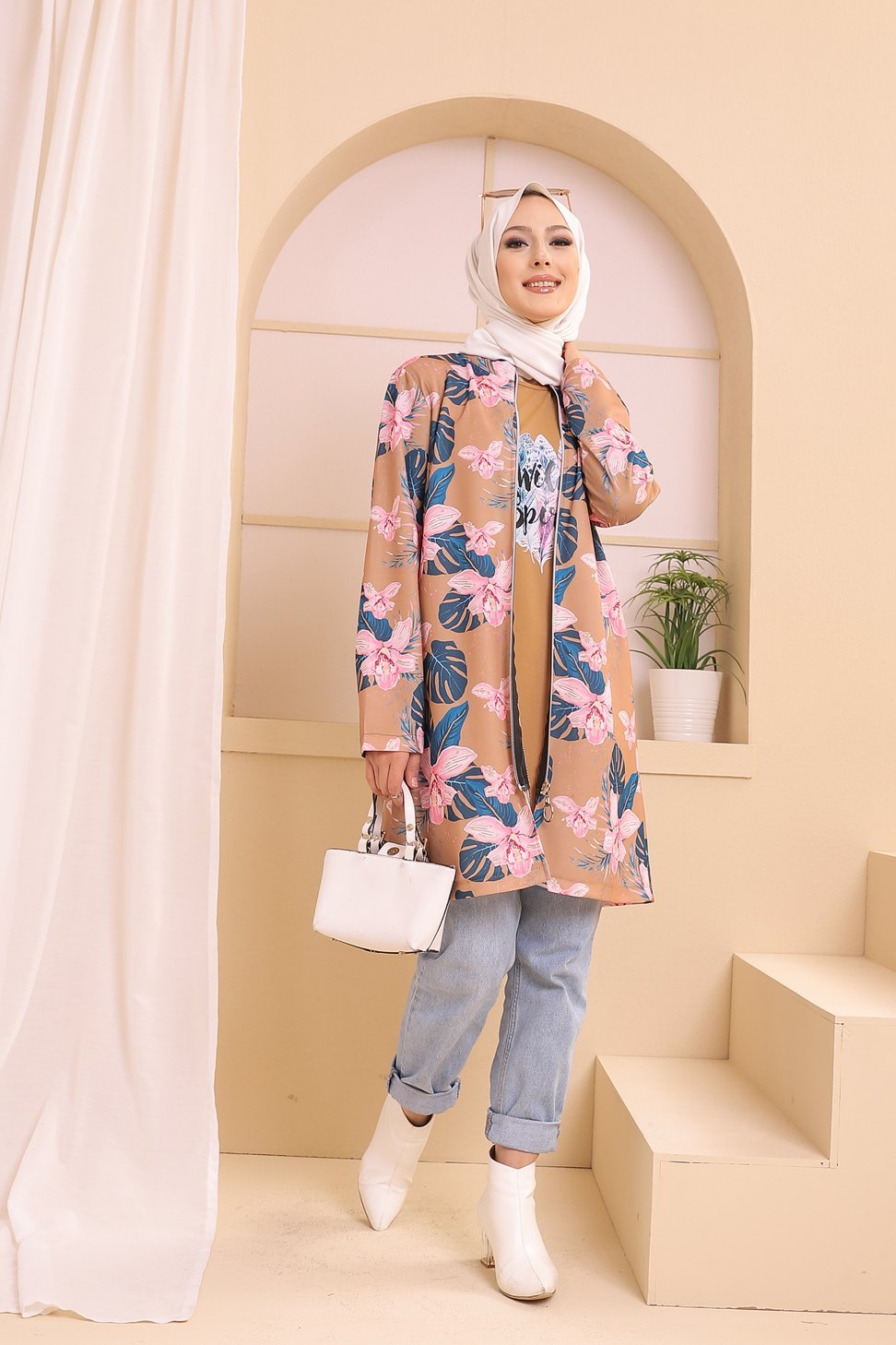 Ensemble deux pièces Tunique et Veste imprimées pour femme (Tenue Hijab) - Couleur prune avec motifs fleurs rose et biscuit Vetement & Accessoire