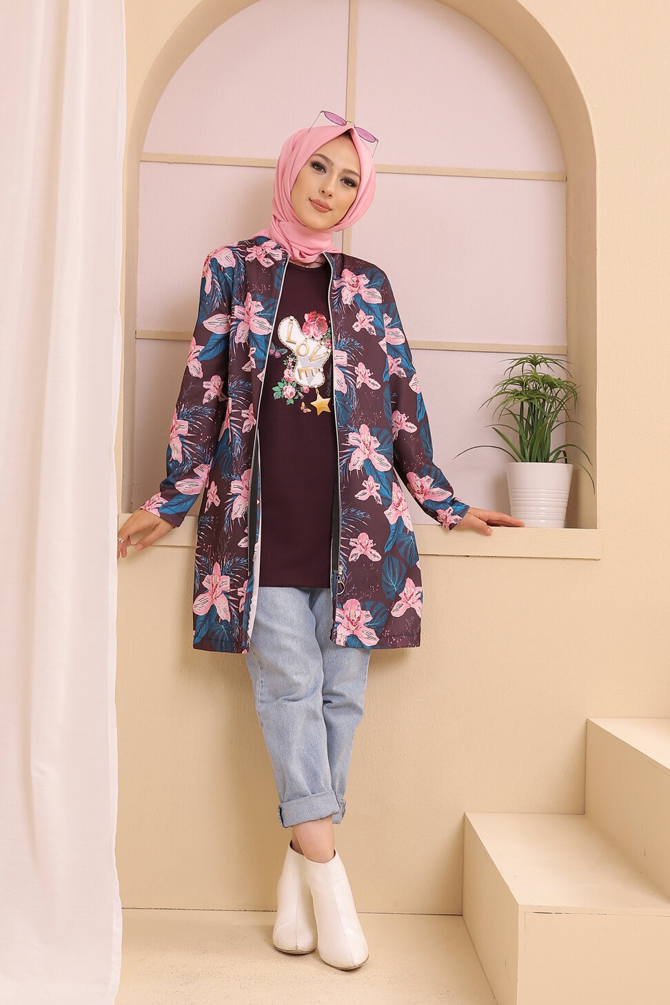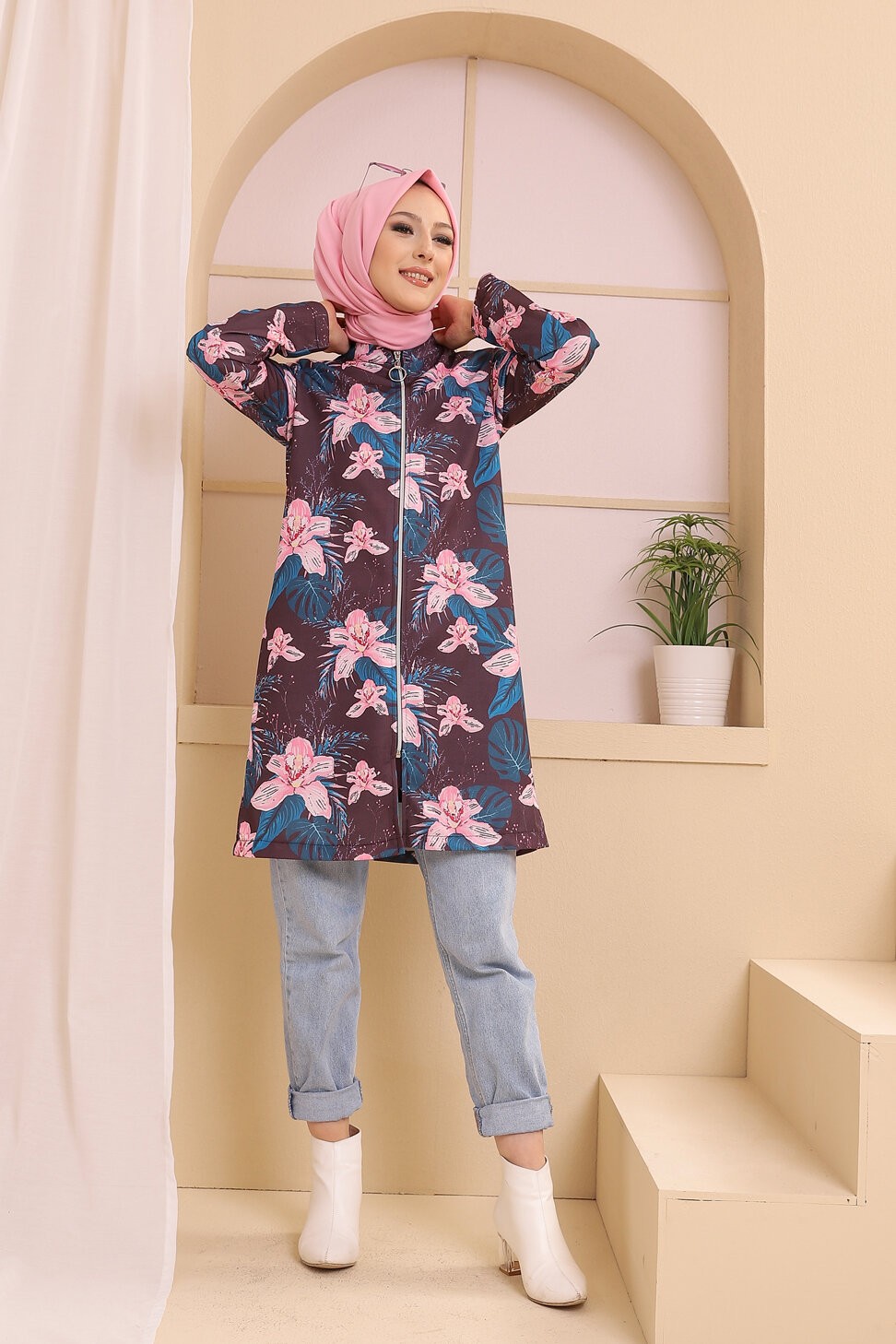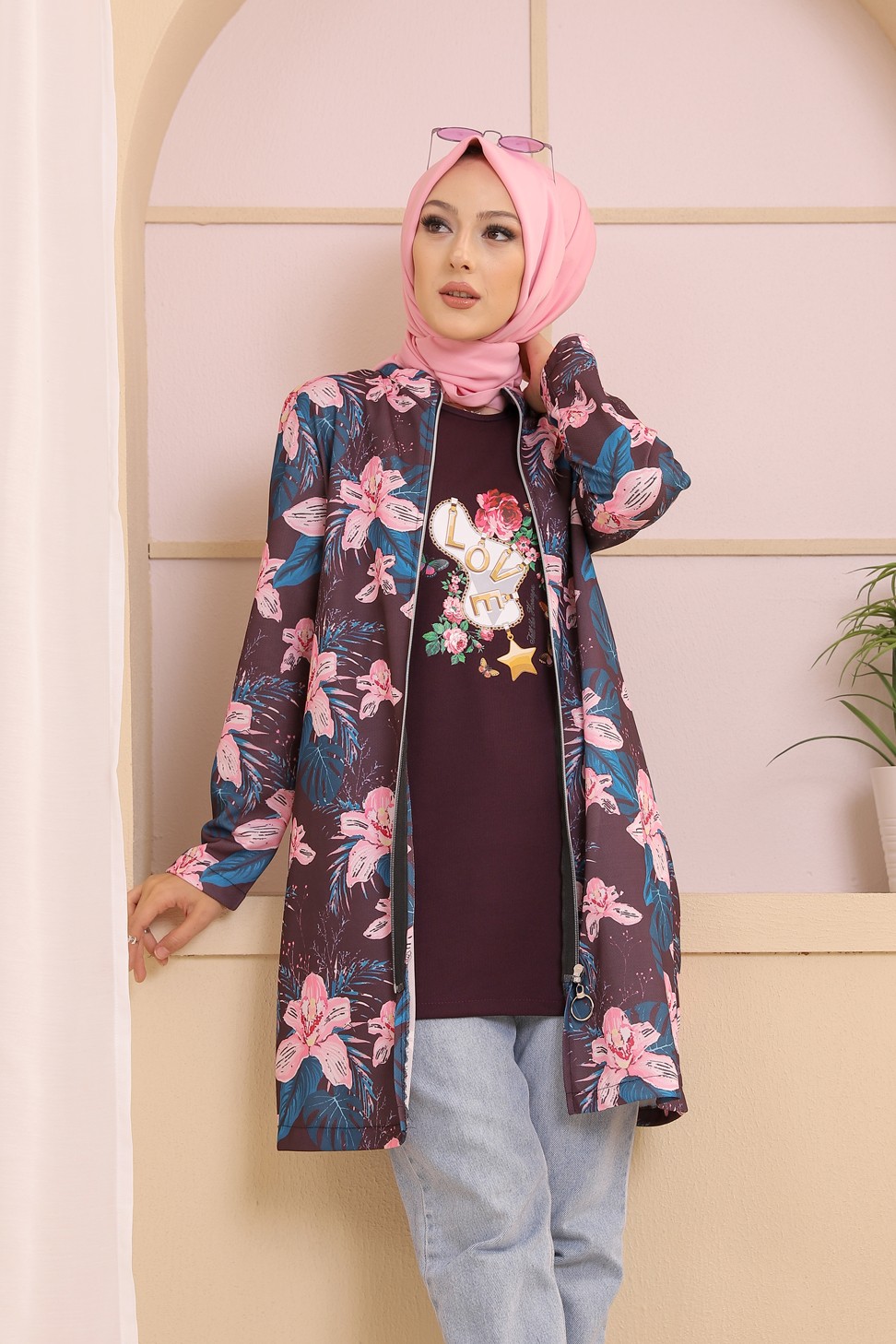 Ensemble deux pièces Tunique et Veste imprimées pour femme (Tenue Hijab) - Couleur prune avec motifs fleurs rose et bleu Vetement & Accessoire