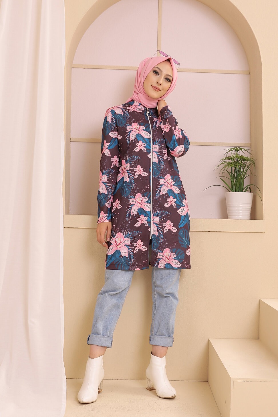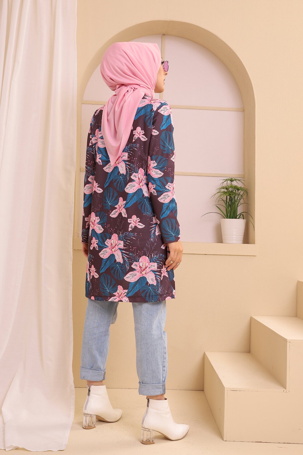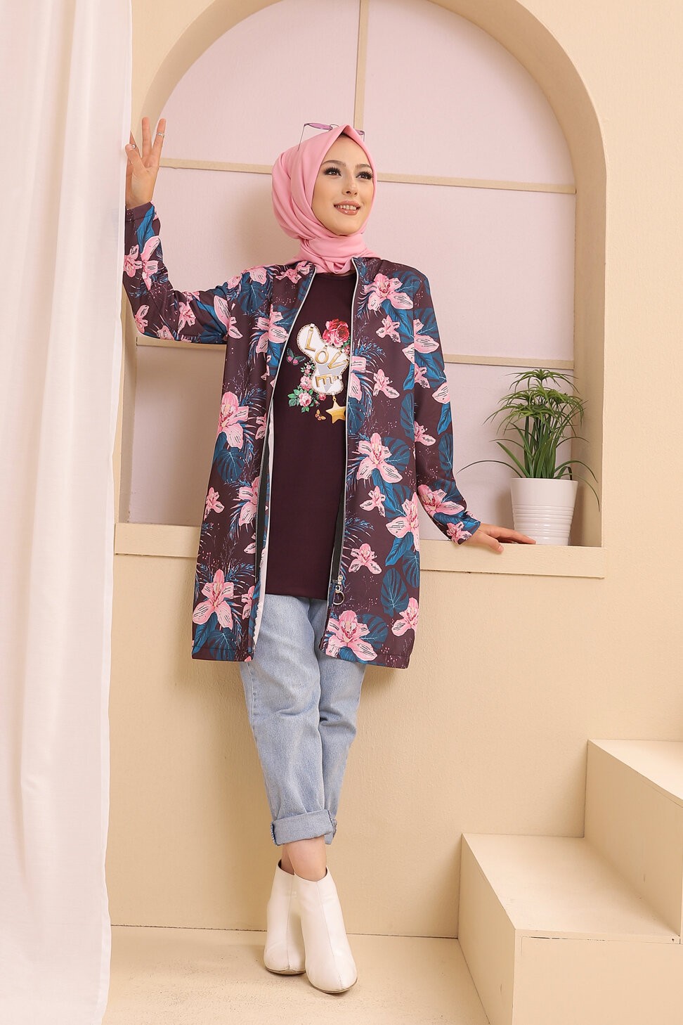Ensemble deux pièces Tunique et Veste imprimées pour femme (Tenue Hijab) - Couleur prune avec motifs fleurs rose et bleu Vetement & Accessoire