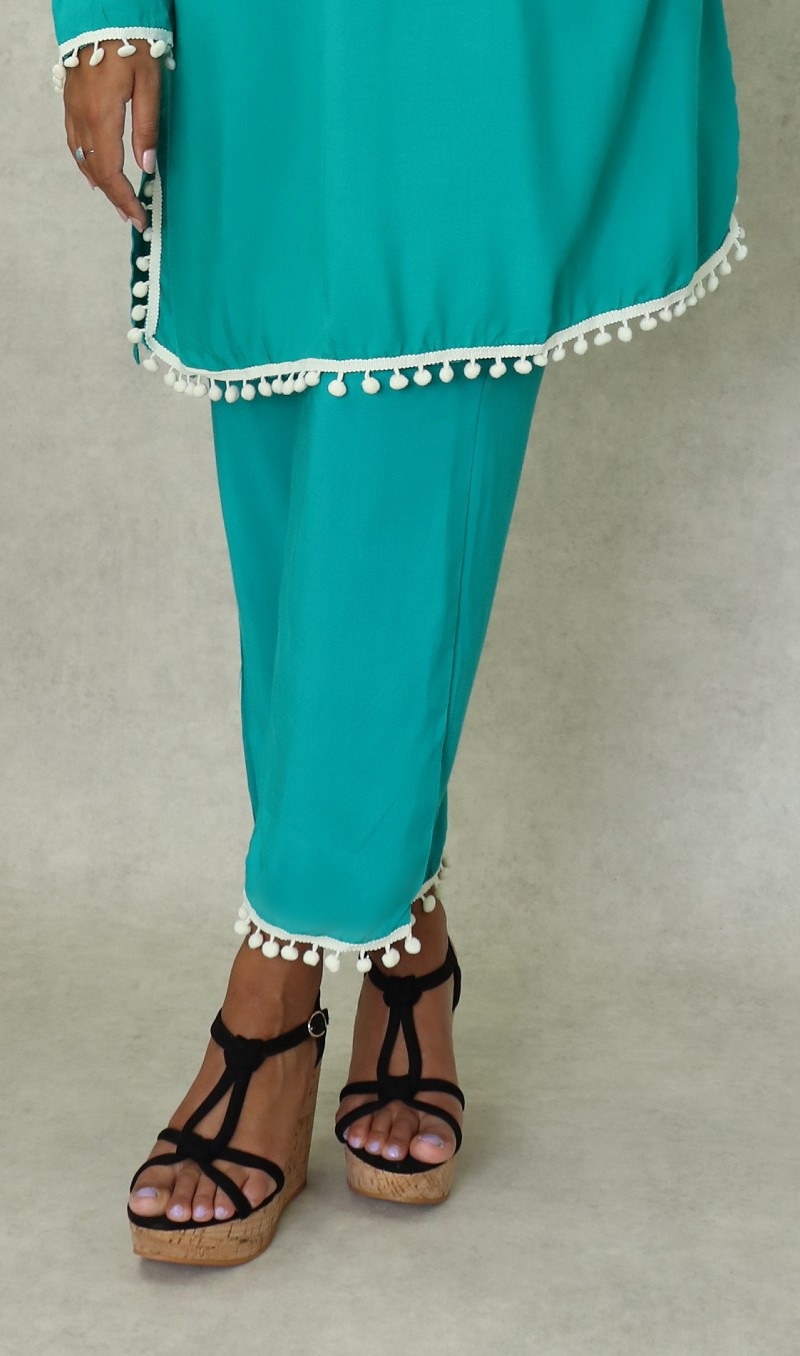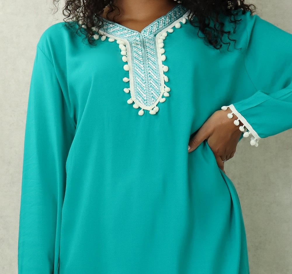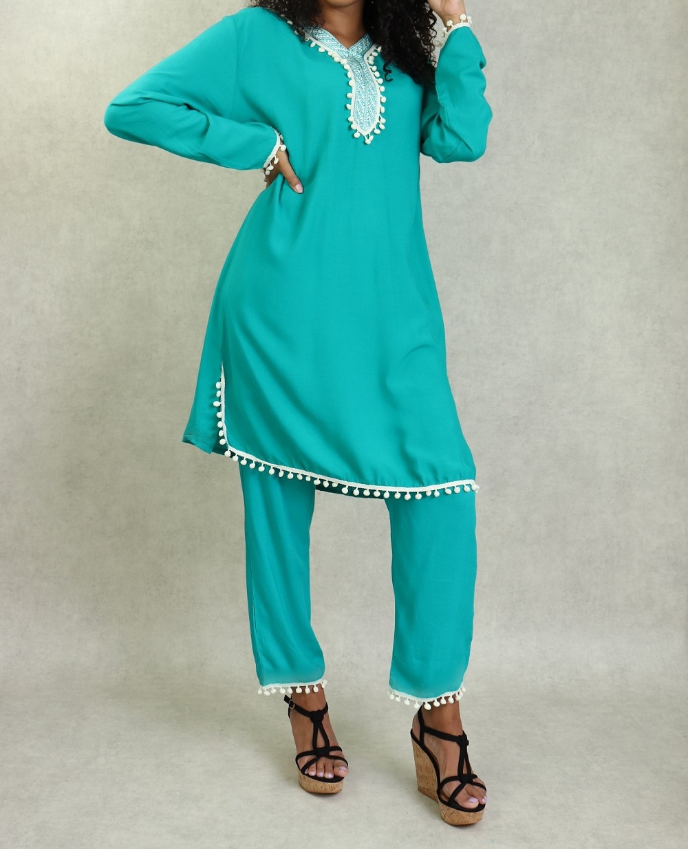 Ensemble style Jabador femme composé d’une tunique avec broderie assortie à de petits pompons sur le buste et sur la fin des manches, Col en V, et son pantalon assorti avec ceinture élastique, deux poches latérales, coupe droite.