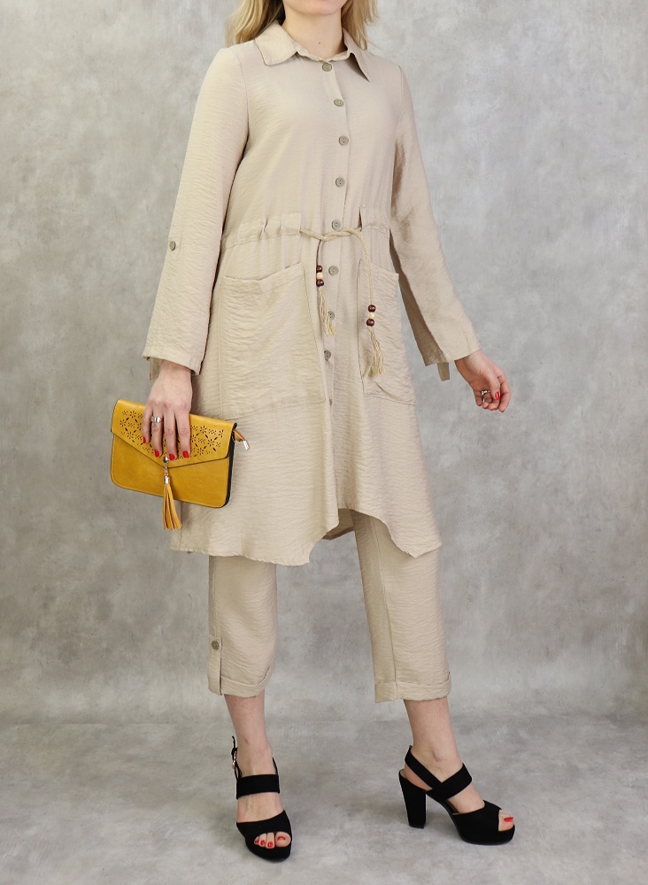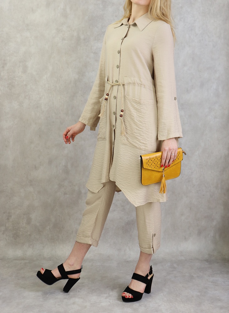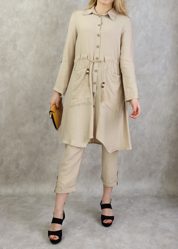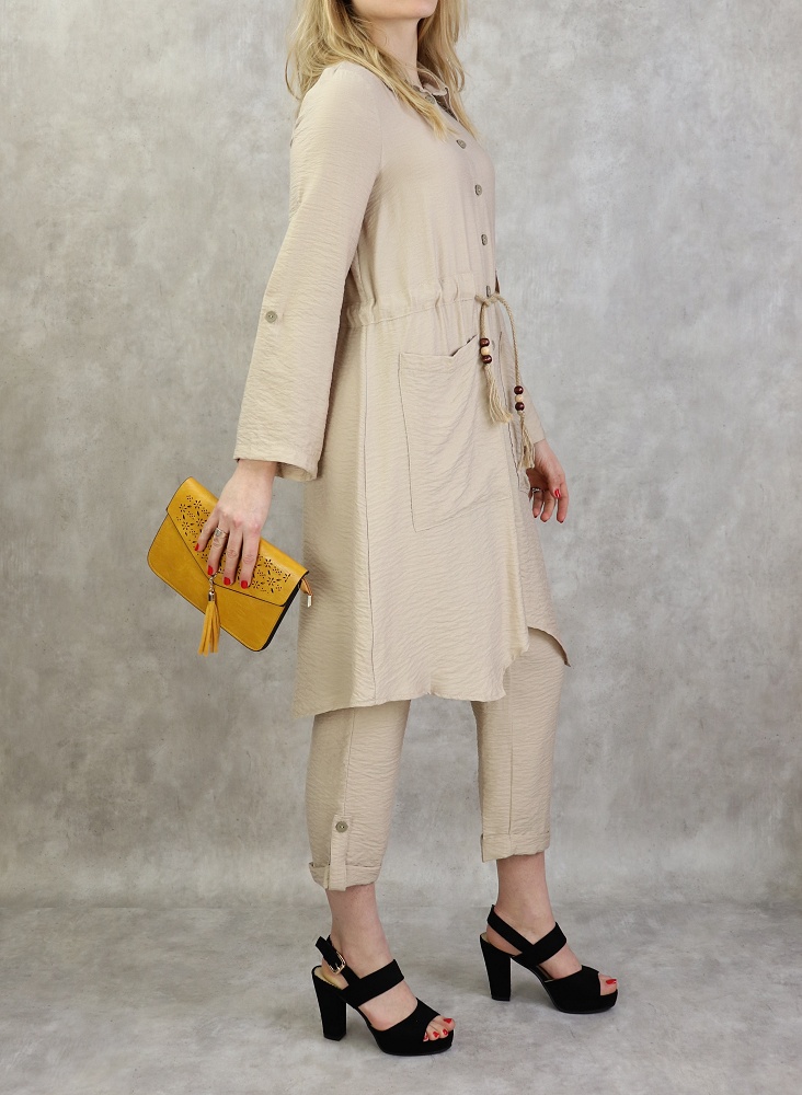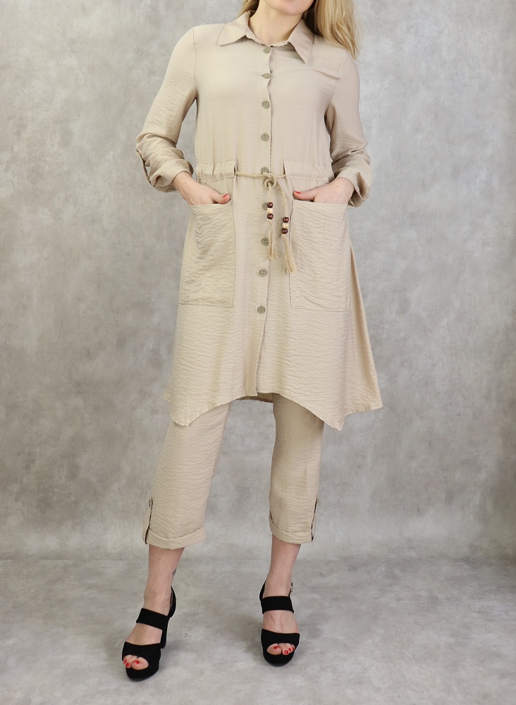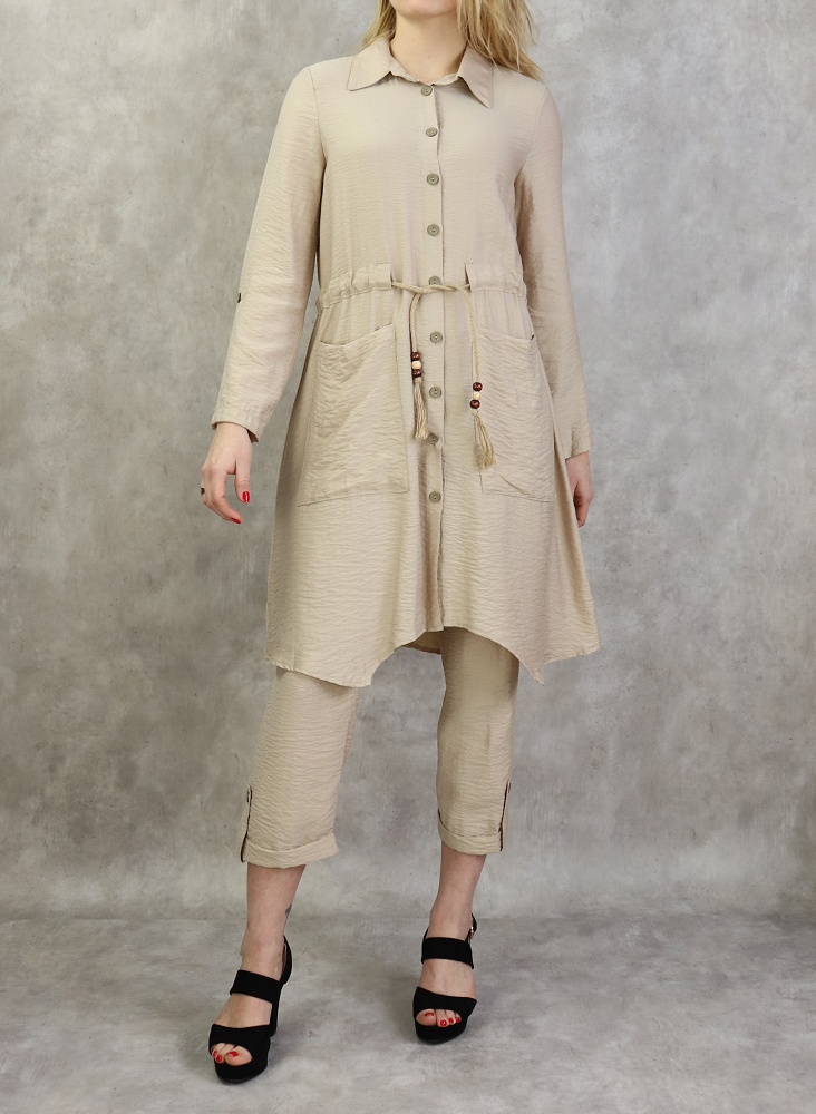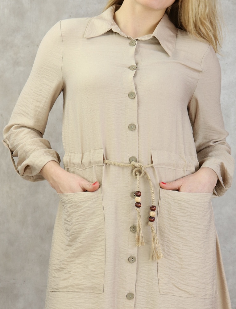 Tunique : mi longue, col chemise, manches ajustables, lien de serrage à la taille, grandes poches.