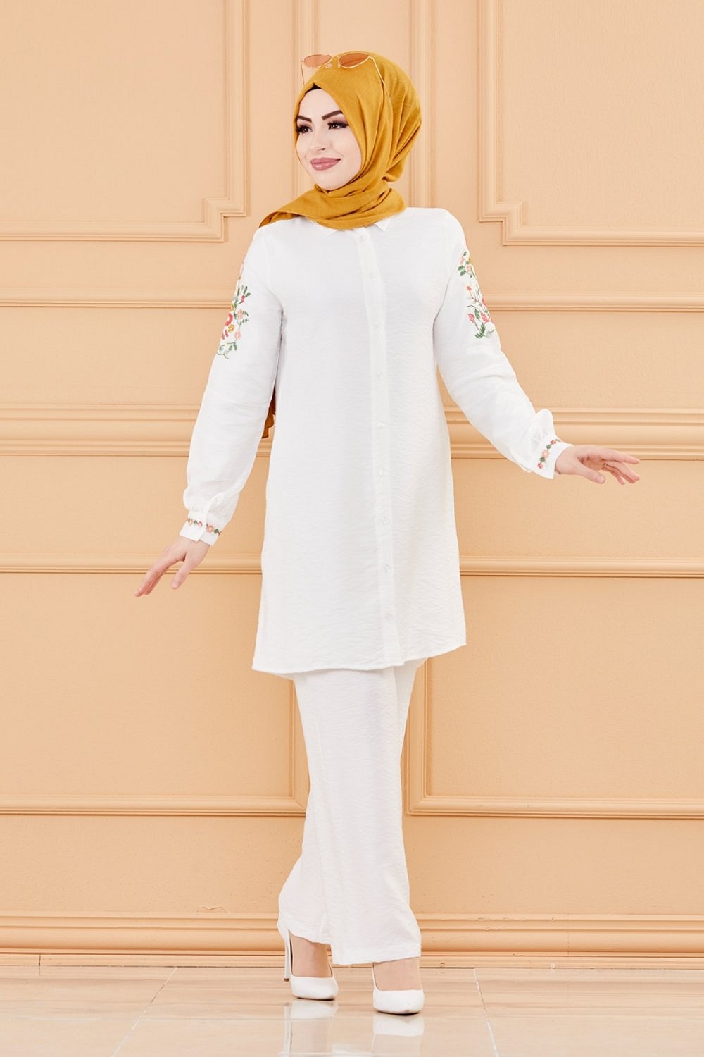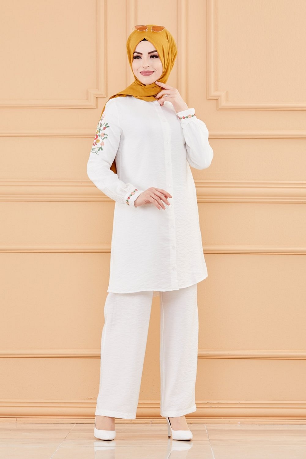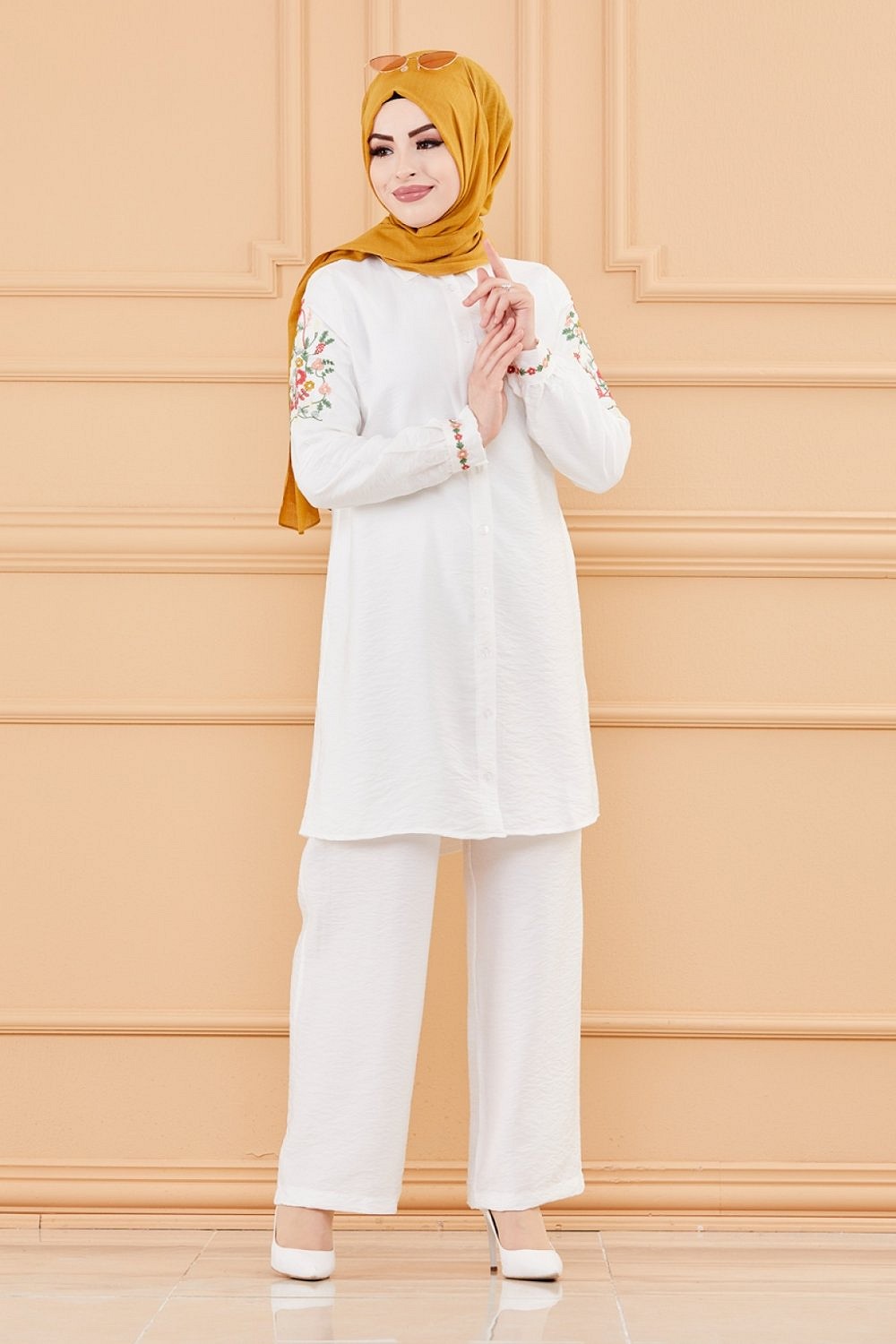 Ensemble femme avec broderies (tunique/chemise et pantalon) - Couleur blanc Vetement & Accessoire