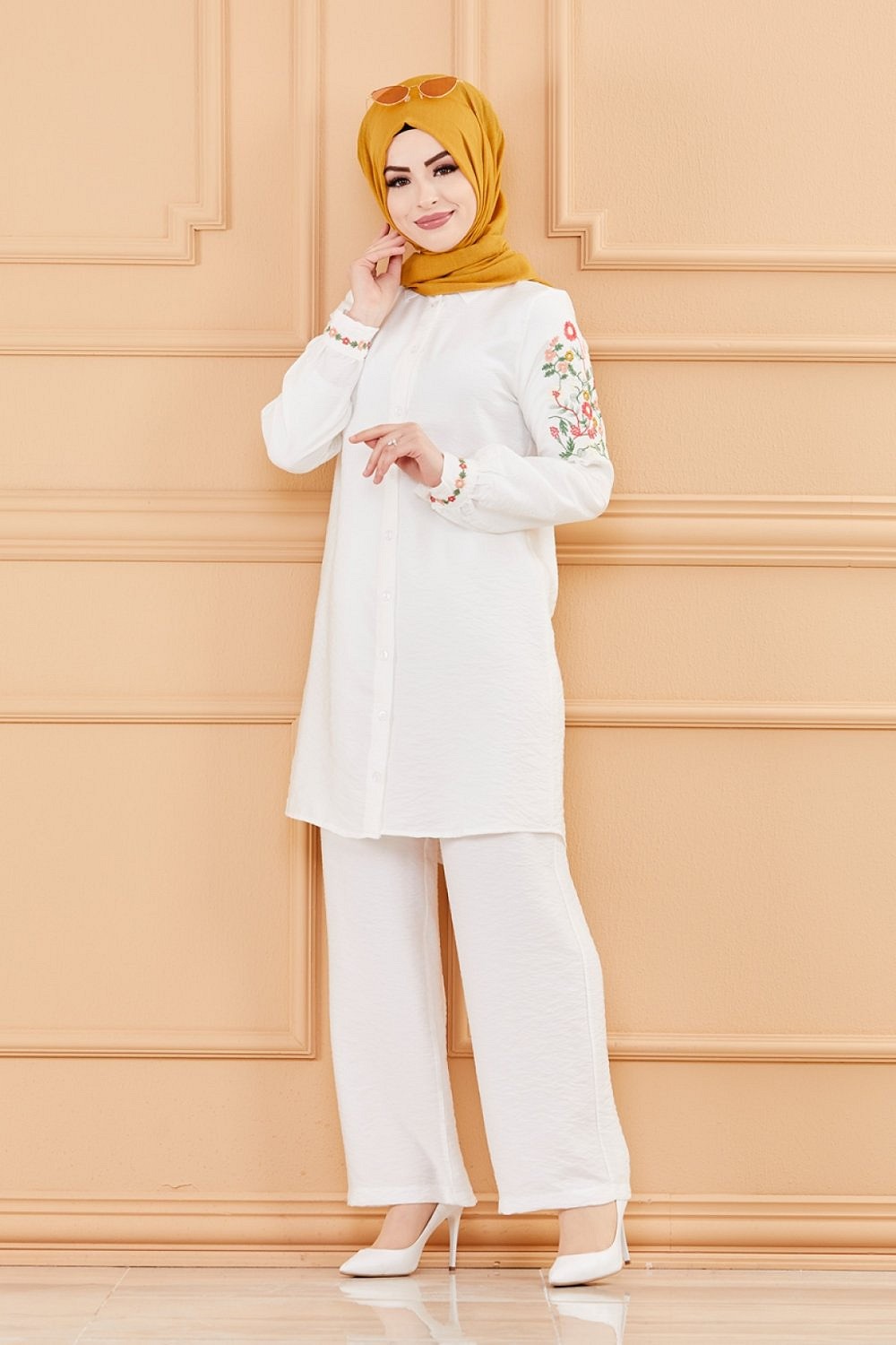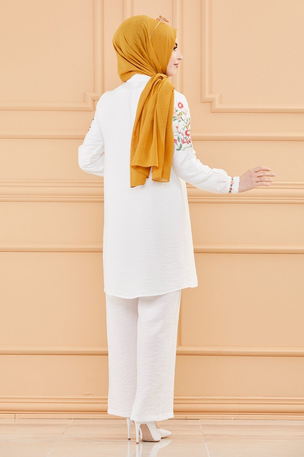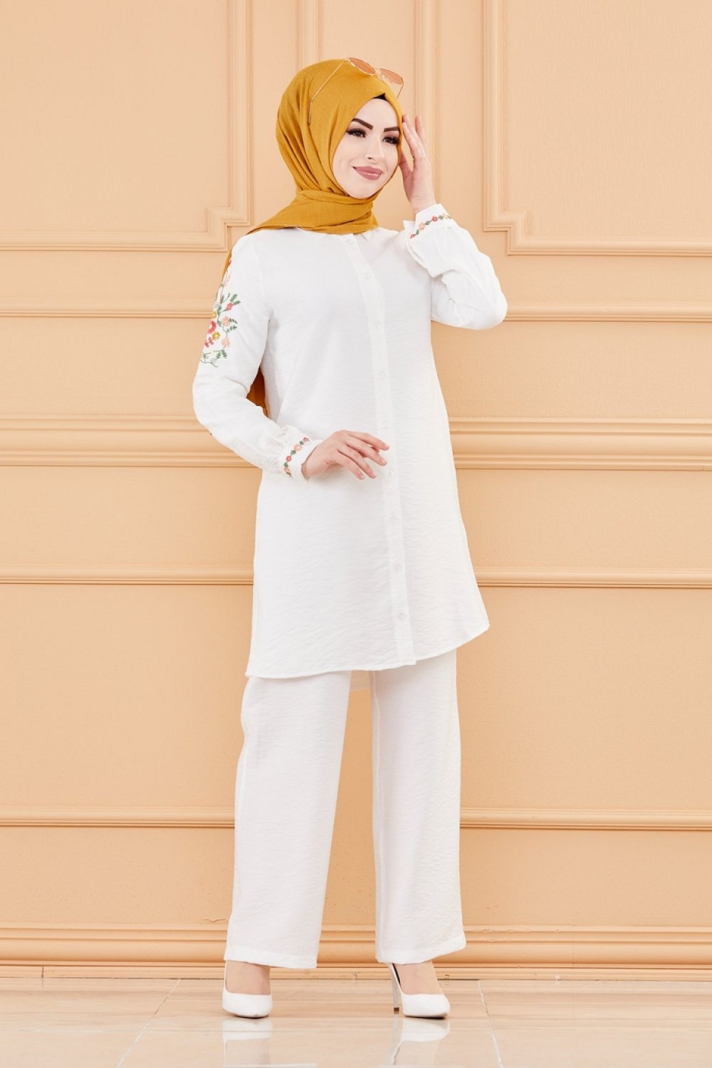 Ensemble femme avec broderies (tunique/chemise et pantalon) - Couleur blanc Vetement & Accessoire