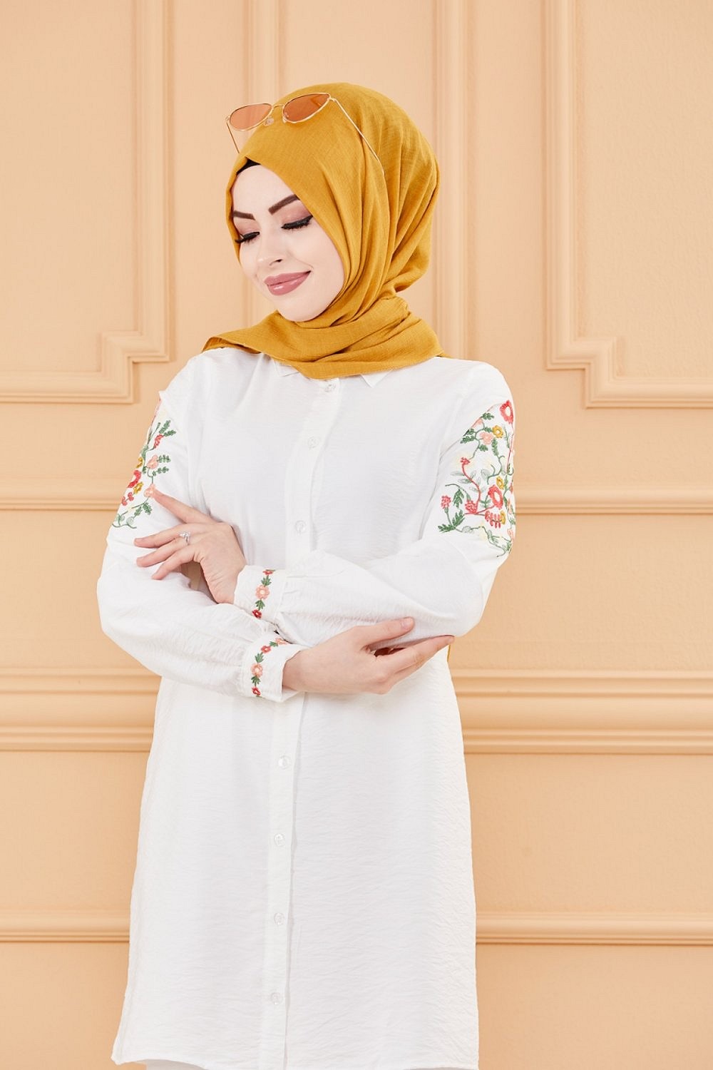 Ensemble femme avec broderies (tunique/chemise et pantalon) - Couleur blanc