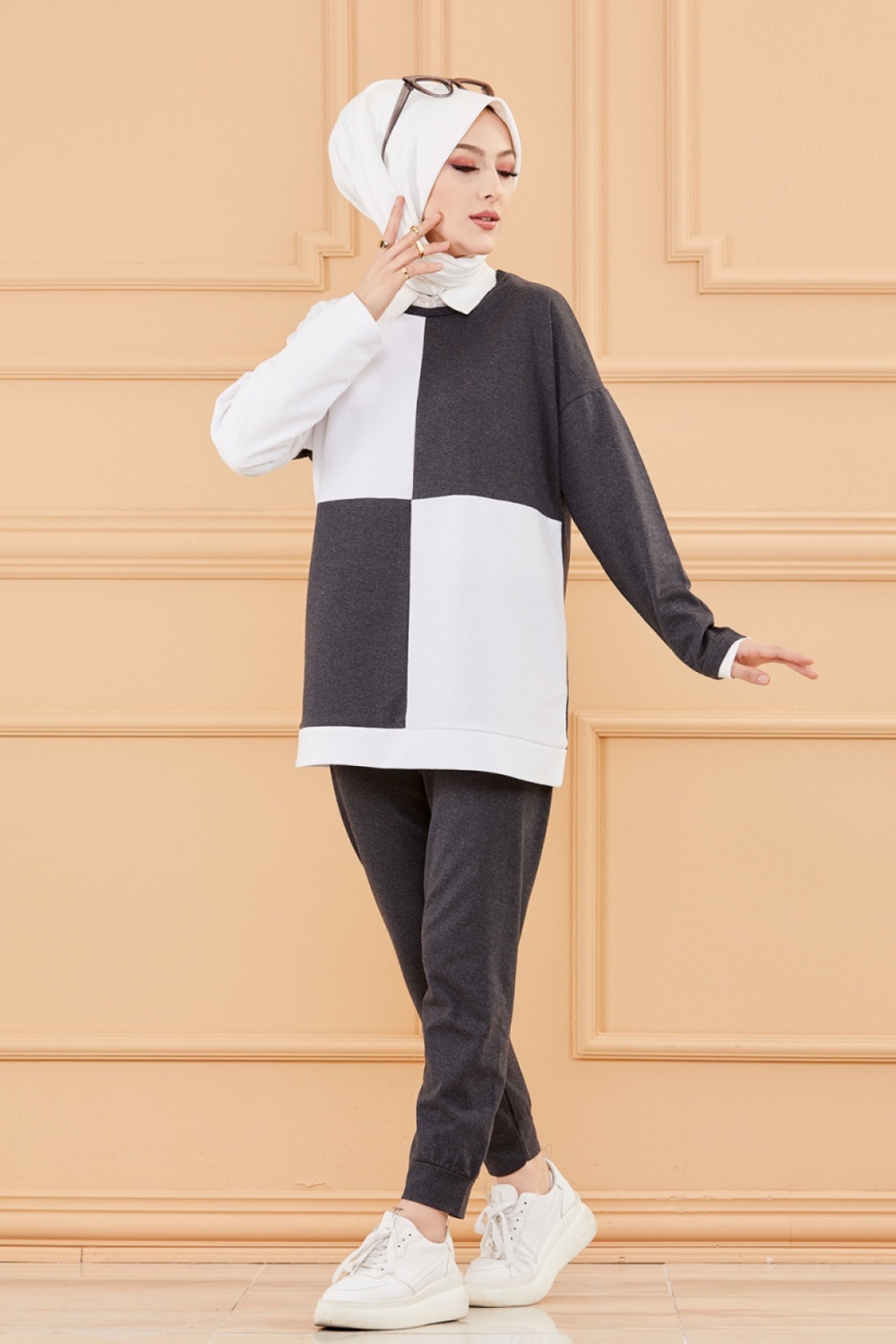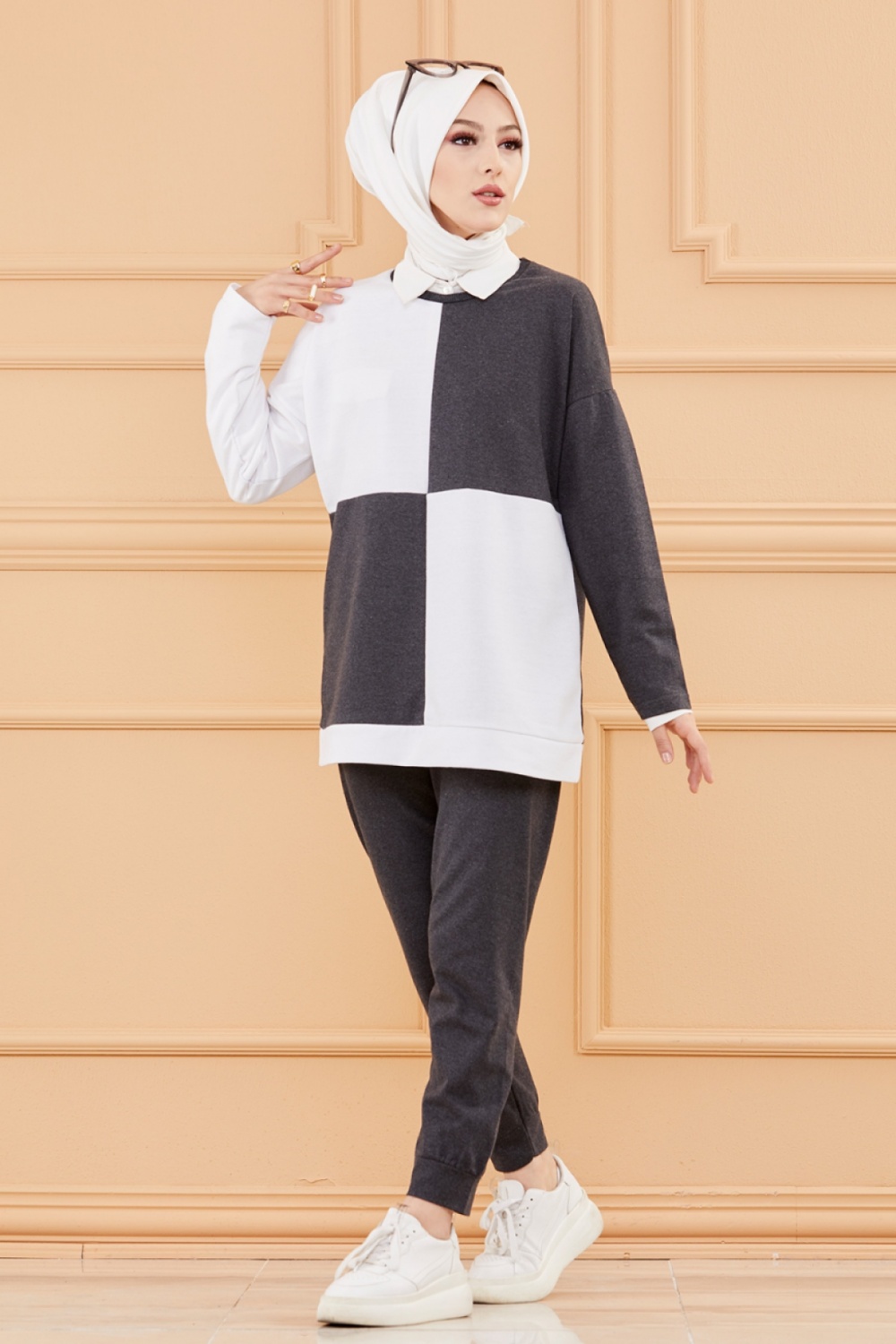 Tenue décontractée deux pièces (Pantalon jogging et Tunique) pour femme voilée - Ensemble sportswear à 3 couleurs : noir, beige et blanc - REF. 32918 (24.90 €)