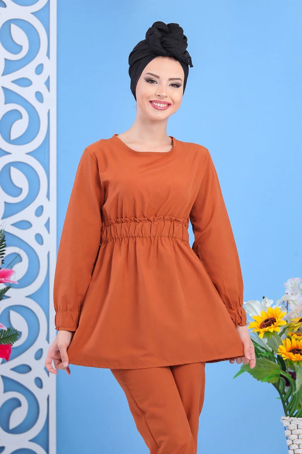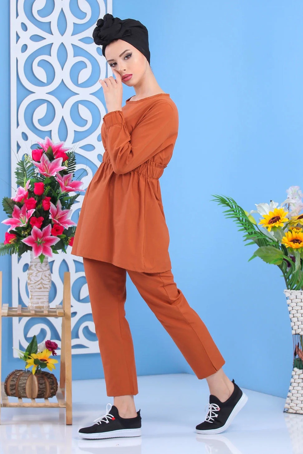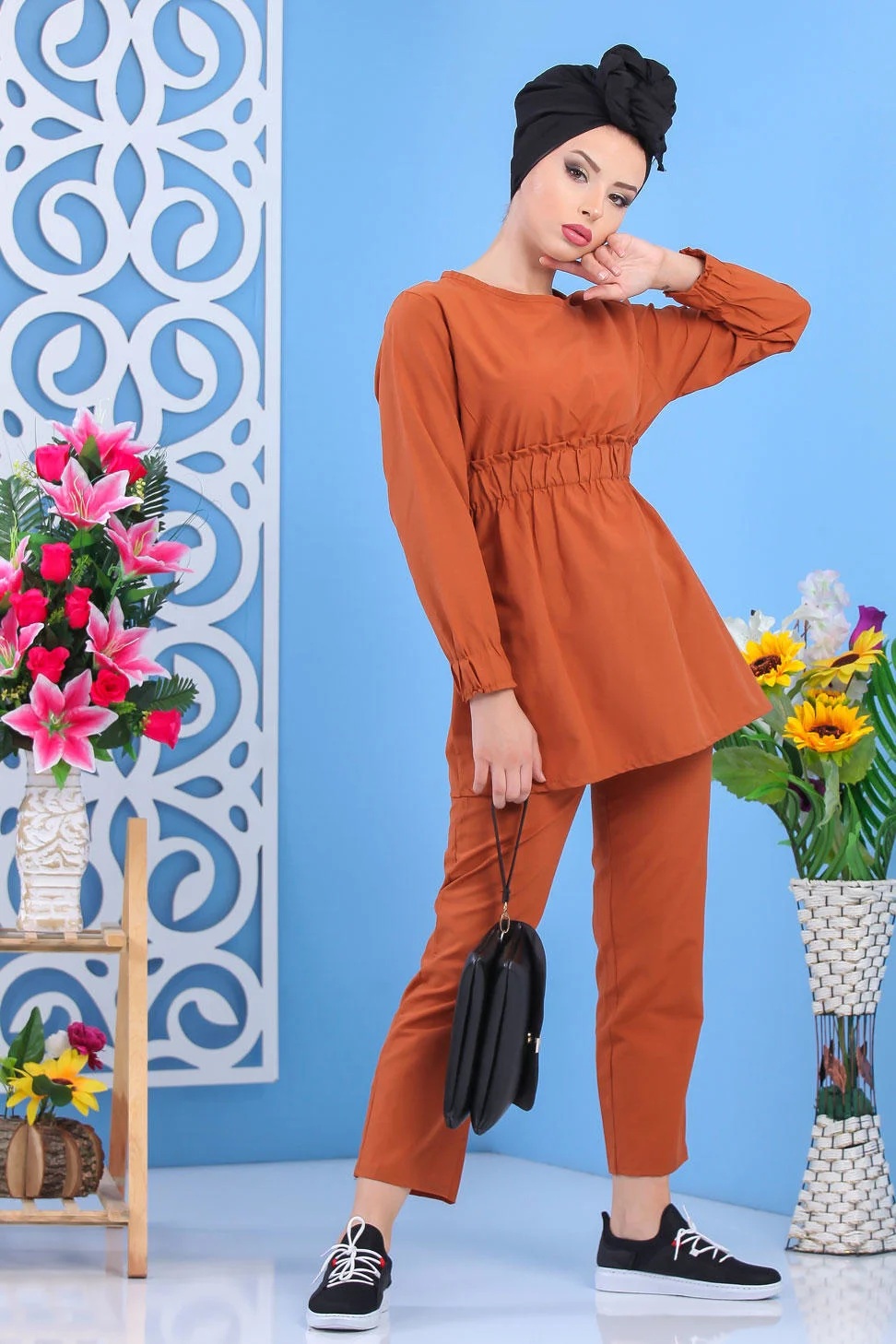 Ensemble casual deux pièces (tunique et pantalon) de couleur rouille.