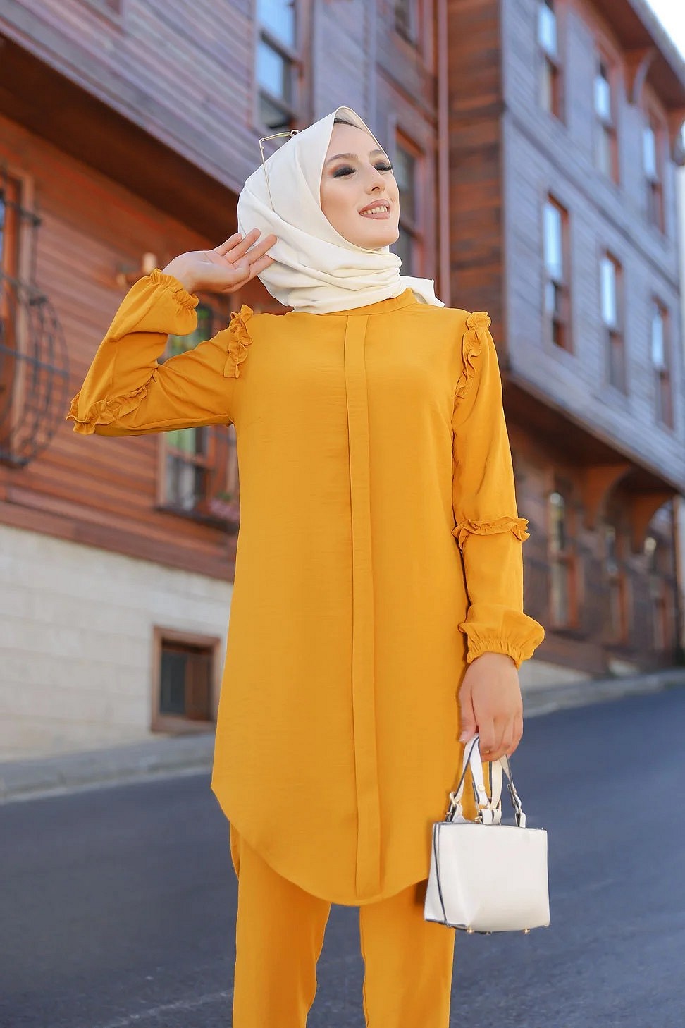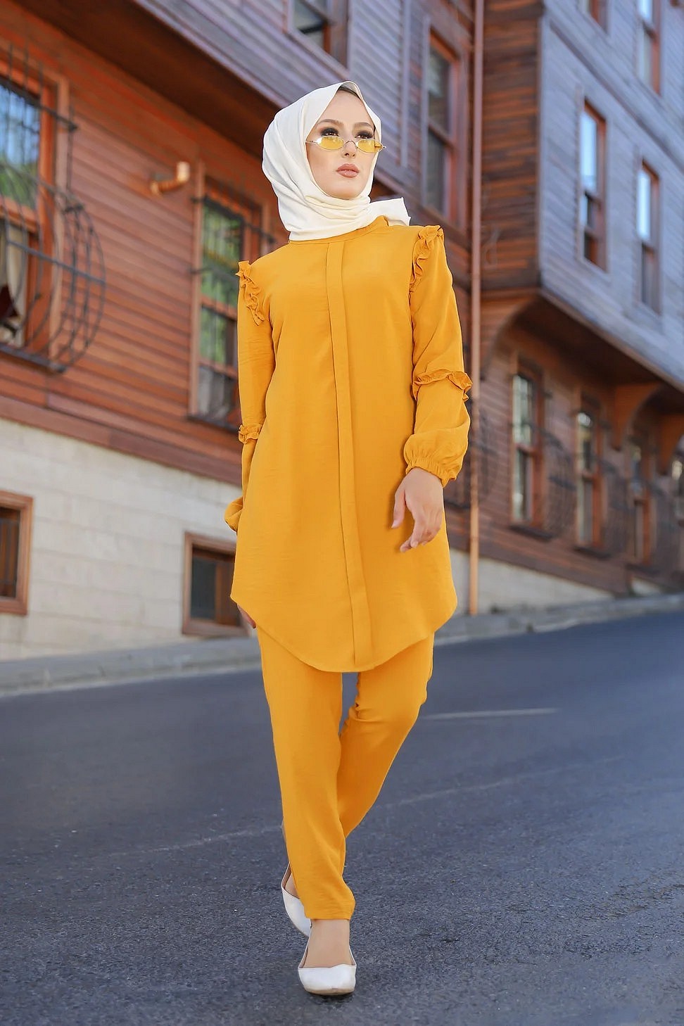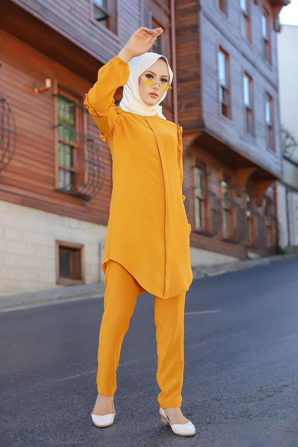 Ensemble femme deux pièces tunique et pantalon (Vetement de ville Hijab mastour) - Jaune moutarde Vetement & Accessoire