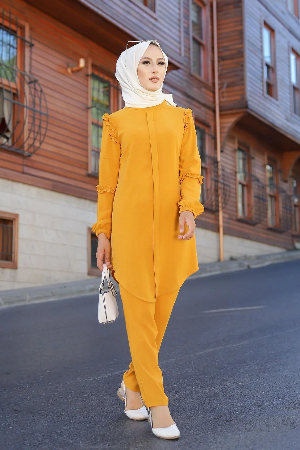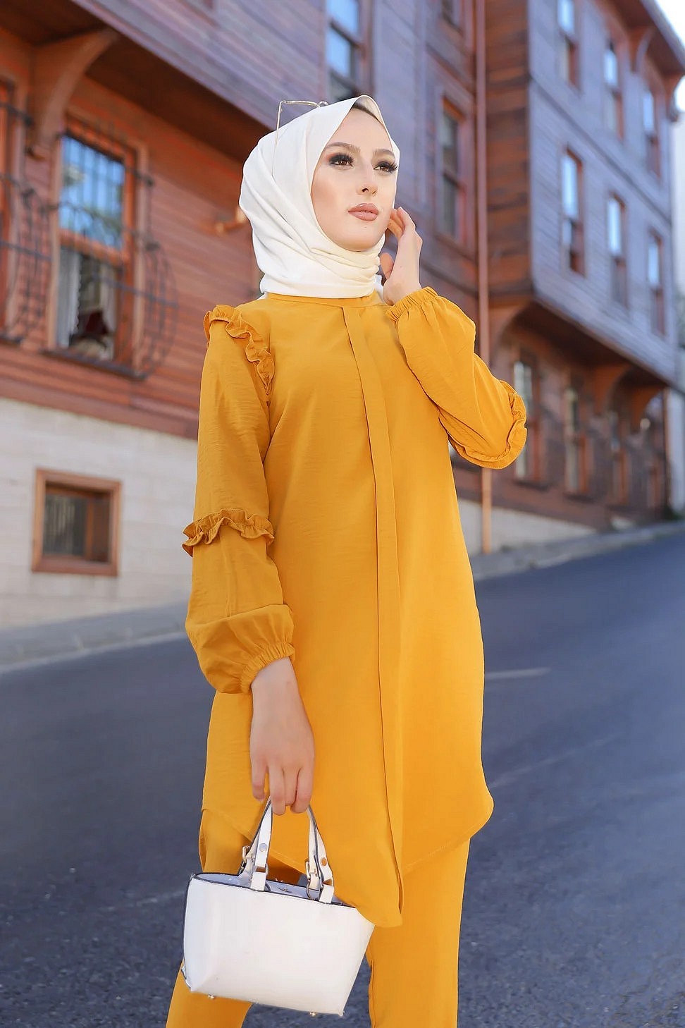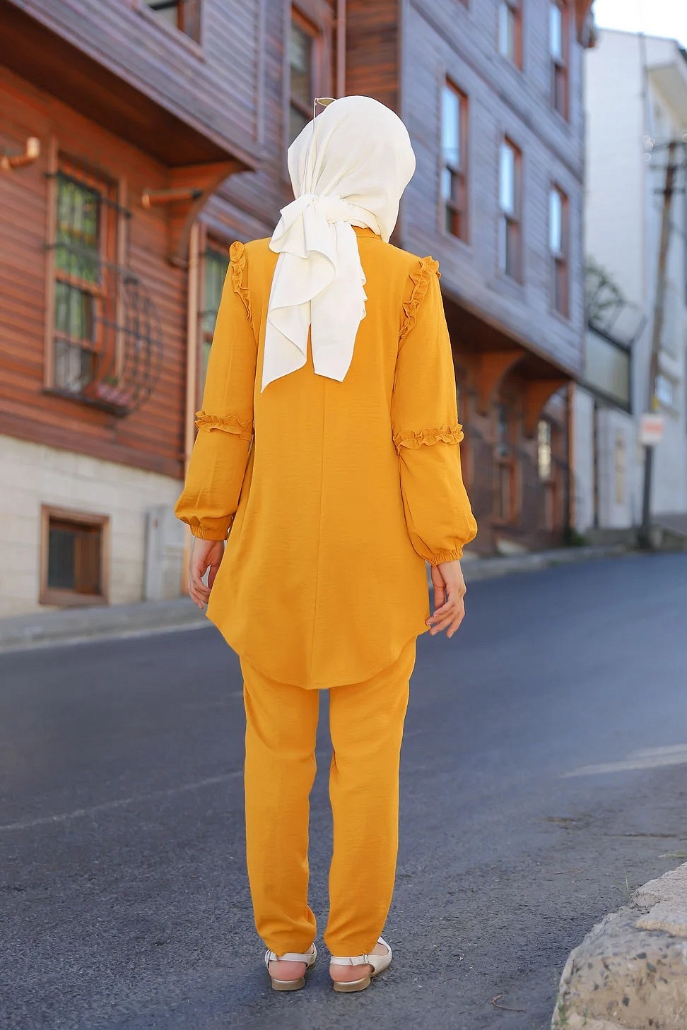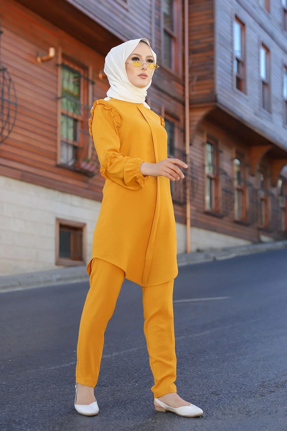 Ensemble femme deux pièces tunique et pantalon (Vetement de ville Hijab mastour) - Jaune moutarde Vetement & Accessoire