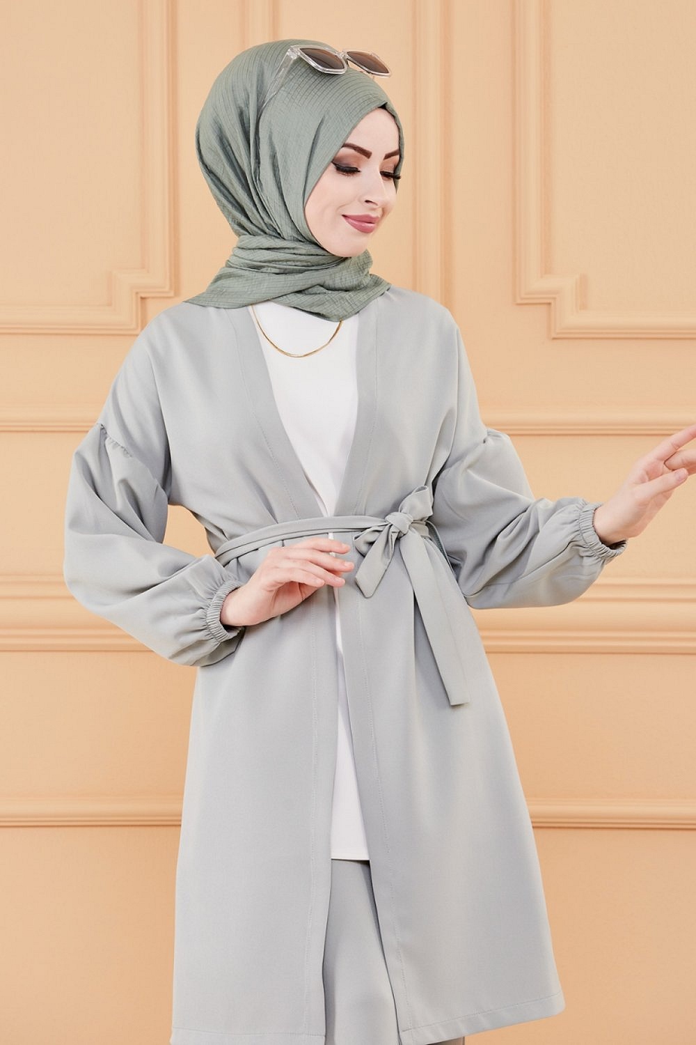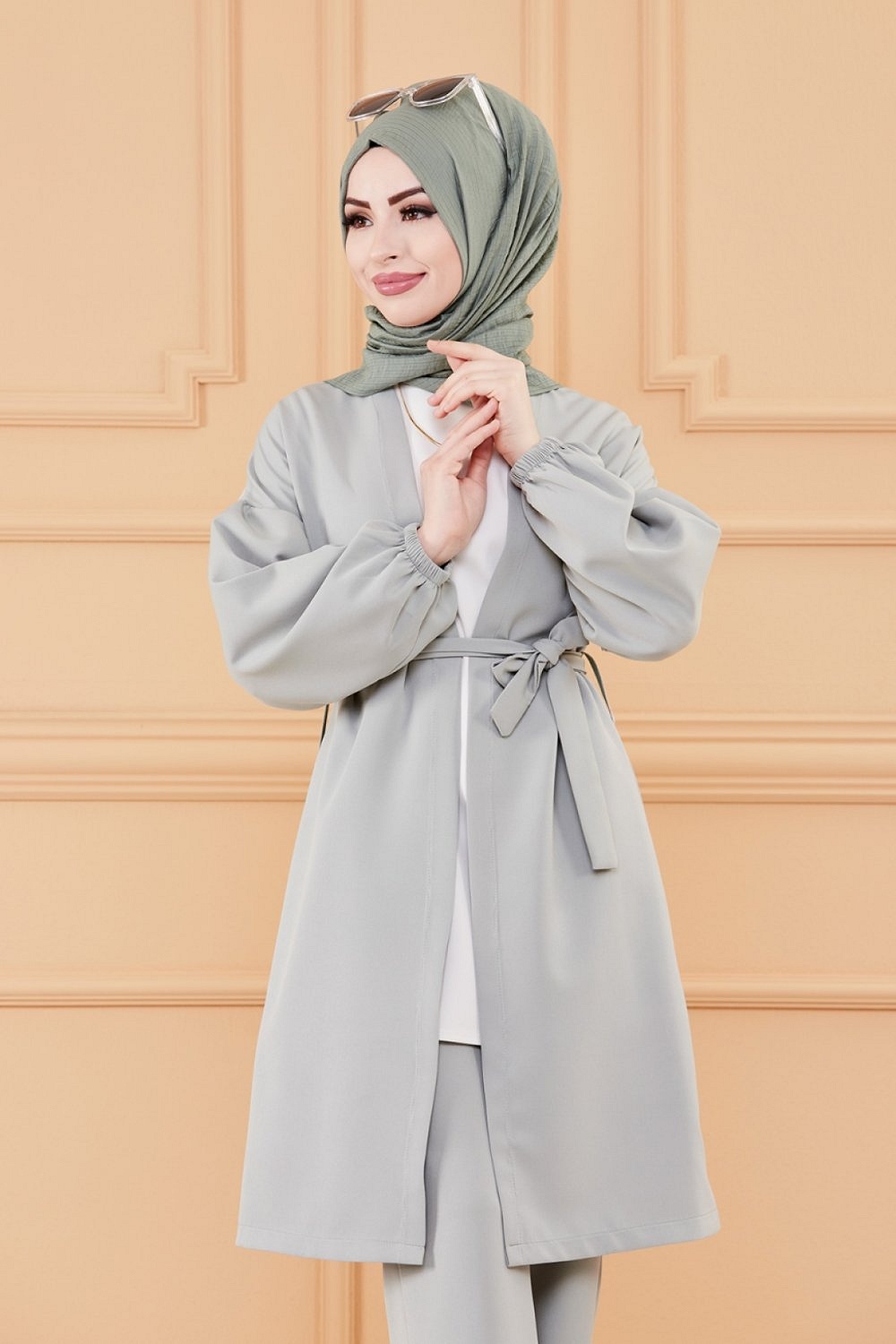 Veste Manteau femme avec ceinture intégrée (Tunique Automne Hiver - Vêtement Hijab Turquie en ligne) - Couleur gris - REF. 35262 (19.90 €)