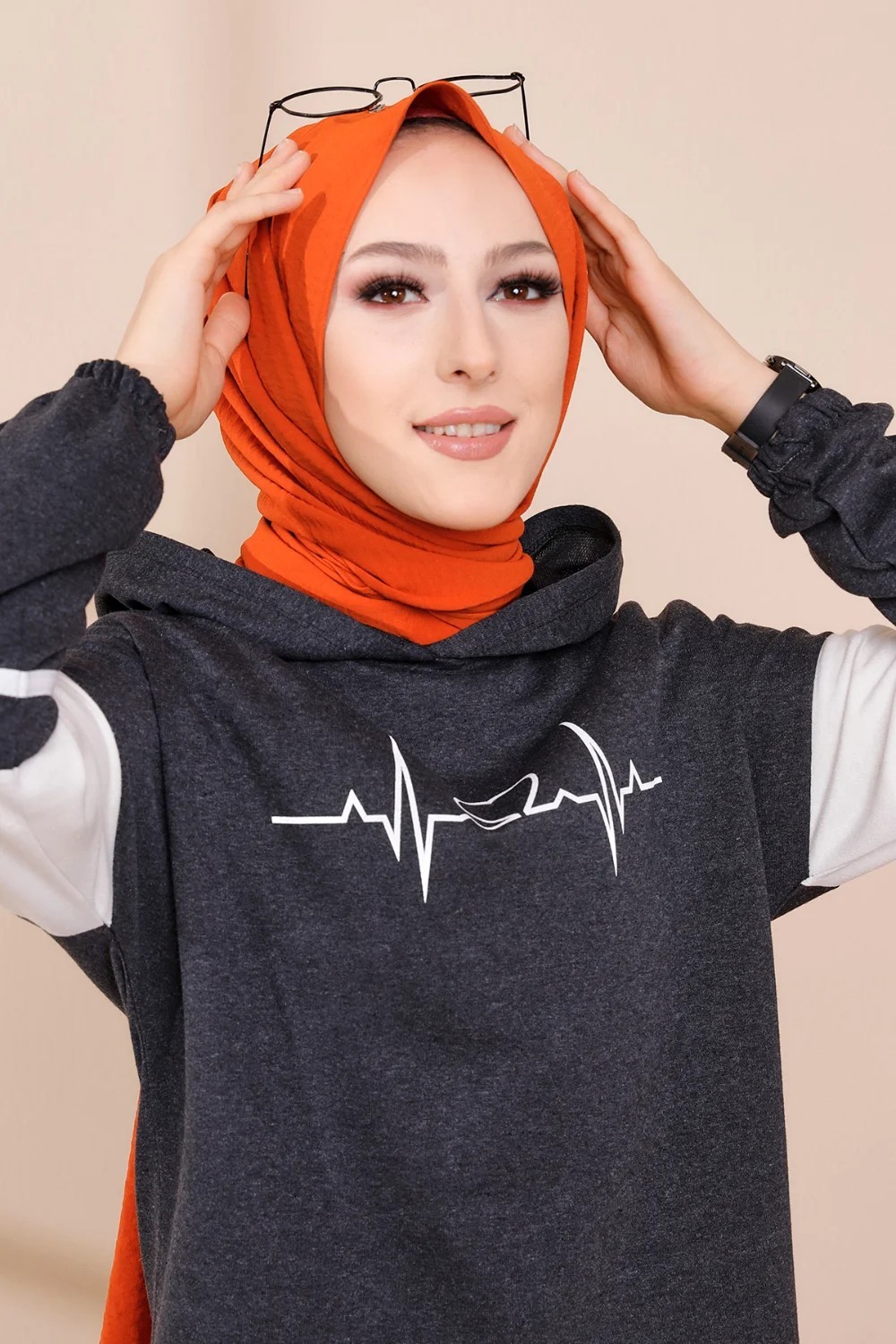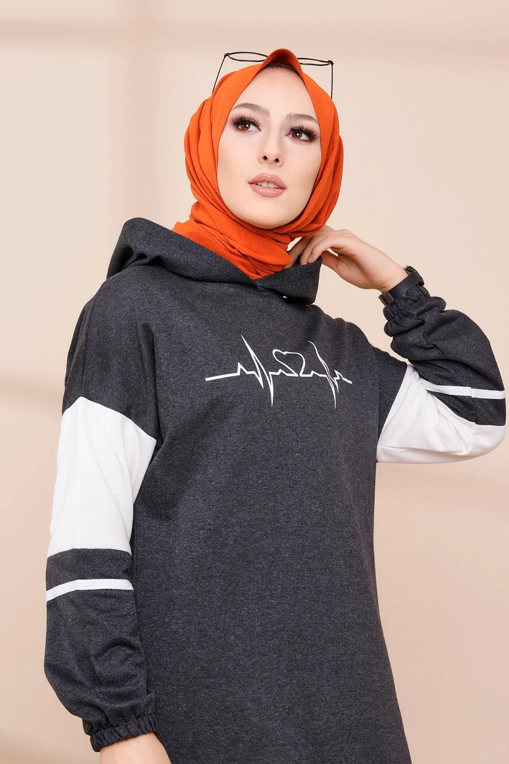 Sweatshirt long avec capuche style moderne décontracté et sport (Vêtement femme musulmane) - Couleur gris foncé - REF. 35365 (19.90 €)