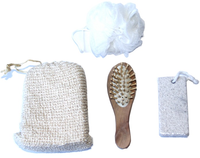 Composé d'une brosse, d'une fleur de douche, d'un gant de toilette et d'une pierre ponce, cet ensemble représente les indispensables d'un bon bain.
