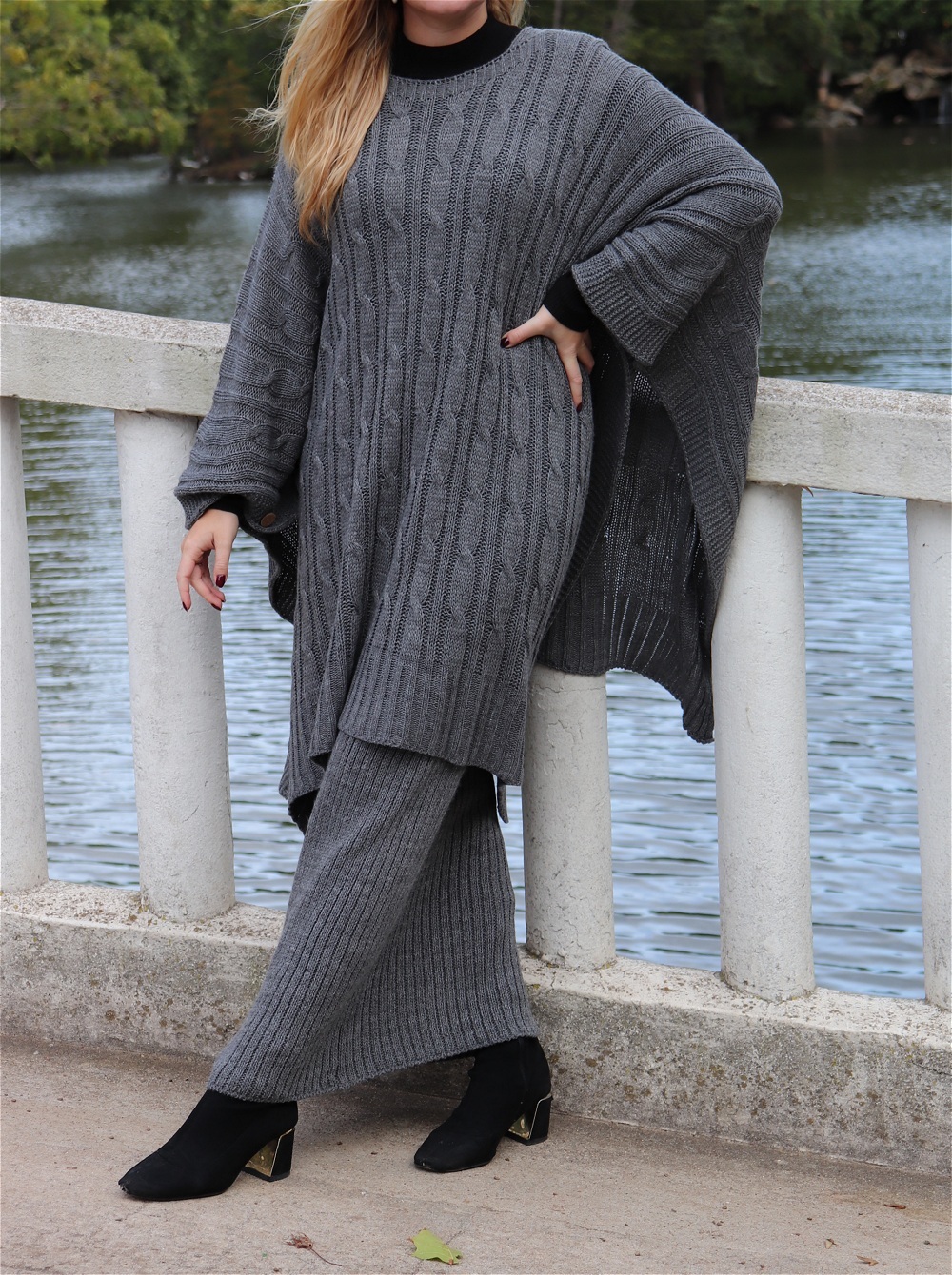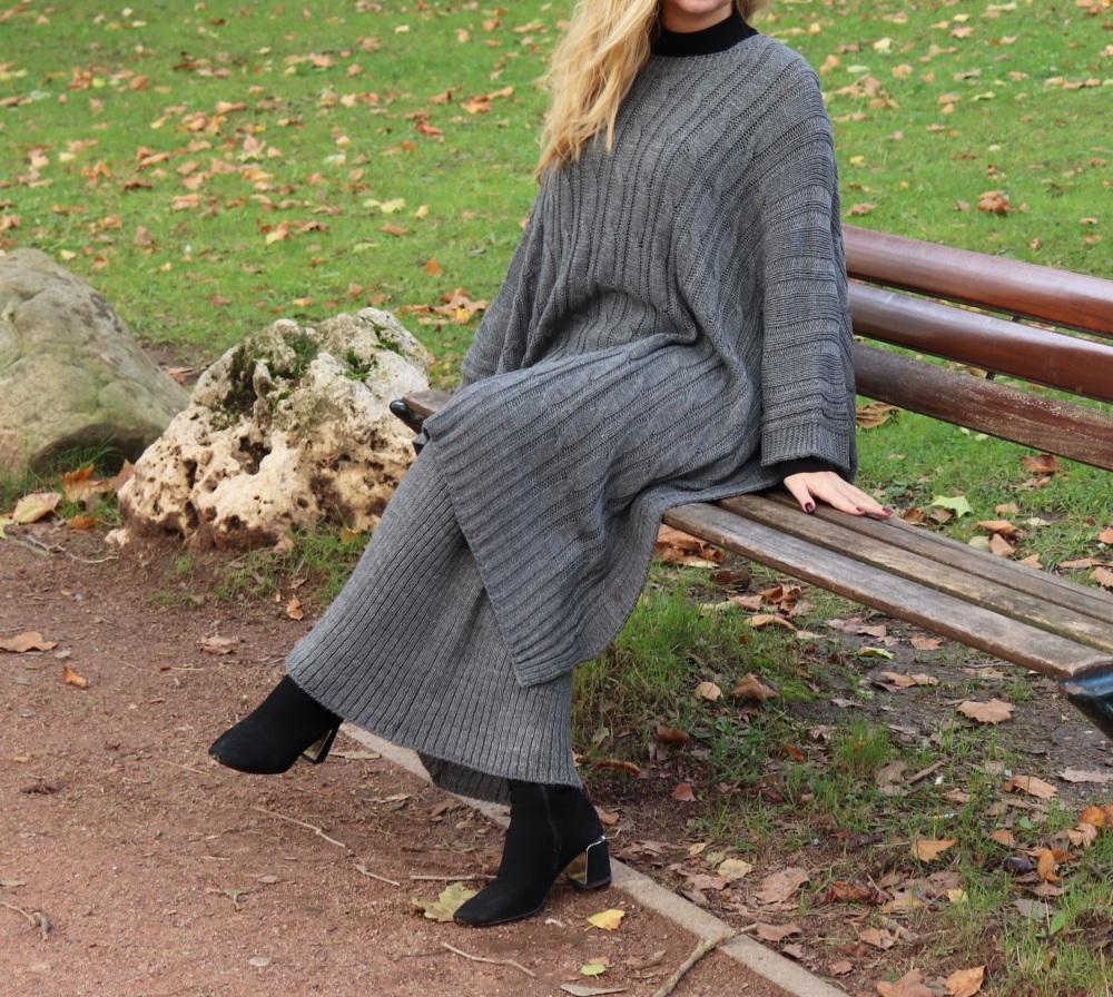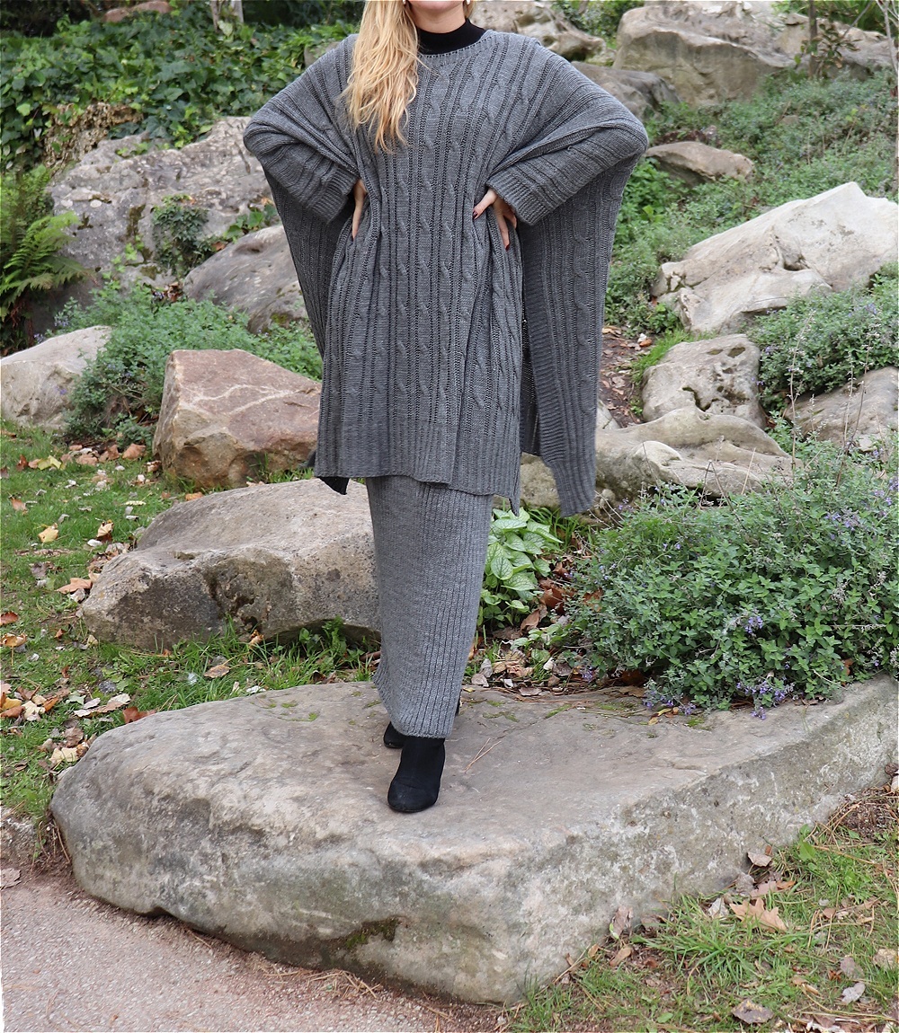 Ensemble robe débardeur, col en V, coupe droite, grosse maille + pull poncho, coupe large, boutons décoratifs au niveau des manches coupées, maille torsadée.