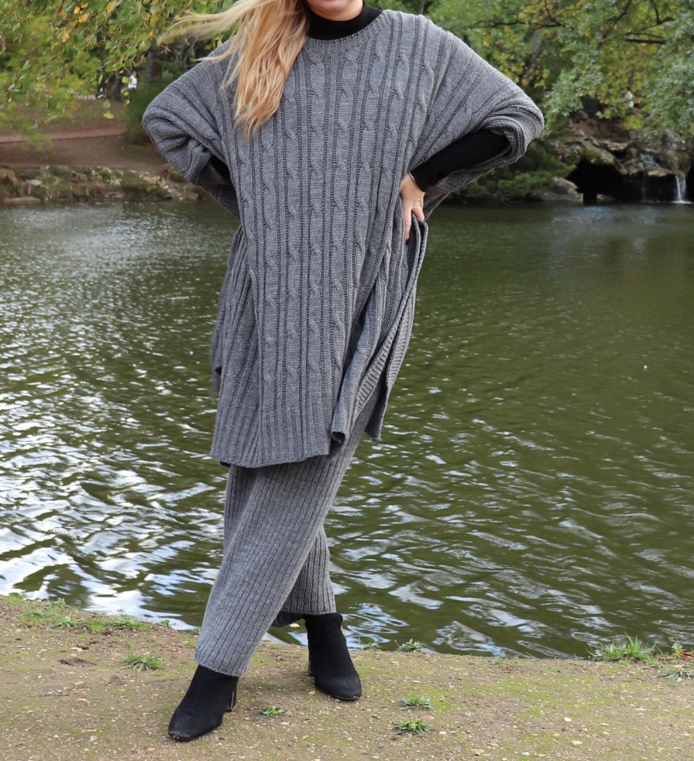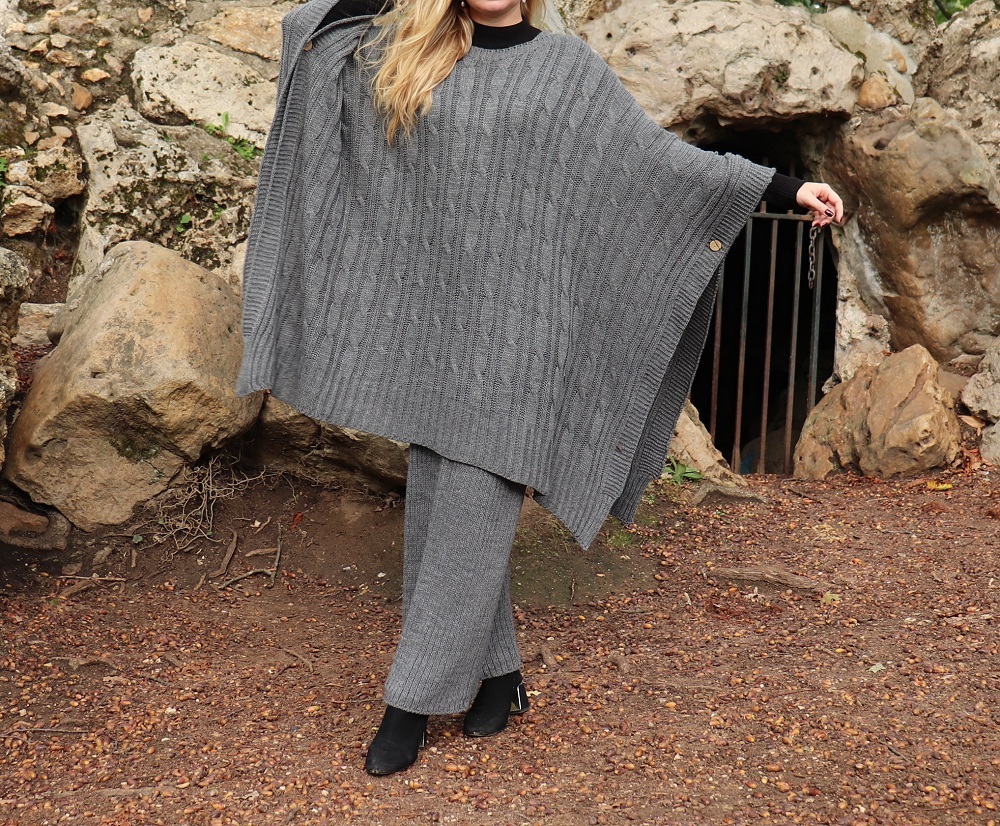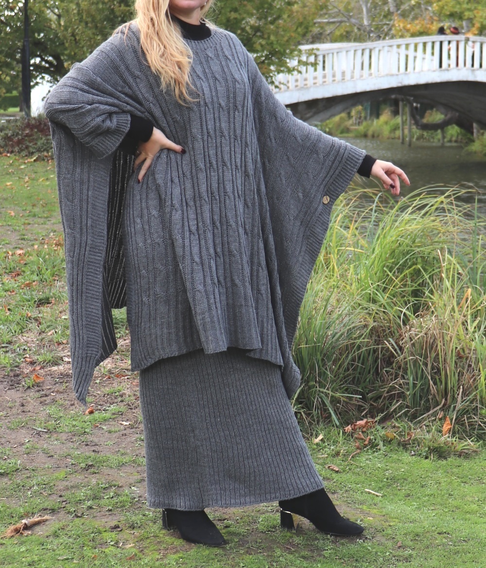 Ensemble robe débardeur, col en V, coupe droite, grosse maille + pull poncho, coupe large, boutons décoratifs au niveau des manches coupées, maille torsadée.