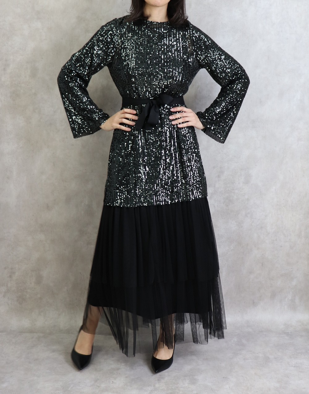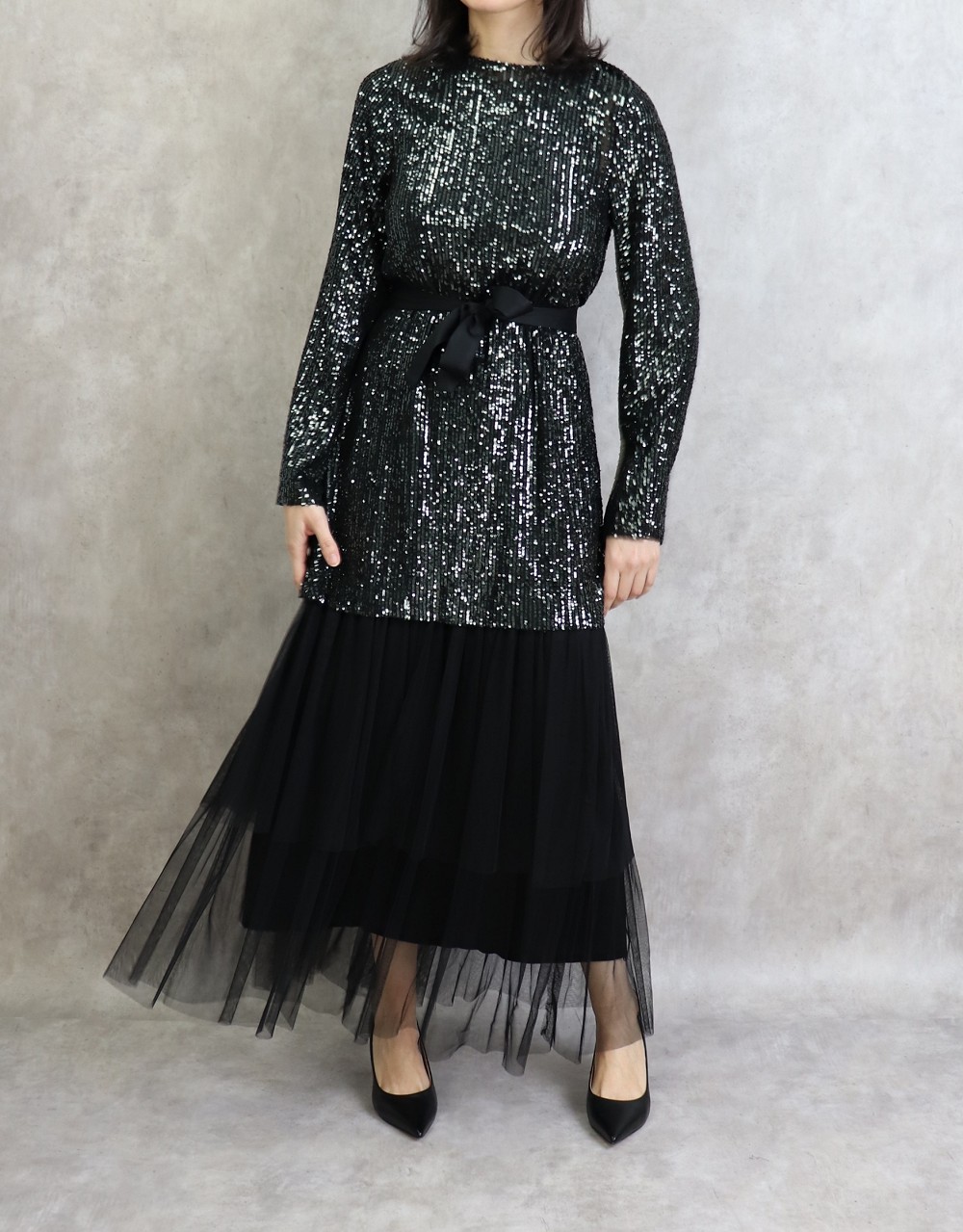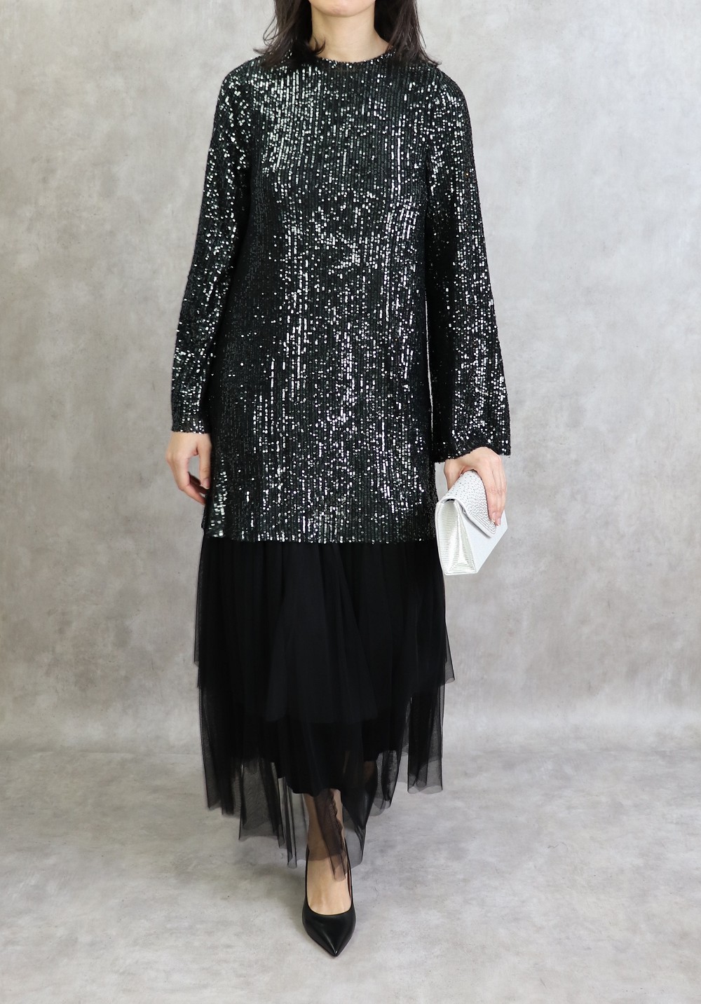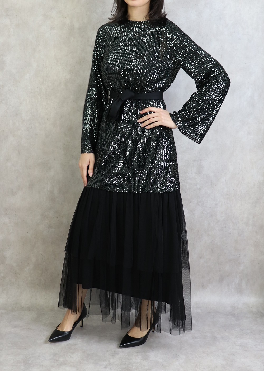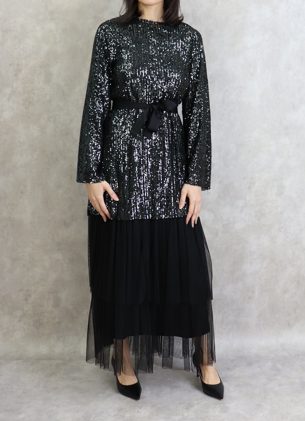 Ensemble soiree 2 pieces pour femme - Robe de fete a strass verts et tulle - Couleur noir
