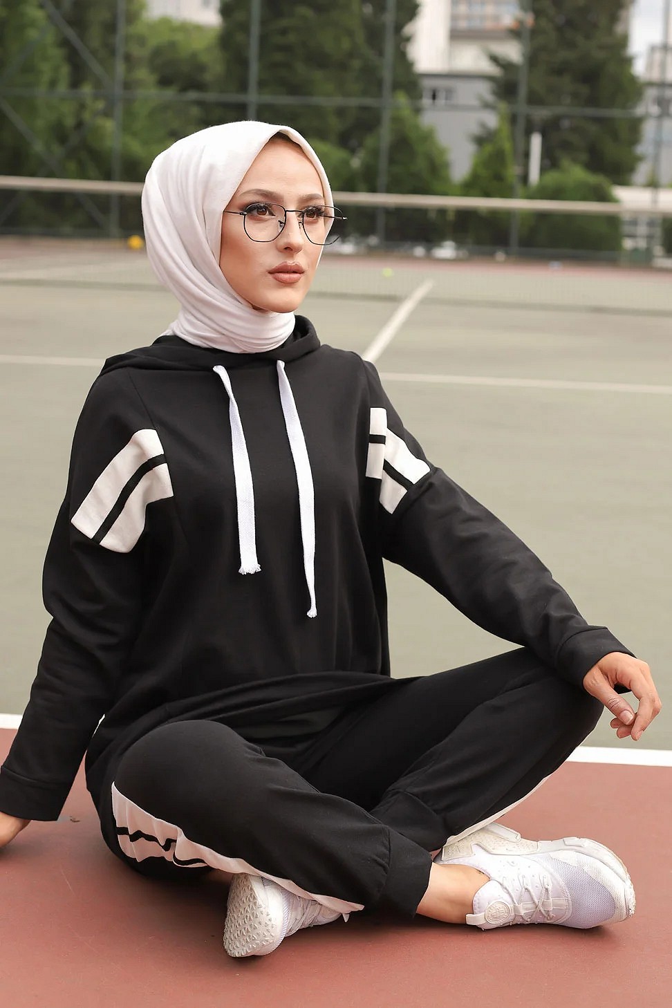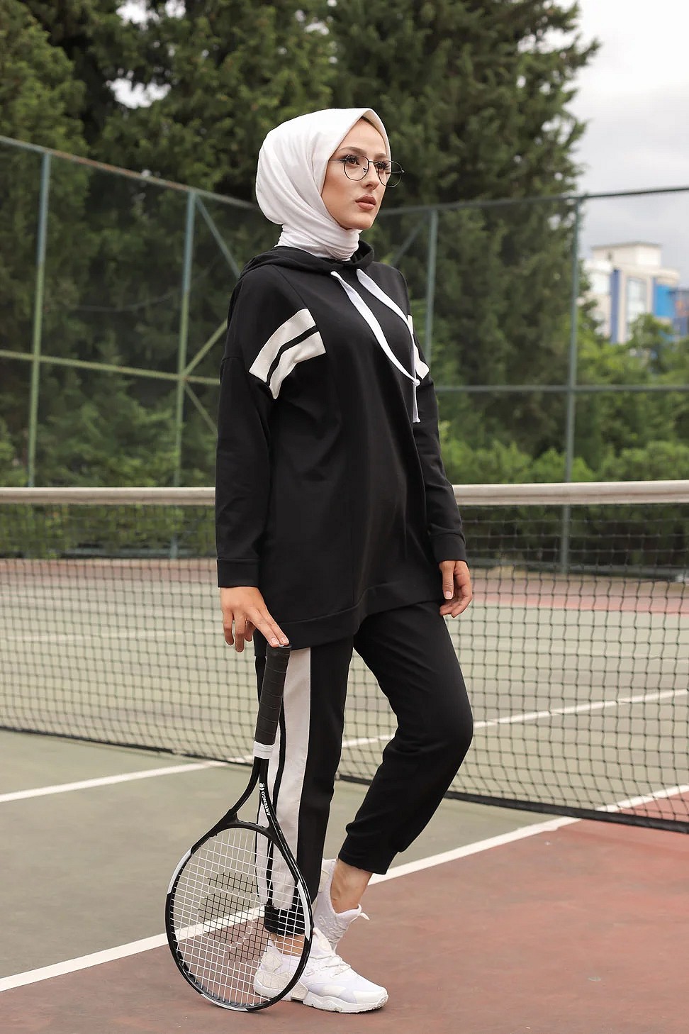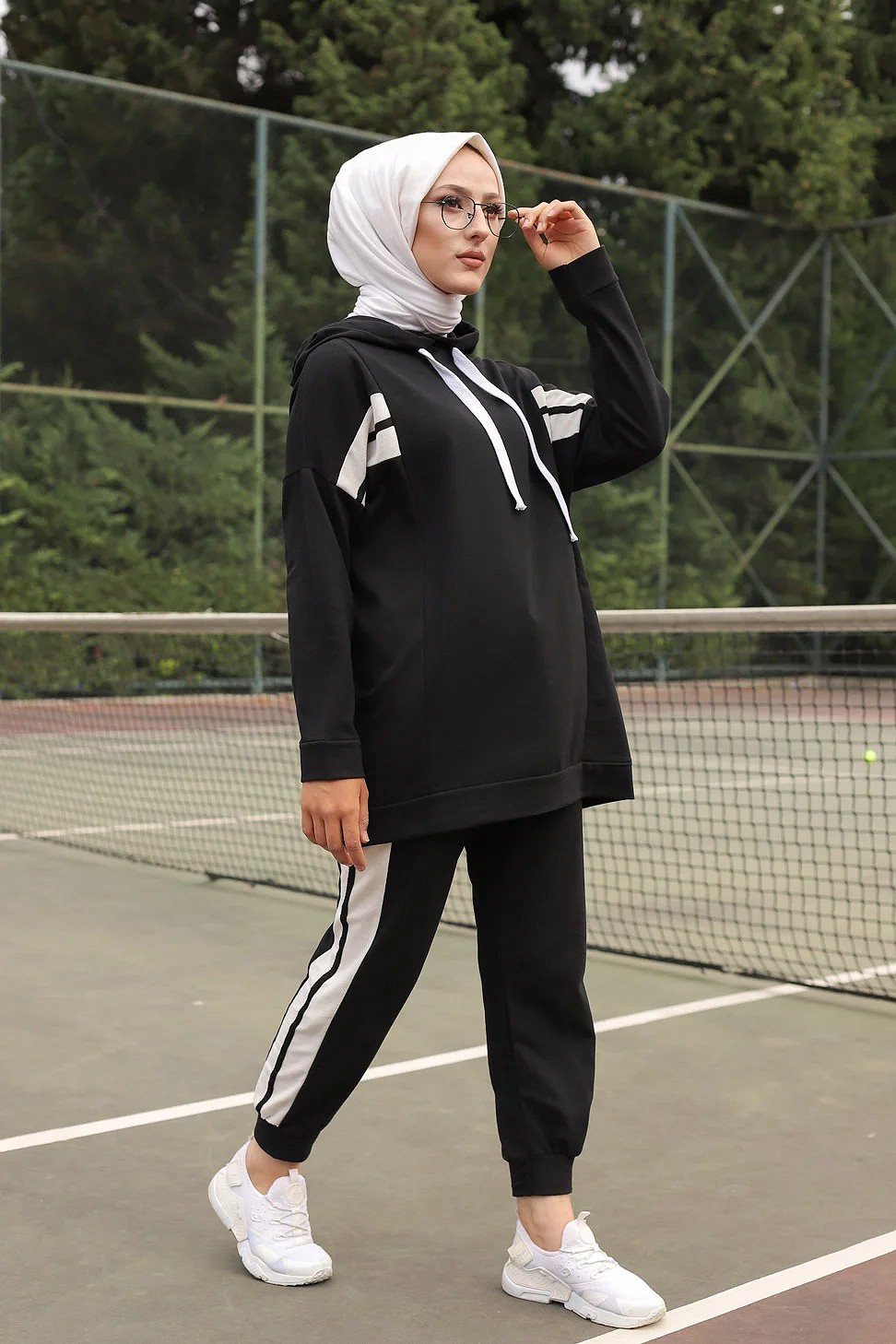 Ensemble survêtement 2 pièces : Sweat à capuche et Jogger - Vetement Sport femme voilée - Couleur blanc et Noir Vetement & Accessoire