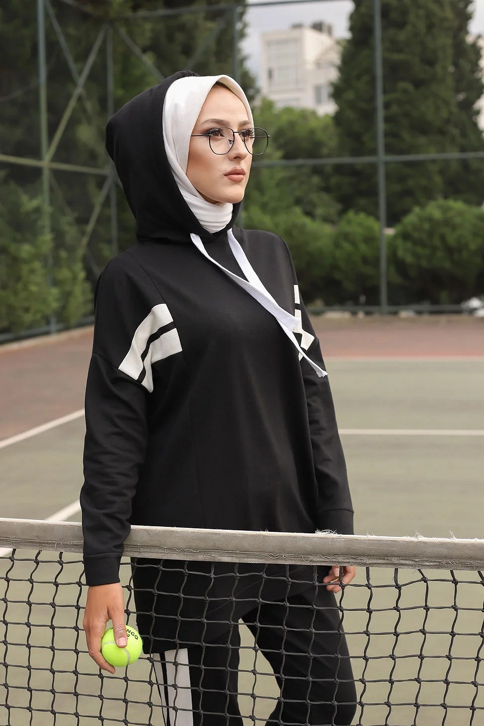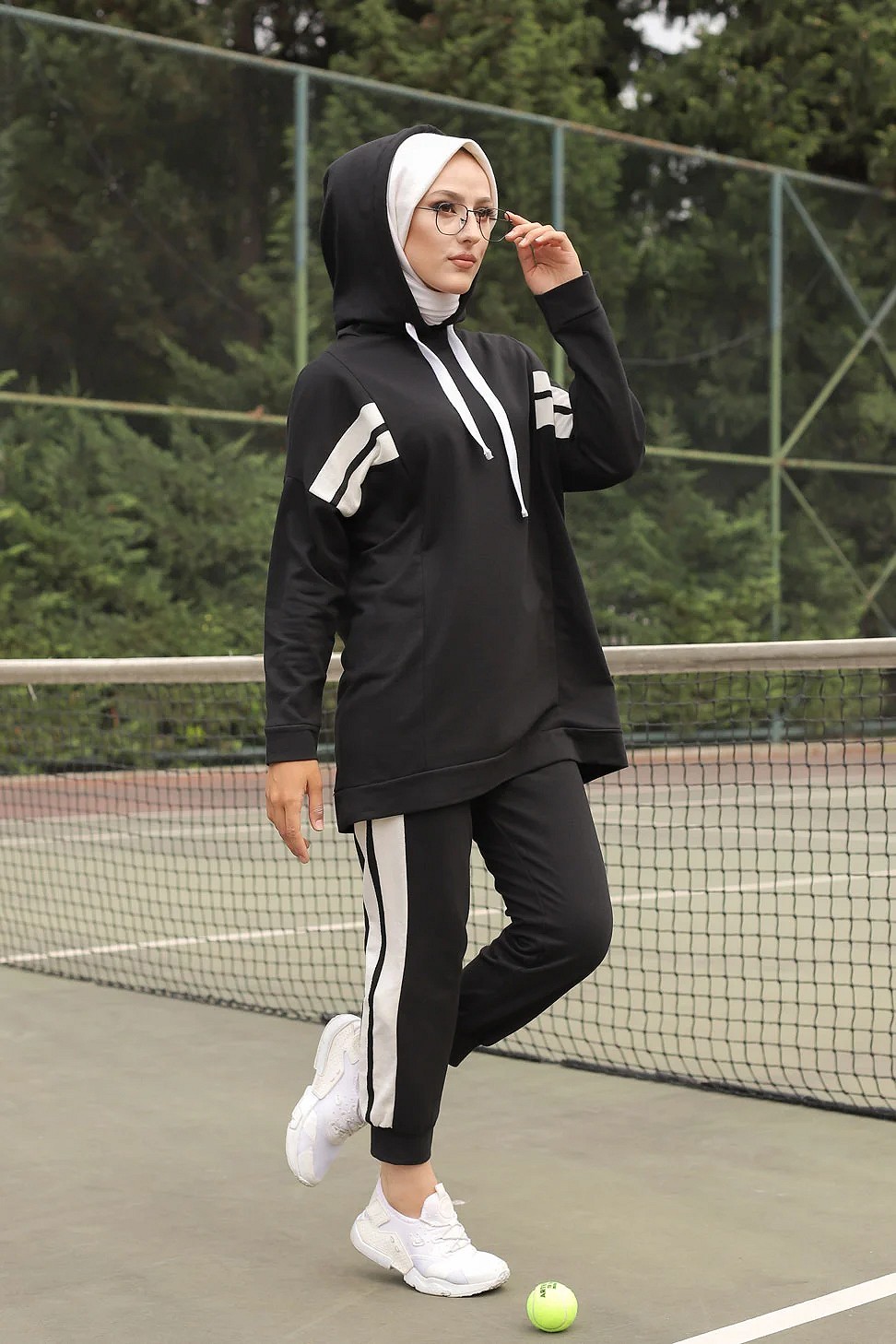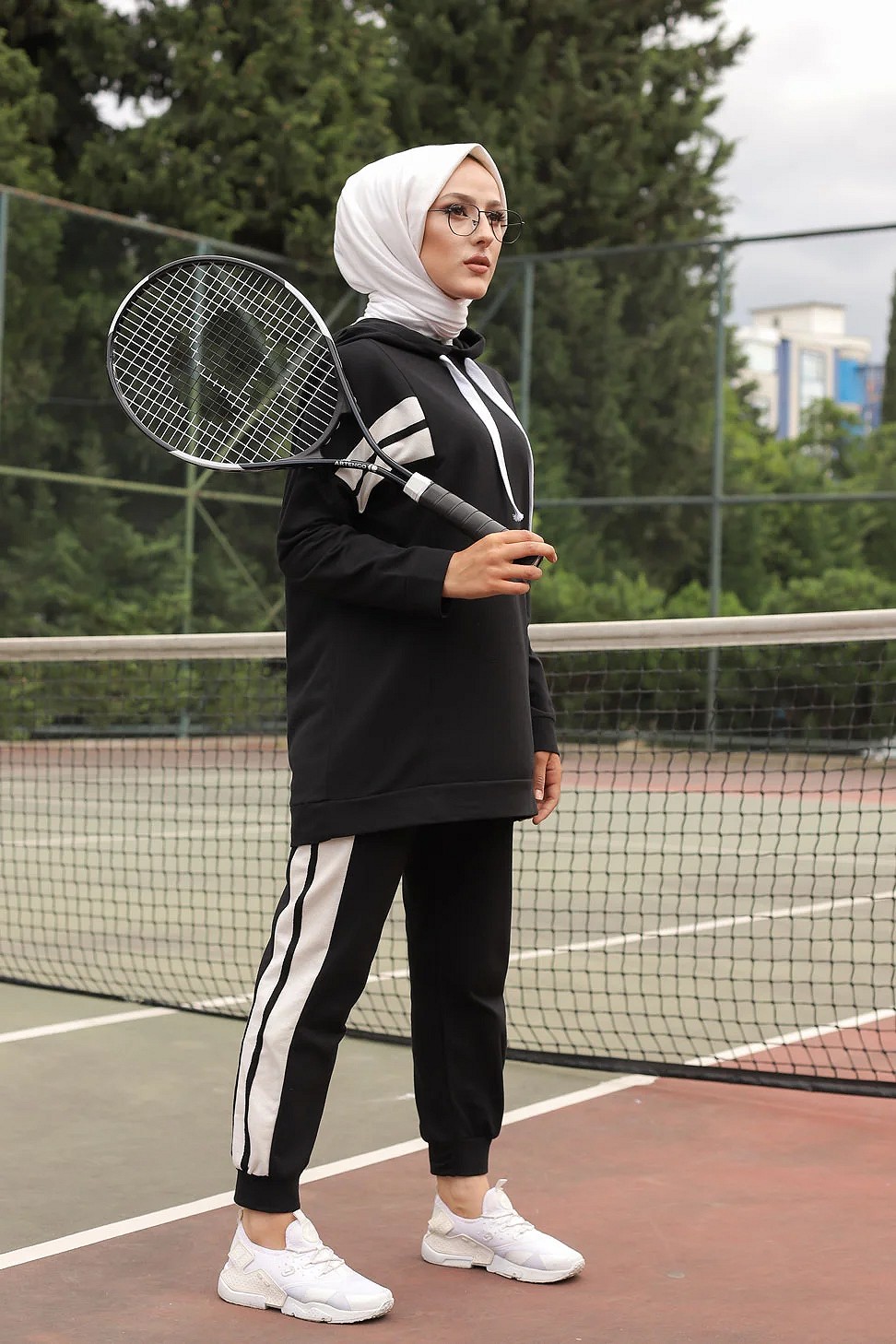Ensemble survêtement 2 pièces : Sweat à capuche et Jogger - Vetement Sport femme voilée - Couleur blanc et Noir Vetement & Accessoire