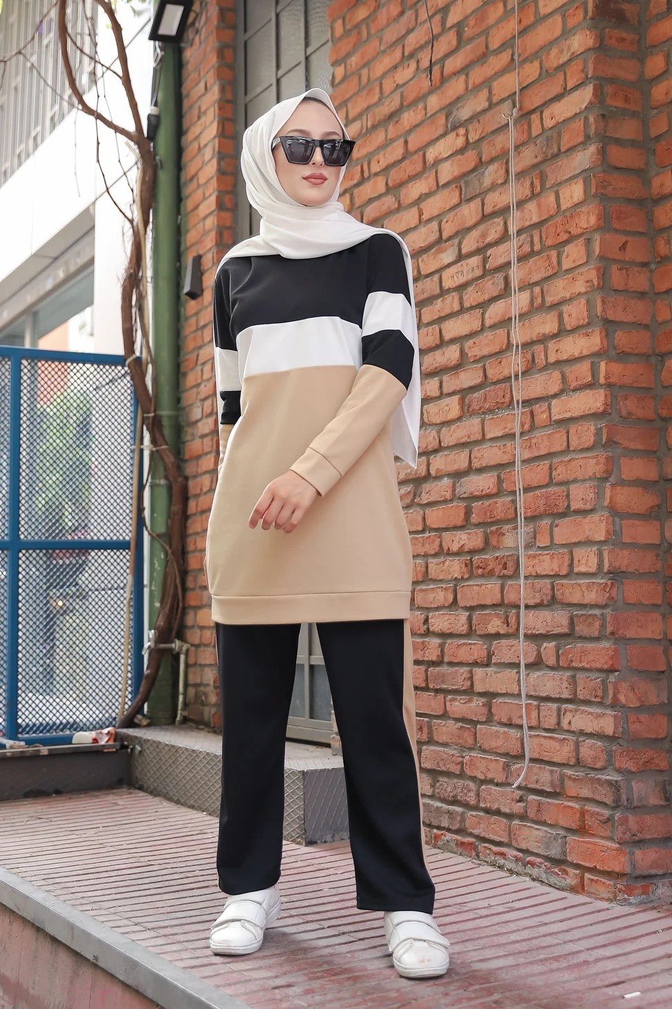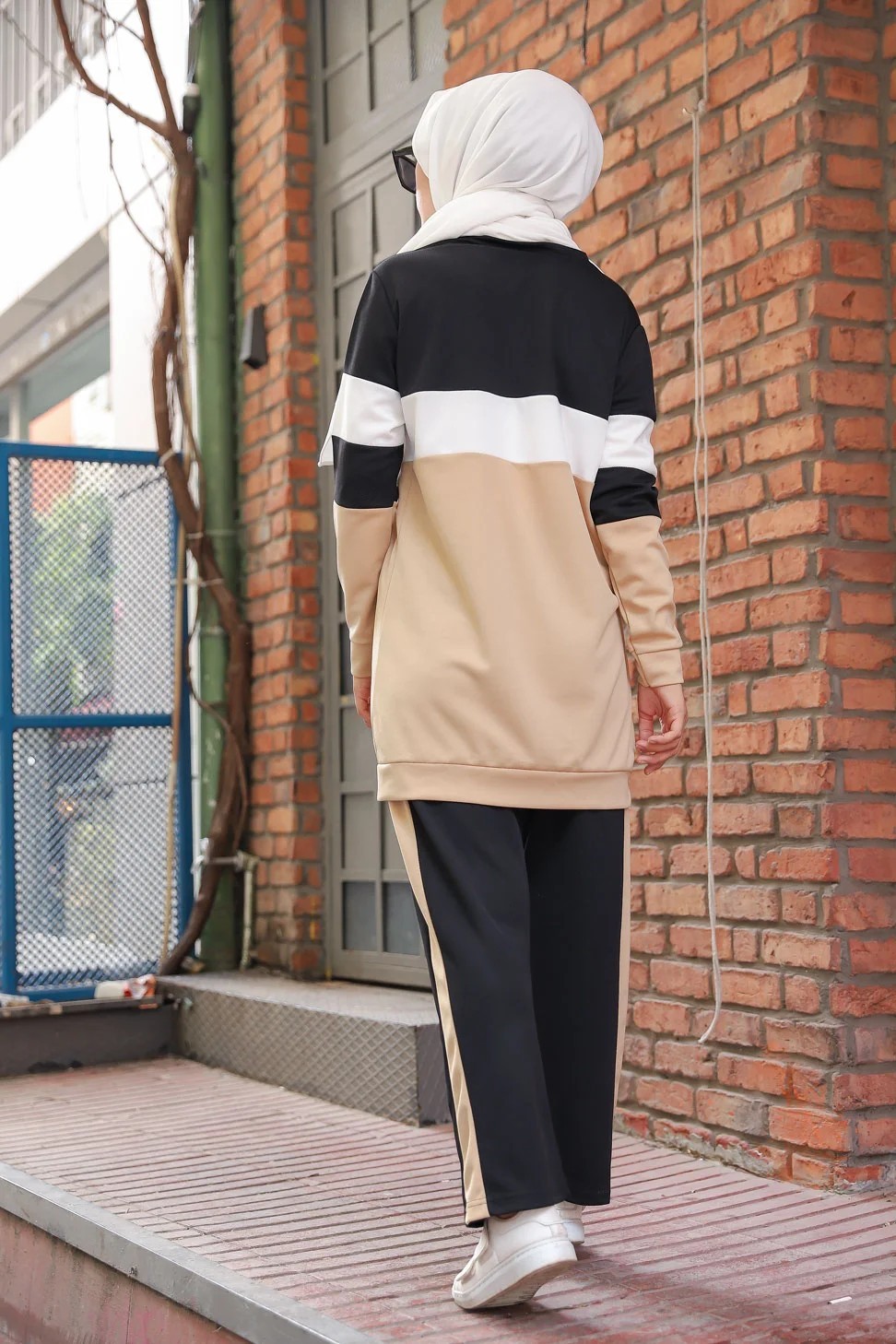 Ensemble survêtement décontracté 2 pièces (haut et bas) de couleur noir et beige (Vêtement turque pour femme) Vetement & Accessoire